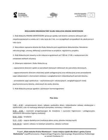 REGULAMIN ORGANIZACYJNY KLUBU MALUCHA KRAINA MONTESSORI 1. Klub Malucha KRAINA MONTESSORI sprawuje opiekę nad dziećmi zarówno zdrowymi jak i niepełnosprawnymi w wieku od 1 roku życia do 3 lat, a w szczególnych przypadkach do ukończenia 4 roku życia. 2. Warunkiem zapisania dziecka do Klubu Malucha jest wypełnienie dokumentów: fomularza rekrutacyjnego, umowy, deklaracji uczestnictwa w projekcie, regulaminu projektu. 3. Klub Malucha jest otwarty w dni robocze w godzinach od 7:00 do 17:00, z wyłączeniem dni ustawowo wolnych od pracy. 4. Głównymi zadaniami Klubu Malucha są: - zapewnienie dzieciom opieki w warunkach bytowych zbliżonych do warunków domowych, - zagwarantowanie dzieciom właściwej opieki pielęgnacyjnej oraz edukacyjnej przez prowadzenie zajęć zabawowych z elemnetami edukacji z uwzględnieniem indywidualnych potrzeb dziecka, - prowadzenie zajęć opiekuńczo – wychowawczych i edukacyjnych, uwzględniających rowój psychomotoryczny dziecka, właściwych do wieku dziecka. 5. Klub Malucha pracuje zgodnie z poniższym harmonogramem: Plan dnia: 7:00 – 8:30 – przyjmowanie dzieci, zabawy swobodne dzieci, indywidualne zabawy edukacyjne z opiekunami, czas na realizację własnych pomysłów, rozmowy z rodzicami 8:30 - 8:50 – czynności przygotowujące do śniadania ( czynności higieniczne i pielęgnacyjne, wdrażanie elementów higieny osobistej) 8:50 – 9:05 – śniadanie 9:15 – 9:45 – zajęcia dydaktyczne (realizacja planu pracy, planów miesięcznych) 9:45-10:15 – spacer, zabawy na świeżym powietrzu, zabawy ruchowe Projekt „Klub malucha Kraina Montessori – nowe miejsca opieki dla dzieci z gminy Czarna Białostocka” współfinansowany z Regionalnego Programu Operacyjnego Województwa Podlaskiego w ramach Działania 2.2 10:15-10:30 – czynności przygotowujące do zupy 10:30-11:00 – zupa 11:00-11:10 – mycie zębów 11:10-13:10 – leżakowanie, czas na sen 13:10 – 13:30 – czynności przygotowujące do II dania (obiad) 13:30 – 14:00 – II danie (obiad) 14:00 – 14:30 – zajęcia dodatkowe 14:30-15:00 – zabawy swobodne 15:00-15:30 – czynności przygotowujące do podwieczorka, podwieczorek 15:30-17:00 – zabawy swobodne, rozchodzenie się dzieci do domu, rozmowy z rodzicami 6. Klub Malucha zapewnia wyżywienie cateringowe dla dzieci. 7. W klubie dziecięcym występują następujące miejsca pracy: - Kierownik; - Opiekun dziecięcy (1 na pięcioro dzieci); 8. Do zadań Kierownika należy: - sprawowanie nadzoru nad pracownikami, - prowadzenie dokumentacji dzieci uczęszczających do Klubu Malucha, - reprezentowanie klubu na zewnątrz, - organizowanie pracy klubu. 9. Do zadań opiekuna dziecięcego należy: - sprawowanie opieki nad grupą dzieci, - przygotowywanie, organizowanie i prowadzenie zajęć z grupą dzieci, - dbanie o bezpieczeństwo podopiecznych, - stosowanie zabiegów pielęgnacyjnych i higienicznych wobec podopiecznych, - informowanie rodziców o zaobserwowanych postępach i nieprawidłowościach w rozwoju podopiecznych, Projekt „Klub malucha Kraina Montessori – nowe miejsca opieki dla dzieci z gminy Czarna Białostocka” współfinansowany z Regionalnego Programu Operacyjnego Województwa Podlaskiego w ramach Działania 2.2 - pomoc podopiecznym podczas spożywania posiłków, - zabawa z podopiecznymi, - utrzymywanie miejsca pracy w należytym porządku. 10. Rodzice dziecka mają prawo do: - uzyskiwania na bieżąco rzetelnej informacji na temat postępów, sukcesów i niepowodzeń swojego dziecka, - uzyskiwania porad i wskazówek od opiekunów w rozpoznawaniu przyczyn trudności wychowawczych oraz doborze metod udzielania dziecku pomocy; - wyrażania i przekazywania pracownikom opinii na temat pracy klubu dziecięcego i opieki pełnionej nad dzieckiem; 11. Do podstawowych obowiązków rodziców dziecka należy: - przestrzeganie postanowień statutu i regulaminu klubu oraz zawartej umowy; - przyprowadzanie i odbieranie dziecka w godzinach pracy; rodzic lub upoważniona osoba powinna zgłosić się po dziecko najpóźniej o godz.17.00; - przynoszenie ubrań na zmianę oraz środków do pielęgnacji dziecka, - terminowe uiszczanie płatności; - informowanie o przyczynach nieobecności dziecka; - informowanie o wszelkich zmianach dotyczących miejsca zamieszkania, numeru telefonu, oraz innych ważnych danych na temat dziecka; - niezwłoczne zawiadamianie o zdiagnozowanych zatruciach pokarmowych i chorobach zakaźnych; 12. Formy współpracy z rodzicami, realizowane przez Klub Malucha to: - kontakt mailowy - przekazywanie bieżących informacji na temat funkcjonowania Klubu Malucha; - tablica ogłoszeń; - zebrania; - dni adaptacyjne - wspólne przebywanie w klubie dzieci i Rodziców; - kontakty indywidualne z Rodzicami; Projekt „Klub malucha Kraina Montessori – nowe miejsca opieki dla dzieci z gminy Czarna Białostocka” współfinansowany z Regionalnego Programu Operacyjnego Województwa Podlaskiego w ramach Działania 2.2 - spotkania integracyjne, świętowanie ważnych dat, np. Święto Rodziny; 13. Dzieci powinny być przyprowadzane i odbierane osobiście przez rodziców/prawnych opiekunów), bądź inne osoby (pełnoletnie, za okazaniem dokumentu tożsamości) upoważnione przez rodziców. Pisemne upoważnienie do odbierania dziecka przez inną osobę niż rodzic/prawny opiekun należy złożyć osobiście. 14. Rodzice/prawni opiekunowie przejmują pełną odpowiedzialność prawną za bezpieczeństwo dziecka w momencie odebrania dziecka z sali również w przypadku, gdy dziecko odbierane jest przez upoważnioną przez nich osobę. 15. W przypadku choroby dziecka klub nie zapewnia opieki. 16. Jeśli choroba zostanie stwierdzona w trakcie pobytu dziecka w klubie, rodzice są zobowiązani niezwłocznie odebrać dziecko z klubu. 17. Personel nie może podawać dzieciom żadnych leków, ani suplementów diety, ani stosować żadnych zabiegów medycznych, poza przypadkiem bezpośredniego ratowania życia. 18
