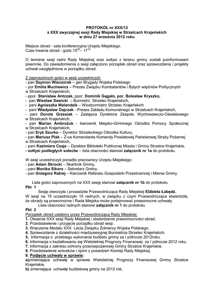 PROTOKÓŁ nr XXX/12 z XXX zwyczajnej sesji Rady Miejskiej w Strzelcach Krajeńskich w dniu 27 września 2012 roku Miejsce obrad - sala konferencyjna Urzędu Miejskiego. Czas trwania obrad - godz.1500– 1710 O terminie sesji radni Rady Miejskiej oraz sołtysi z terenu gminy zostali poinformowani pisemnie. Do zawiadomienia o sesji załączono porządek obrad oraz sprawozdania i projekty uchwał uwzględnione w porządku obrad. Z zaproszonych gości w sesji uczestniczyli: - pan Szymon Wieczorek – gen Brygady Wojska Polskiego - por Emilia Muchewicz – Prezes Związku Kombatantów i Byłych więźniów Politycznych w Strzelcach Krajeńskich, - ppor. Stanisław Antczak, ppor. Dominik Gągało, por. Bolesław Kryszko, - pan Wiesław Sawicki – Burmistrz Strzelec Krajeńskich, - pani Agnieszka Walendzik – Wiceburmistrz Strzelec Krajeńskich - pani Władysław Dajczak - Prezes Zakładu Komunalnego w Strzelcach Krajeńskich, - pani Dorota Grzesiak – Zastępca Dyrektora Zespołu Wychowawczo-Oświatowego w Strzelcach Krajeńskich, - pan Marian Ambrożuk - kierownik Miejsko-Gminnego Ośrodka Pomocy Społecznej w Strzelcach Krajeńskich, - pan Eryk Szurko – Dyrektor Strzeleckiego Ośrodka Kultury, - pan Mariusz Plak – Z-ca Komendanta Komendy Powiatowej Państwowej Straży Pożarnej w Strzelcach Krajeńskich, - pani Kazimiera Czaja – Dyrektor Biblioteki Publicznej Miasta i Gminy Strzelce Krajeńskie, - sołtysi podległych sołectw – lista obecności stanowi załącznik nr 1a do protokołu. W sesji uczestniczyli ponadto pracownicy Urzędu Miejskiego: - pan Adam Skrocki – Skarbnik Gminy, - pani Monika Sikora – Sekretarz Gminy, - pan Grzegorz Rakiej – Kierownik Referatu Gospodarki Przestrzennej i Mienia Gminy. Lista gości zaproszonych na XXX sesję stanowi załącznik nr 1b do protokołu. Pkt 1 Sesję otworzyła i prowadziła Przewodnicząca Rady Miejskiej Elżbieta Łabędź. W sesji na 15 uczestniczyło 15 radnych, w związku z czym Przewodnicząca stwierdziła, że obrady są prawomocne i Rada Miejska może podejmować prawomocne uchwały. Lista obecności radnych stanowi załącznik nr 1 do protokołu. Pkt 2 Porządek obrad ustalony przez Przewodniczącą Rady Miejskiej: 1. Otwarcie XXX sesji Rady Miejskiej i stwierdzenie prawomocności obrad. 2. Przedstawienie i przyjęcie porządku obrad sesji. 3. Wręczenie Medalu XXX Lecia Związku Żołnierzy Wojska Polskiego. 4. Sprawozdanie z działalności międzysesyjnej Burmistrza Strzelec Krajeńskich. 5. Informacja o przebiegu wykonania budżetu gminy za I półrocze 2012roku. 6. Informacja o kształtowaniu się Wieloletniej Prognozy Finansowej za I półrocze 2012 roku. 7. Informacja z zakresu ochrony przeciwpożarowej Gminy Strzelce Krajeńskie. 8. Przedstawienie wniosków i opinii z posiedzeń Komisji Rady Miejskiej. 9. Podjęcie uchwały w sprawie: a)zmieniająca uchwałę w sprawie Wieloletniej Prognozy Finansowej Gminy Strzelce Krajeńskie, b) zmieniająca uchwałę budżetową gminy na 2012 rok, 2 c) uchwalenia Statutu Miejsko-Gminnego Ośrodka Pomocy Społecznej w Strzelcach Krajeńskich, d) przyjęcia 3-letniego Gminnego Programu Wspierania Rodziny dla Gminy Strzelce Krajeńskie na lata 2012-2014, e) uchwalenia miejscowego planu zagospodarowania przestrzennego dla terenu położonego przy drodze krajowej nr 22 w miejscowości Długie, f) zmieniająca uchwałę w sprawie ustalenia dziennych stawek opłaty targowej na terenie miasta i gminy Strzelce Krajeńskie, zarządzenia poboru opłaty targowej, ustalenia inkasenta oraz wysokości wynagrodzenia za inkaso, g) zmieniająca uchwałę w sprawie przyjęcia programu opieki nad zwierzętami bezdomnymi oraz zapobiegania bezdomności zwierząt na terenie Gminy Strzelce Krajeńskie w 2012 roku, h) wyrażenia zgody na zawarcie ponownej umowy dzierżawy z dotychczasowym dzierżawcą na działkę nr 100/1 położoną w Ogardach, i) zmieniająca uchwałę w sprawie określenia zasad udzielania i rozmiaru obniżek tygodniowego obowiązkowego wymiaru godzin zajęć nauczycielom, którym powierzono stanowiska kierownicze w szkołach i przedszkolach, określenia tygodniowego obowiązkowego wymiaru zajęć pedagoga, psychologa, logopedy oraz określenia tygodniowego obowiązkowego wymiaru godzin zajęć nauczycieli realizujących w ramach stosunku pracy obowiązki określone dla stanowisk o różnym tygodniowym obowiązkowym wymiarze godzin. 10. Wnioski i interpelacje radnych – zgłaszanie oraz udzielenie odpowiedzi na zgłoszone przez radnych wnioski i interpelacje. 11. Wnioski i zapytania sołtysów – zgłaszanie oraz udzielenie odpowiedzi na zgłoszone przez sołtysów wnioski i zapytania. 12. Sprawy różne. 13. Przyjęcie protokołu z XXIX sesji Rady Miejskiej. 14. Zamknięcie XXX sesji Rady Miejskiej. Przewodnicząca zapytała czy są propozycje w sprawie zmiany ustalonego porządku obrad. Burmistrz Wiesław Sawicki zgłosił wniosek o rozszerzenie porządku obrad o projekt uchwały w sprawie zawarcia porozumienia pomiędzy Powiatem Strzelecko-Drezdeneckim a Gminą Strzelce Krajeńskie - jako pkt 9j porządku obrad. Burmistrz poinformował, że tekst projektu uchwały radni członkowie Komisji Budżetowej otrzymali na posiedzeniu Komisji w dniu 24 września br., pozostali radni w dniu dzisiejszym przed sesją. Głównie chodzi o to, że Powiat chce przejąć nasze zadanie dotyczące przedszkola specjalnego, przedszkole powstałoby przy Specjalnym Ośrodku Szkolno – Wychowawczym w Strzelcach Krajeńskich, na bazie kadry pracowniczej Ośrodka. Jest to inicjatywa jak najbardziej słuszna, został przygotowany projekt porozumienia, które zostanie podpisane jeżeli Wysoka Rada Miejska upoważni Burmistrza do jego podpisania. Przewodnicząca zgłoszony wniosek poddała pod głosowanie. W głosowaniu nad wnioskiem udział wzięło 15 radnych, wniosek został przyjęty jednogłośnie. Porządek obrad przyjęty przez Radę Miejską: 1. Otwarcie XXX sesji Rady Miejskiej i stwierdzenie 