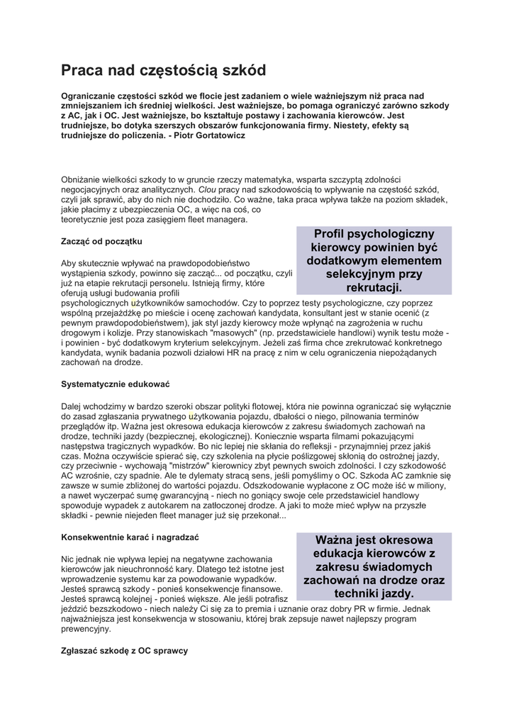 Praca nad częstością szkód Ograniczanie częstości szkód we flocie jest zadaniem o wiele ważniejszym niż praca nad zmniejszaniem ich średniej wielkości. Jest ważniejsze, bo pomaga ograniczyć zarówno szkody z AC, jak i OC. Jest ważniejsze, bo kształtuje postawy i zachowania kierowców. Jest trudniejsze, bo dotyka szerszych obszarów funkcjonowania firmy. Niestety, efekty są trudniejsze do policzenia. - Piotr Gortatowicz Obniżanie wielkości szkody to w gruncie rzeczy matematyka, wsparta szczyptą zdolności negocjacyjnych oraz analitycznych. Clou pracy nad szkodowością to wpływanie na częstość szkód, czyli jak sprawić, aby do nich nie dochodziło. Co ważne, taka praca wpływa także na poziom składek, jakie płacimy z ubezpieczenia OC, a więc na coś, co teoretycznie jest poza zasięgiem fleet managera. Zacząć od początku Profil psychologiczny kierowcy powinien być dodatkowym elementem selekcyjnym przy rekrutacji. Aby skutecznie wpływać na prawdopodobieństwo wystąpienia szkody, powinno się zacząć... od początku, czyli już na etapie rekrutacji personelu. Istnieją firmy, które oferują usługi budowania profili psychologicznych użytkowników samochodów. Czy to poprzez testy psychologiczne, czy poprzez wspólną przejażdżkę po mieście i ocenę zachowań kandydata, konsultant jest w stanie ocenić (z pewnym prawdopodobieństwem), jak styl jazdy kierowcy może wpłynąć na zagrożenia w ruchu drogowym i kolizje. Przy stanowiskach "masowych" (np. przedstawiciele handlowi) wynik testu może i powinien - być dodatkowym kryterium selekcyjnym. Jeżeli zaś firma chce zrekrutować konkretnego kandydata, wynik badania pozwoli działowi HR na pracę z nim w celu ograniczenia niepożądanych zachowań na drodze. Systematycznie edukować Dalej wchodzimy w bardzo szeroki obszar polityki flotowej, która nie powinna ograniczać się wyłącznie do zasad zgłaszania prywatnego użytkowania pojazdu, dbałości o niego, pilnowania terminów przeglądów itp. Ważna jest okresowa edukacja kierowców z zakresu świadomych zachowań na drodze, techniki jazdy (bezpiecznej, ekologicznej). Koniecznie wsparta filmami pokazującymi następstwa tragicznych wypadków. Bo nic lepiej nie skłania do refleksji - przynajmniej przez jakiś czas. Można oczywiście spierać się, czy szkolenia na płycie poślizgowej skłonią do ostrożnej jazdy, czy przeciwnie - wychowają "mistrzów" kierownicy zbyt pewnych swoich zdolności. I czy szkodowość AC wzrośnie, czy spadnie. Ale te dylematy stracą sens, jeśli pomyślimy o OC. Szkoda AC zamknie się zawsze w sumie zbliżonej do wartości pojazdu. Odszkodowanie wypłacone z OC może iść w miliony, a nawet wyczerpać sumę gwarancyjną - niech no goniący swoje cele przedstawiciel handlowy spowoduje wypadek z autokarem na zatłoczonej drodze. A jaki to może mieć wpływ na przyszłe składki - pewnie niejeden fleet manager już się przekonał... Konsekwentnie karać i nagradzać Ważna jest okresowa edukacja kierowców z zakresu świadomych zachowań na drodze oraz techniki jazdy. Nic jednak nie wpływa lepiej na negatywne zachowania kierowców jak nieuchronność kary. Dlatego też istotne jest wprowadzenie systemu kar za powodowanie wypadków. Jesteś sprawcą szkody - ponieś konsekwencje finansowe. Jesteś sprawcą kolejnej - ponieś większe. Ale jeśli potrafisz jeździć bezszkodowo - niech należy Ci się za to premia i uznanie oraz dobry PR w firmie. Jednak najważniejsza jest konsekwencja w stosowaniu, której brak zepsuje nawet najlepszy program prewencyjny. Zgłaszać szkodę z OC sprawcy Bardziej technicznym elementem wpływającym na częstość szkód jest zgłaszanie ich bezpośrednio z ubezpieczenia OC sprawcy, z pominięciem własnej polisy AC. Wielokrotnie na szkoleniach dla branży flotowej byłem pytany przez uczestników, czy regresy powinny być wliczane do szkodowości (zmniejszając ją) i jak - te faktycznie odzyskane czy potencjalnie możliwe? Doświadczenia pokazują, że temat ten nie rządzi się jasnymi prawami. Z jednej strony wymaga to uporządkowania i jasnych reguł gry pomiędzy posiadaczem floty a ubezpieczycielem. Z drugiej jednak - zawsze lepiej zapobiegać niż leczyć. Jeżeli okoliczności szkody i sprawstwo są jednoznacznie ustalone - lepiej zgłosić roszczenie bezpośrednio do ubezpieczyciela OC sprawcy. Jednak jeśli okoliczności i sprawstwo są wątpliwe - korzystniej jest użyć własnej polisy AC. Wykorzystywać miękkie metody Warto skłonić kierowców do codziennej drobnej refleksji nad dniem spędzonym w drodze. Oprócz powyższego, fleet managerowi pozostaje pole do bardziej miękkich metod wpływania na zachowania kierowców. Jak słynne swego czasu naklejki "Jeżdżę niebezpiecznie - zadzwoń", nakłaniające innych uczestników ruchu do donoszenia na agresywnie jadących kierowców (choć w polskich realiach działa to słabo). Albo - co podpatrzyłem w jednej z dużych flot handlowych - przy wypełnianiu elektronicznego formularza raportu dziennego pojawiało się pytanie, czy kierowca uczestniczył tego dnia w niebezpiecznej sytuacji na drodze, a jeśli tak - w jakiej. Niby drobiazg, ale setki kierowców zmuszał do codziennej drobnej refleksji. Kolejny element rzutujący na częstość występowania szkód, o którym mówić teraz jest bardzo trendy, to telemetria i związane z nią elektrogadżety. Ale o tym już za tydzień... Piotr Gortatowicz Wieloletni praktyk rynku ubezpieczeń komunikacyjnych, z doświadczeniem zdobytym zarówno po stronie brokerskiej jak i zakładu ubezpieczeń. Aktualnie prowadzi własną działalność.