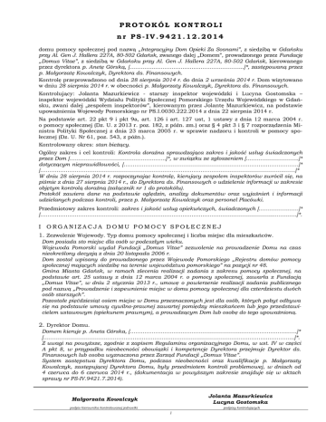 PROTOKÓŁ KONTROLI nr PS-IV.9421.12.2014 domu pomocy społecznej pod nazwą „Integracyjny Dom Opieki Za Sosnami”, z siedzibą w Gdańsku przy Al. Gen J. Hallera 227A, 80-502 Gdańsk, zwanego dalej „Domem”, prowadzonego przez Fundację „Domus Vitae”, z siedzibą w Gdańsku przy Al. Gen J. Hallera 227A, 80-502 Gdańsk, kierowanego przez dyrektora p. Anetę Górską, [……………………………………………………...]*, zastępowaną przez p. Małgorzatę Kowalczyk, Dyrektora ds. Finansowych. Kontrolę przeprowadzono od dnia 28 sierpnia 2014 r. do dnia 2 września 2014 r. Dom wizytowano w dniu 28 sierpnia 2014 r. w obecności p. Małgorzaty Kowalczyk, Dyrektora ds. Finansowych. Kontrolujący: Jolanta Mazurkiewicz - starszy inspektor wojewódzki i Lucyna Gostomska – inspektor wojewódzki Wydziału Polityki Społecznej Pomorskiego Urzędu Wojewódzkiego w Gdańsku, zwani dalej „zespołem inspektorów”, kierowanym przez Jolantę Mazurkiewicz, na podstawie upoważnienia Wojewody Pomorskiego nr PS.I.0030.222.2014 z dnia 22 sierpnia 2014 r. Na podstawie art. 22 pkt 9 i pkt 9a, art. 126 i art. 127 ust, 1 ustawy z dnia 12 marca 2004 r. o pomocy społecznej (Dz. U. z 2013 r. poz. 182, z późn. zm.) oraz § 4 pkt 3 i § 7 rozporządzenia Ministra Polityki Społecznej z dnia 23 marca 2005 r. w sprawie nadzoru i kontroli w pomocy społecznej (Dz. U. Nr 61, poz. 543, z późn.). Kontrolowany okres: stan bieżący. Ogólny zakres i cel kontroli: Kontrola doraźna sprawdzająca zakres i jakość usług świadczonych przez Dom [……………………………………………..]*, w związku ze zgłoszeniem [………………………..]* dotyczącym nieprawidłowości, [……………………………………………………………………………………]* [……………………………………………………………………………………………………………………..……]* W dniu 28 sierpnia 2014 r. rozpoczynając kontrolę, kierujący zespołem inspektorów zwrócił się, na piśmie z dnia 27 sierpnia 2014 r., do Dyrektora ds. Finansowych o udzielenie informacji w zakresie objętym kontrolą doraźną (załącznik nr 1 do protokółu). Protokół zawiera dane na podstawie oględzin, analizy dokumentów oraz wyjaśnień i informacji udzielanych podczas kontroli, przez p. Małgorzatę Kowalczyk oraz personel Placówki. Przedmiotowy zakres kontroli: zakres i jakość usług opiekuńczych, świadczonych […………….……]* [………………………………………………………………………………………………………………..………….]*. I ORGANIZACJA DOMU POMOCY SPOŁECZNEJ 1. Zezwolenie Wojewody. Typ domu pomocy społecznej i liczba miejsc dla mieszkańców. Dom posiada sto miejsc dla osób w podeszłym wieku. Wojewoda Pomorski wydał Fundacji „Domus Vitae” zezwolenie na prowadzenie Domu na czas nieokreślony decyzją z dnia 20 listopada 2006 r. Dom został wpisany do prowadzonego przez Wojewodę Pomorskiego „Rejestru domów pomocy społecznej mających siedzibę na terenie województwa pomorskiego” na pozycji nr 48. Gmina Miasta Gdańsk, w ramach zlecenia realizacji zadania z zakresu pomocy społecznej, na podstawie art. 25 ustawy z dnia 12 marca 2004 r. o pomocy społecznej, zawarła z Fundacją „Domus Vitae”, w dniu 2 stycznia 2013 r., umowę o powierzenie realizacji zadania publicznego pod nazwą „Prowadzenie i zapewnienie miejsc w domu pomocy społecznej dla czterdziestu dwóch osób starszych”. Pozostałe pięćdziesiąt osiem miejsc w Domu przeznaczonych jest dla osób, których pobyt odbywa się na podstawie umowy cywilno-prawnej zawartej pomiędzy mieszkańcem lub jego przedstawicielem ustawowym (opiekunem prawnym), a prowadzącym Dom lub osobę do tego upoważnioną. 2. Dyrektor Domu. Domem kieruje p. Aneta Górska, […………………………………………………………………………...…..]* [………………………………………………………………………………………………………………………...]*. Z uwagi na powyższe, zgodnie z zapisem Regulaminu organizacyjnego Domu, w ust. IV w części A pkt 8, w przypadku nieobecności obowiązki i kompetencje Dyrektora przejmuje Dyrektor ds. Finansowych lub osoba wyznaczona przez Zarząd Fundacji „Domus Vitae”. System zastępstwa Dyrektora Domu, podczas nieobecności oraz kwalifikacje p. Małgorzaty Kowalczyk, zastępującej Dyrektora Domu, były przedmiotem kontroli problemowej, w dniach od 4 czerwca do 6 czerwca 2014 r., (dokumentacja w powyższym zakresie znajduje się w aktach sprawy nr PS-IV.9421.7.2014). Jolanta Mazurkiewicz Lucyna Gostomska Małgorzata Kowalczyk podpis kierownika kontrolowanej jednostki podpisy kontrolujących 1 Protokół nr PS.-V.9421.12.2014 z przeprowadzonej w dniach od 28 sierpnia do 2 września 2014 r. kontroli standardu usług świadczonych przez „Integracyjny Dom Opieki Za Sosnami” w Gdańsku przy Al. Gen. J. Hallera 227A, 80-502 Gdańsk. II POBYT W DOMU P. [……………………………………………………………]* 1. Pobyt w Domu. P. [………………………………………………..…]*do Domu w dniu [………………]*, na podstawie umowy cywilno-prawnej, dotyczącej pobytu w Domu, w której p. […………………]* reprezentuje [………...]* p. […………………..….]* (na umowie widnieje podpis p. […………………….…..]*, jako […………..]* Domu). Umowa zawarta została w dniu […………………………………]* na czas nieokreślony (kopia umowy stanowi załącznik nr 2 do protokółu). P. [………………………………………….]* do Domu z rozpoznaniem chorobowym: [………………….....]* [……………………………………………………………………………………………………………………….]*. Z powodu ww. chorób, […………
