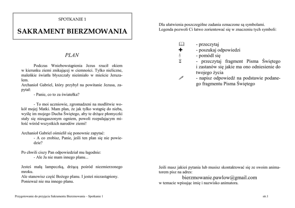 SPOTKANIE 1 SAKRAMENT BIERZMOWANIA PLAN Podczas Wniebowstąpienia Jezus rzucił okiem w kierunku ziemi znikającej w ciemności. Tylko nieliczne, maleńkie światła błyszczały nieśmiało w mieście Jeruzalem. Archanioł Gabriel, który przybył na powitanie Jezusa, zapytał: - Panie, co to za światełka? Dla ułatwienia poszczególne zadania oznaczone są symbolami. Legenda pozwoli Ci łatwo zorientować się w znaczeniu tych symboli: ✚ - przeczytaj - poszukaj odpowiedzi - pomódl się - przeczytaj fragment Pisma Świętego i zastanów się jakie ma ono odniesienie do twojego życia - napisz odpowiedź na podstawie podanego fragmentu Pisma Świętego - To moi uczniowie, zgromadzeni na modlitwie wokół mojej Matki. Mam plan, że jak tylko wstąpię do nieba, wyślę im mojego Ducha Świętego, aby te drżące płomyczki stały się nieugaszonym ogniem, powoli rozpalającym miłość wśród wszystkich narodów ziemi! Archanioł Gabriel ośmielił się ponownie zapytać: - A co zrobisz, Panie, jeśli ten plan się nie powiedzie? Po chwili ciszy Pan odpowiedział mu łagodnie: - Ale Ja nie mam innego planu... Jesteś małą lampeczką, drżącą pośród niezmierzonego mroku. Ale stanowisz część Bożego planu. I jesteś niezastąpiony. Ponieważ nie ma innego planu. Przygotowanie do przyjęcia Sakramentu Bierzmowania – Spotkanie 1 Jeśli masz jakieś pytania lub musisz skontaktować się ze swoim animatorem pisz na adres: [email protected] w temacie wpisując imię i nazwisko animatora. str.1 W miarę dorastania, rodzice powierzają dzieciom coraz bardziej odpowiedzialne role do spełnienia. Gdy dziecko dorasta, jest też bardziej świadome zadań do wypełnienia w życiu rodzinnym. Podobnie jest w Kościele – wielkiej rodzinie, do której wchodzimy przez Chrzest święty. Dziś będziemy mówić o bierzmowaniu jako o sakramencie, w którym Bóg umacnia nas Duchem Świętym do wypełnienia powierzonych zadań. Od momentu przyjęcia sakramentu Bierzmowania każdy staje się dojrzałym chrześcijaninem. Od tego momentu za moją wiarę jestem już sam odpowiedzialny. Bowiem przyjmując ten sakrament zakłada się, że człowiek osiągnął dojrzałość w wierze. Ta dojrzałość zakłada przyjęcie na siebie wszelkich konsekwencji wyborów. Sakrament Bierzmowania motywuje do pracy nad sobą, nad rozwojem własnej wiary, nad odkryciem swojego powołania życiowego. NAUCZANIE KOŚCIOŁA Często nie zdajemy sobie sprawy z tego jak wiele łask dostępujemy przyjmując sakramenty. Dlatego też teraz przyjrzyj się sakramentom – czym są i dlaczego są tak ważne. Katechizm Kościoła Katolickiego (potrzebne fragmenty dostępne są na stronie internetowej) 1. Co to jest sakrament? ………………………………………………………………………… ………………………………………………………………………… ………………………………………………………………………… ………………………………………………………………………… 2. Wymień 7 sakramentów. • ……………………………………………………………………. • ……………………………………………………………………. Przygotowanie do przyjęcia Sakramentu Bierzmowania – Spotkanie 1 • • • • • ……………………………………………………………………. ……………………………………………………………………. ……………………………………………………………………. ……………………………………………………………………. ……………………………………………………………………. 3. Nazwij grupy do których należą sakramenty oraz przyporządkuj je do poszczególnych grup. …………………. …………………. …………………. 1. ………………. 2. ………………. 3. ………………. 1. ………………. 2. ………………. 1. .………………. 2. .………………. 4. Które sakramenty można przyjąć tylko raz w życiu? ………………………………………………………………………… ………………………………………………………………………… 5. Napisz 2-3 zdania o każdym z sakramentów. ………………………………………………………………………… ………………………………………………………………………… ………………………………………………………………………… ………………………………………………………………………… ………………………………………………………………………… ………………………………………………………………………… ………………………………………………………………………… ………………………………………………………………………… ………………………………………………………………………… ………………………………………………………………………… ………………………………………………………………………… ………………………………………………………………………… ………………………………………………………………………… ………………………………………………………………………… ………………………………………………………………………… str.2 ………………………………………………………………………… ………………………………………………………………………… ………………………………………………………………………… ………………………………………………………………………… ……………