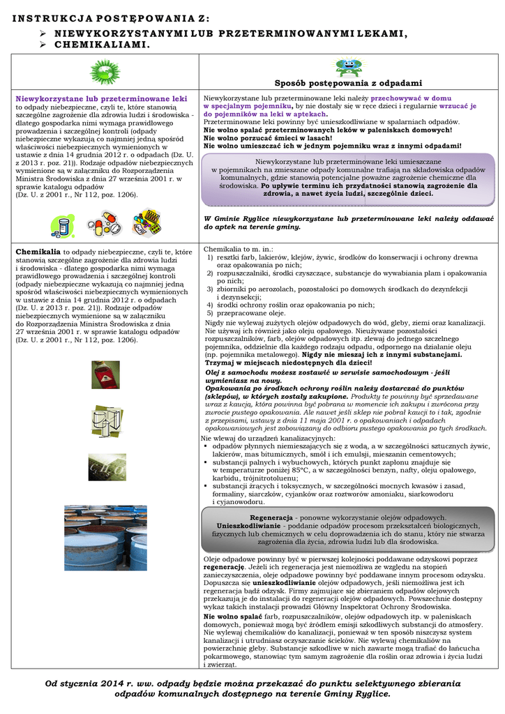 INSTRUKCJA POSTĘPOWANIA Z: NIEWYKORZYSTANYMI LUB PRZETERMINOWANYMI LEKAMI, CHEMIKALIAMI. Sposób postępowania z odpadami Niewykorzystane lub przeterminowane leki to odpady niebezpieczne, czyli te, które stanowią szczególne zagrożenie dla zdrowia ludzi i środowiska dlatego gospodarka nimi wymaga prawidłowego prowadzenia i szczególnej kontroli (odpady niebezpieczne wykazują co najmniej jedną spośród właściwości niebezpiecznych wymienionych w ustawie z dnia a 14 grudnia 2012 r. o odpadach (Dz. U. z 2013 r. poz. 21)).. Rodzaje odpadów niebezpiecznych wymienione są w załączniku do Rozporządzenia Ministra Środowiska z dnia 27 września 2001 r. w sprawie katalogu odpadów (Dz. U. z 2001 r., Nr 112, poz. 1206). Niewykorzystane lub przeterminowane leki należy przechowywać w domu w specjalnym pojemniku, by nie dostały się w ręce dzieci i regularnie wrzucać je do pojemników na leki w aptekach. Przeterminowane leki powinny być unieszkodliwiane w spalarniach odpadów. Nie wolno spalać przeterminowanych leków w paleniskach domowych! Nie wolno porzucać śmieci w lasach! Nie wolno umieszczać ich w jednym pojemniku wraz z innymi odpadami! Niewykorzystane lub przeterminowane leki umieszczane um w pojemnikach na zmieszane odpady komunalne trafiają na składowiska odpadów komunalnych, gdzie stanowią ą potencjalne poważne zagrożenie chemiczne dla środowiska. Po upływie terminu ich przydatności stanowią stano zagrożenie dla zdrowia, a nawet życia ludzi, szczególnie dzieci. W Gminie Ryglice niewykorzystane lub przeterminowane leki należy oddawać do aptek na terenie gminy. Chemikalia to odpady niebezpieczne, czyli te, które stanowią szczególne zagrożenie dla zdrowia ludzi i środowiska - dlatego gospodarka nimi wymaga prawidłowego prowadzenia i szczególnej kontroli (odpady niebezpieczne wykazują co najmniej jedną spośród właściwości niebezpiecznych ebezpiecznych wymienionych w ustawie z dnia 14 grudnia 2012 r. o odpadach (Dz. U. z 2013 r. poz. 21)). Rodzaje odpadów niebezpiecznych wymienione są w załączniku do Rozporządzenia Ministra Środowiska z dnia 27 września 2001 r. w sprawie katalogu odpadów (Dz. U. z 2001 r., Nr 112, poz. 1206). Chemikalia to m. in.: 1) resztki farb, lakierów, klejów, żywic, środków do konserwacji i ochrony drewna oraz opakowania po nich; 2) rozpuszczalniki, środki czyszczące, substancje do wywabiania plam i opakowania po nich; 3) zbiorniki po aerozolach, pozostałości po domowych środkach do dezynfekcji i dezynsekcji; 4) środki ochrony roślin oraz opakowania po nich; 5) przepracowane oleje. Nigdy nie wylewaj zużytych olejów odpadowych do wód, gleby, ziemi oraz kanalizacji. Nie używaj ich również jako oleju opałowego. łowego. Nieużywane pozostałości rozpuszczalników, farb, olejów odpadowych itp. p. zlewaj do jednego szczelnego pojemnika, oddzielnie dla każdego rodzaju odpadu, odpornego na działanie oleju (np. pojemnika metalowego). Nigdy nie mieszaj ich z innymi substancjami. Trzymaj w miejscach niedostępnych dla dzieci! Olej z samochodu możesz zostawić w serwisie samochodowym samocho - jeśli wymieniasz na nowy. pakowania po środkach ochrony roślin należy dostarczać do punktów Opakowania (sklepów), w których zostały zakupione. Produkty te powinny być sprzedawane wraz z kaucją, która powinna być pobrana w momencie ich zakupu i zwrócona przy zwrocie pustego opakowania. Ale nawet jeśli sklep nie pobrał kaucji to i tak, tak zgodnie z przepisami, ustawy z dnia 11 maja 2001 r. o opakowaniach i odpadach opakowaniowych jest zobowiązany do odbioru pustego opakowania po tych środkach. Nie wlewaj do urządzeń kanalizacyjnych: odpadów płynnych niemieszających mieszających się z wodą, a w szczególności sztucznych żywic, lakierów, mas bitumicznych, smół i ich emulsji, mieszanin cementowych; cementowych substancji palnych i wybuchowych, których punkt zapłonu znajduje się w temperaturze poniżej 85ºC, a w szczególności ści benzyn, nafty, oleju opałowego, karbidu, trójnitrotoluenu; substancji żrących i toksycznych, w szczególności mocnych kwasów i zasad, formaliny, siarczków, cyjanków oraz roztworów amoniaku, siarkowodoru i cyjanowodoru. Regeneracja - ponowne wykorzystanie olejów odpadowych. Unieszkodliwianie - poddanie odpadów procesom przekształceń biologicznych, fizycznych lub chemicznych w celu doprowadzenia ich do stanu, który nie stwarza zagrożenia dla życia, zdrowia ludzi lub dla środowiska. Oleje odpadowe powinny być w pierwszej kolejności poddawane odzyskowi poprzez regenerację.. Jeżeli ich regeneracja jest niemożliwa ze względu na stopień zanieczyszczenia, oleje odpadowe powinny być poddawane innym procesom odzysku. Dopuszcza się unieszkodliwianie olejów odpadowych, jeśli niemożliwa jest ich regeneracja bądź odzysk. Firmy zajmujące się zbieraniem odpadów olejowych przekazują je do instalacji do regeneracji olejów odpadowych. Powszechnie dostępny wykaz takich instalacji prowadzi Główny Inspektorat Ochrony O Środowiska. Nie wolno spalać farb,, rozpuszczalników, olejów odpadowych itp. w paleniskach domowych, ponieważ mogą być źródłem emisji szkodliwych substancji do atmosfery. Nie wylewaj chemikaliów do kanalizacji, ponieważ w ten sposób niszczysz system sys kanalizacji i utrudniasz oczyszczanie ścieków. ków. Nie wylewaj chemikaliów na powierzchnię gleby. Substancje szkodliwe w nich zawarte mogą trafiać do łańcucha pokarmowego, stanowiąc tym samym zagrożenie dla roślin oraz zdrowia i życia ludzi i zwierząt. Od stycznia 2014 r. ww. odpady będzie można przekazać do punktu selektywnego zbierania odpadów komunalnych dostępnego na terenie Gminy Ryglice.