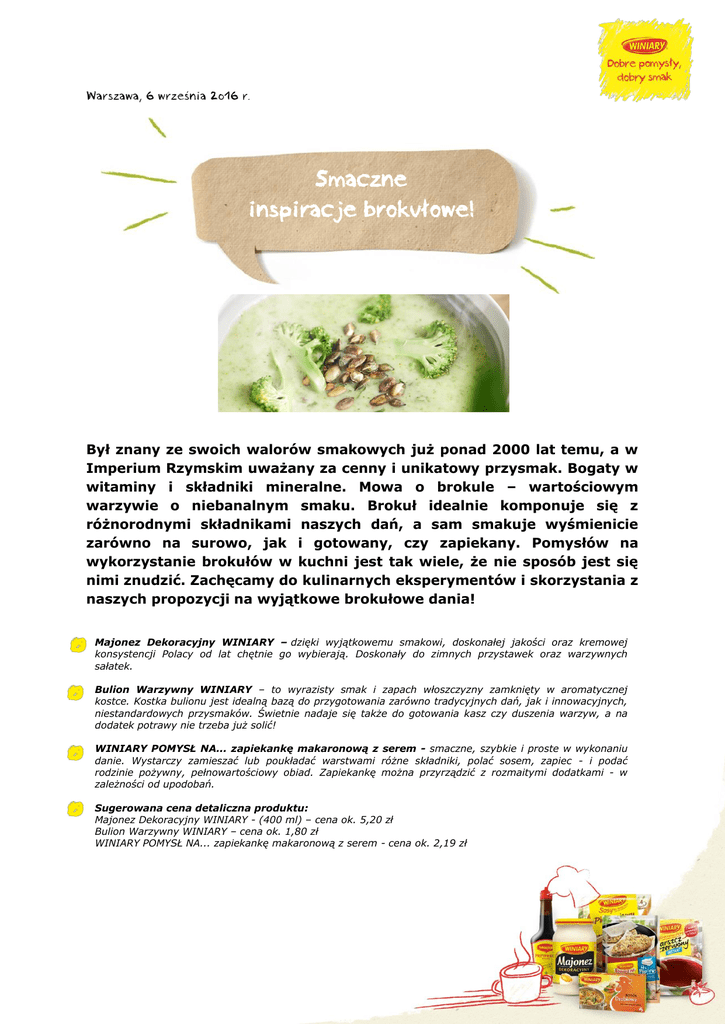 Warszawa, 6 września 2016 r. Smaczne inspiracje brokułowe! Był znany ze swoich walorów smakowych już ponad 2000 lat temu, a w Imperium Rzymskim uważany za cenny i unikatowy przysmak. Bogaty w witaminy i składniki mineralne. Mowa o brokule – wartościowym warzywie o niebanalnym smaku. Brokuł idealnie komponuje się z różnorodnymi składnikami naszych dań, a sam smakuje wyśmienicie zarówno na surowo, jak i gotowany, czy zapiekany. Pomysłów na wykorzystanie brokułów w kuchni jest tak wiele, że nie sposób jest się nimi znudzić. Zachęcamy do kulinarnych eksperymentów i skorzystania z naszych propozycji na wyjątkowe brokułowe dania! Majonez Dekoracyjny WINIARY – dzięki wyjątkowemu smakowi, doskonałej jakości oraz kremowej konsystencji Polacy od lat chętnie go wybierają. Doskonały do zimnych przystawek oraz warzywnych sałatek. Bulion Warzywny WINIARY – to wyrazisty smak i zapach włoszczyzny zamknięty w aromatycznej kostce. Kostka bulionu jest idealną bazą do przygotowania zarówno tradycyjnych dań, jak i innowacyjnych, niestandardowych przysmaków. Świetnie nadaje się także do gotowania kasz czy duszenia warzyw, a na dodatek potrawy nie trzeba już solić! WINIARY POMYSŁ NA... zapiekankę makaronową z serem - smaczne, szybkie i proste w wykonaniu danie. Wystarczy zamieszać lub poukładać warstwami różne składniki, polać sosem, zapiec - i podać rodzinie pożywny, pełnowartościowy obiad. Zapiekankę można przyrządzić z rozmaitymi dodatkami - w zależności od upodobań. Sugerowana cena detaliczna produktu: Majonez Dekoracyjny WINIARY - (400 ml) – cena ok. 5,20 zł Bulion Warzywny WINIARY – cena ok. 1,80 zł WINIARY POMYSŁ NA... zapiekankę makaronową z serem - cena ok. 2,19 zł Brokuły dostępne są przez cały rok, jednak pamiętajmy, że najlepiej smakują późną jesienią. Zbliża się więc idealny czas na brokułowe szaleństwo w naszej kuchni! Brokuły coraz chętniej są uprawiane w Polsce – to dobra wiadomość, bowiem warzywa te są cennym źródłem witaminy C, kwasu foliowego, a także betakarotenu, czyli prowitaminy A. Znaleźć w nich można także sporo potasu, a w mniejszych ilościach również wapń, żelazo, magnez i mangan. Witaminy i składniki mineralne zawarte w brokułach korzystnie wpływają na nasze zdrowie – między innymi na stan wzroku, układ odpornościowy, skórę, paznokcie i włosy. Warto wprowadzić więc brokuły do naszego menu! Mając je w kuchni możemy eksperymentować i przyrządzać wiele smacznych potraw, od zup i przekąsek, na daniach głównych kończąc. Pamiętajmy przy tym, że brokuły to samo zdrowie! Jeśli szukasz pomysłu na sycącą i kremową zupę, która idealnie sprawdzi się jako danie główne, czy podwieczorek podaj swoim bliskim krem z brokułów. Tę pyszną zupę przygotujesz zaledwie w 30 minut – dlatego sprawdzi się również przy niespodziewanych gościach. Do jej przyrządzenia nie potrzebujemy długiej listy składników. Wystarczą: 2 kostki Bulionu warzywnego WINIARY, 100 g pora, 1 ząbek czosnku, 2 łyżki masła, 2 sztuki brokułów, 4 łyżki śmietany 18%, sól i pieprz (do smaku), bazylia (do smaku) i pestki dyni. Bulion rozpuszczamy w 0,75 l wrzącej wody. Pora oczyszczamy, kroimy w krążki, a następnie szklimy na maśle. Dodajemy drobno pokrojony czosnek i przesmażamy chwilę razem z porem. Brokuły dzielimy na różyczki. Do naszego bulionu dodajemy podsmażonego pora i brokuł, po czym gotujemy do miękkości przez ok. 15 minut. Następnie całość miksujemy. Do kremu dodajemy śmietanę, doprawiamy do smaku solą, pieprzem i bazylią. Zupę przelewamy do bulionówek i podajemy posypaną pestkami dyni i malutkimi, zblanszowanym różyczkami brokuła. Smacznego! Chcesz zaskoczyć swoich bliskich pożywnym i wartościowym drugim daniem? Polecamy zapiekankę z kurczakiem i brokułami. To danie, dzięki odrobinie świeżego czosnku idealnie skomponuje się z unikalną kompozycją przypraw. Do przygotowania tej potrawy będziemy potrzebować: 1 opakowania WINIARY POMYSŁ NA… zapiekankę makaronową z serem, 100 ml śmietanki 12%, 2 szt. filetów z kurczaka, 1 brokułu, 2 łyżek oleju, 150g makaronu rurki, 50g startego sera mozzarella, soli i pieprzu (do smaku). Zawartość POMYSŁ NA… rozprowadzamy w 100 ml śmietanki 12% i w 650 ml wody. Gotujemy całość od czasu do czasu mieszając. Filety kroimy w kostkę, podsmażamy na oleju i doprawiamy solą, i pieprzem. Brokuł dzielimy na różyczki i blanszujemy. Do naczynia do zapiekania wsypujemy makaron, a następnie wykładamy kurczaka i brokuły. Zalewany przygotowanym wcześniej wywarem. Zapiekankę posypujemy startym serem mozzarella i wstawiamy do piekarnika nagrzanego do 180ºC. Zapiekamy przez 30 minut. Pycha! Brokuły idealnie sprawdzą się także, jako składnik sałatek – propozycja doskonała na kolacje, lunche, czy spotkania w gronie bliskich. Proponujemy przygotowanie pożywnej sałatki z brokułami i makaronem. Jest prosta w przygotowaniu, a zarazem wyjątkowo smaczna. Do przyrządzenia tej przekąski będziemy potrzebować: 4 łyżek Majonezu Dekoracyjnego WINIARY, 250 g makaronu kokardki, 1 brokułu, 1 łyżeczkę cukru, 200 g szynki konserwowej, 10 sztuk pomidorów suszonych w oleju, 2 ząbki czosnku i sól, pieprz (do smaku). Makaron gotujemy w dużej ilości posolonej wody. Brokuł dzielimy na różyczki, gotujemy z posolonej wodzie z cukrem przez 2 minuty, następnie odsączamy, przelewamy zimną wodą i studzimy. Szynkę kroimy w paseczki, pomidory odsączamy i kroimy również w cienkie paski. Czosnek siekamy drobno. Następnie wszystkie składniki sałatki łączymy z majonezem i doprawiamy do smaku solą i pieprzem. Smacznego! Po więcej pomysłów na wyjątkowe potrawy z wykorzystaniem brokułów zapraszamy na www.winiary.pl. ## WINIARY to marka, która od lat jest gwarancją sukcesu w kuchni. Jej produkty inspirują współczesne panie domu do przygotowywania n