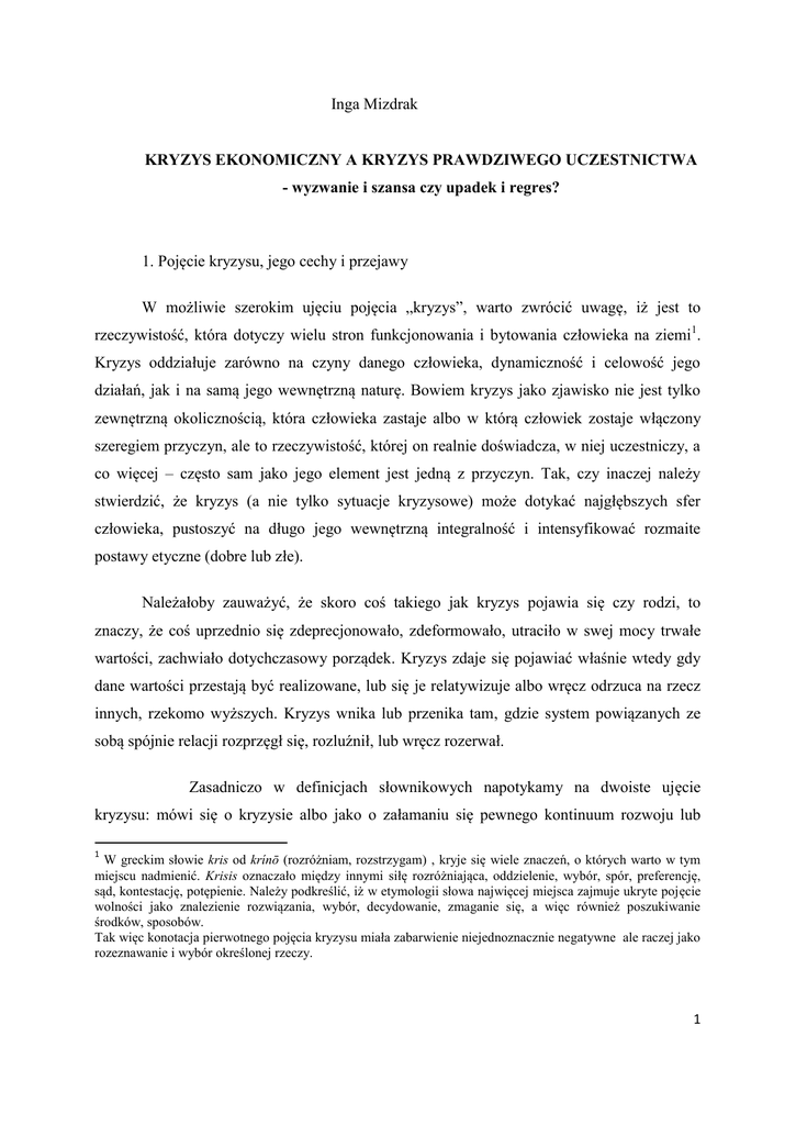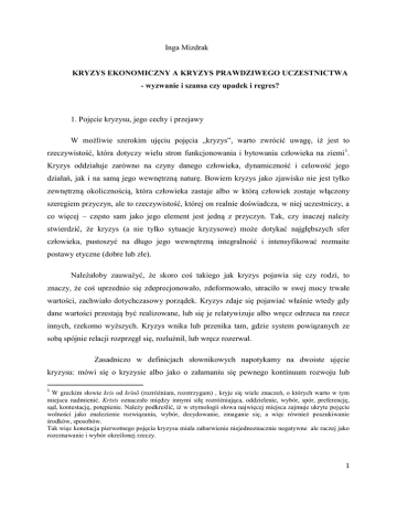 Inga Mizdrak KRYZYS EKONOMICZNY A KRYZYS PRAWDZIWEGO UCZESTNICTWA - wyzwanie i szansa czy upadek i regres? 1. Pojęcie kryzysu, jego cechy i przejawy W możliwie szerokim ujęciu pojęcia „kryzys”, warto zwrócić uwagę, iż jest to rzeczywistość, która dotyczy wielu stron funkcjonowania i bytowania człowieka na ziemi1. Kryzys oddziałuje zarówno na czyny danego człowieka, dynamiczność i celowość jego działań, jak i na samą jego wewnętrzną naturę. Bowiem kryzys jako zjawisko nie jest tylko zewnętrzną okolicznością, która człowieka zastaje albo w którą człowiek zostaje włączony szeregiem przyczyn, ale to rzeczywistość, której on realnie doświadcza, w niej uczestniczy, a co więcej – często sam jako jego element jest jedną z przyczyn. Tak, czy inaczej należy stwierdzić, że kryzys (a nie tylko sytuacje kryzysowe) może dotykać najgłębszych sfer człowieka, pustoszyć na długo jego wewnętrzną integralność i intensyfikować rozmaite postawy etyczne (dobre lub złe). Należałoby zauważyć, że skoro coś takiego jak kryzys pojawia się czy rodzi, to znaczy, że coś uprzednio się zdeprecjonowało, zdeformowało, utraciło w swej mocy trwałe wartości, zachwiało dotychczasowy porządek. Kryzys zdaje się pojawiać właśnie wtedy gdy dane wartości przestają być realizowane, lub się je relatywizuje albo wręcz odrzuca na rzecz innych, rzekomo wyższych. Kryzys wnika lub przenika tam, gdzie system powiązanych ze sobą spójnie relacji rozprzęgł się, rozluźnił, lub wręcz rozerwał. Zasadniczo w definicjach słownikowych napotykamy na dwoiste ujęcie kryzysu: mówi się o kryzysie albo jako o załamaniu się pewnego kontinuum rozwoju lub 1 W greckim słowie kris od krínō (rozróżniam, rozstrzygam) , kryje się wiele znaczeń, o których warto w tym miejscu nadmienić. Krisis oznaczało między innymi siłę rozróżniająca, oddzielenie, wybór, spór, preferencję, sąd, kontestację, potępienie. Należy podkreślić, iż w etymologii słowa najwięcej miejsca zajmuje ukryte pojęcie wolności jako znalezienie rozwiązania, wybór, decydowanie, zmaganie się, a więc również poszukiwanie środków, sposobów. Tak więc konotacja pierwotnego pojęcia kryzysu miała zabarwienie niejednoznacznie negatywne ale raczej jako rozeznawanie i wybór określonej rzeczy. 1 wewnętrznej równowagi danej rzeczywistości, albo jako o przełomie, przesileniu, decydującym zwrocie. Z tym, że w tym drugim ujęciu można znowu podejść do zagadnienia dwojako. Przełom może być wyzwaniem do podjęcia nowych działań, a więc i szansą pójścia w określonym kierunku, ale może też być okazją do upadku, rezygnacji oraz czynienia zła. Niewątpliwie kryzys jest pewną kulminacją i kumulacją rozmaitych konfliktów (wartości, interesów, relacji międzyludzkich, społecznych, gospodarczych, politycznych) w różnych dziedzinach życia, które generują określone postawy moralne. W świecie ekonomiczno-społecznym kryzys zdaje się lokować się tam, gdzie wspólne dobro zastępuje partykularny interes albo niesprawiedliwość, brak lojalności czy odpowiedzialności. Innymi słowy tam, gdzie narasta rezygnacja z wartości dobra, tam łatwiej o kryzys, albo też tam, gdzie nasila się przewaga indywidualizmów nad wspólnotowością, tam łatwiej o kryzys, bo otwartość na wspólne dążenie, współpracę i pomnażanie dóbr zastępuje monadyczne zamknięcie w obrębie pola swych partykularnych dążeń (zarówno w przestrzeni mikro i makrospołecznej). Często uderzający w mniejszym lub większym stopniu kryzys ekonomiczno-gospodarczy w poszczególne jednostki, odsłania to, kim one są względem siebie. Jedni będą dążyć do wzajemnego wsparcia, pomocy, solidarności – inni przeciwnie – do cwaniactwa, egoizmu, wyzysku lub alienacji. Współczesne potoczne rozumienie kryzysu koncentruje się zasadniczo na negatywnym aspekcie. Kryzys to coś, co dezintegruje na wielu poziomach życie poszczególnych ludzi oraz całych społeczeństw. Nieodparcie kojarzony jest z utratą czegoś, zachwianiem porządku, destabilizacją, dysharmonią, regresem, zastopowaniem, dysonansem. Zakres tego pojęcia jest tak szeroki, że zdaje się obejmować niemal wszystkie dziedziny ludzkiej aktywności. Można wymienić bodaj kilka różnych odmian kryzysu, by zorientować się , iż nie sposób rozważyć tego pojęcia jednopoziomowo. Dziś mówi się przede wszystkim o kryzysie ekonomiczno-gospodarczo-społecznym, ale obok niego często słyszymy o kryzysie idei, wartości, kryzysie kultury, oświaty, kryzysach politycznych, kryzysie racjonalności, wolności, sprawiedliwości, odpowiedzialności, kryzysach politycznych, kryzysie tożsamości człowieka współczesnego, kryzysach okresu dojrzewania człowieka, kryzysach relacji międzyludzkich (np. małżeńskich) itd. Rozbieżność i wielokształtność 2 rozmaitych form kryzysu nastręcza trudności w zdefiniowaniu go, ale także i w skategoryzowaniu. Przy funkcjonowaniu pojęcia kryzysu jako czegoś pejoratywnego, istnieje również znaczenie ukazujące perspektywę pozytywną. Paradoksalnie czasem kryzys jest czymś niemal oczekiwanym, aby nastąpił zwrot albo w jednym albo w drugim kierunku, aby coś się rozstrzygnęło na jedną stronę. Trzeba jednak zaznaczyć, iż żaden kryzys w tle nie posiada monopolu na polepszenie sytuacji. Może bowiem coś ulec pogorszeniu nawet po ustąpieniu kryzysu. Kryzys to jakby przystanek na drodze, przecięcie rozmaitych linii, które były ze sobą połączone i oddalenie się elementów, które do siebie uprzednio przylegały. Jeśli kryzys rozpatrywać jako rozstrój pewnego harmonijnego układu – wówczas byłby czymś destrukcyjnym prowadzącym do upadku. Gdy natomiast popatrzeć na niego od strony pozytywnej2 jako koniecznej pauzy – momentu czy punktu, w którym ma się rozstrzygnąć kierunek danego problemu – mógłby stać się wtedy okazją