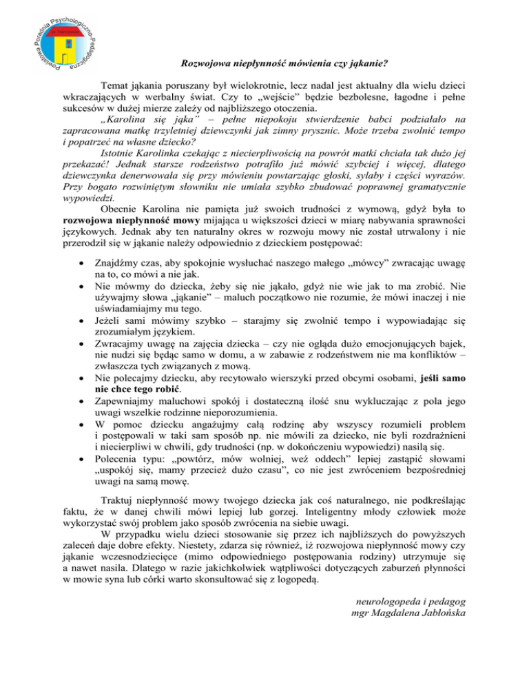 Rozwojowa niepłynność mówienia czy jąkanie? Temat jąkania poruszany był wielokrotnie, lecz nadal jest aktualny dla wielu dzieci wkraczających w werbalny świat. Czy to „wejście” będzie bezbolesne, łagodne i pełne sukcesów w dużej mierze zależy od najbliższego otoczenia. „Karolina się jąka” – pełne niepokoju stwierdzenie babci podziałało na zapracowana matkę trzyletniej dziewczynki jak zimny prysznic. Może trzeba zwolnić tempo i popatrzeć na własne dziecko? Istotnie Karolinka czekając z niecierpliwością na powrót matki chciała tak dużo jej przekazać! Jednak starsze rodzeństwo potrafiło już mówić szybciej i więcej, dlatego dziewczynka denerwowała się przy mówieniu powtarzając głoski, sylaby i części wyrazów. Przy bogato rozwiniętym słowniku nie umiała szybko zbudować poprawnej gramatycznie wypowiedzi. Obecnie Karolina nie pamięta już swoich trudności z wymową, gdyż była to rozwojowa niepłynność mowy mijająca u większości dzieci w miarę nabywania sprawności językowych. Jednak aby ten naturalny okres w rozwoju mowy nie został utrwalony i nie przerodził się w jąkanie należy odpowiednio z dzieckiem postępować: Znajdźmy czas, aby spokojnie wysłuchać naszego małego „mówcy” zwracając uwagę na to, co mówi a nie jak. Nie mówmy do dziecka, żeby się nie jąkało, gdyż nie wie jak to ma zrobić. Nie używajmy słowa „jąkanie” – maluch początkowo nie rozumie, że mówi inaczej i nie uświadamiajmy mu tego. Jeżeli sami mówimy szybko – starajmy się zwolnić tempo i wypowiadając się zrozumiałym językiem. Zwracajmy uwagę na zajęcia dziecka – czy nie ogląda dużo emocjonujących bajek, nie nudzi się będąc samo w domu, a w zabawie z rodzeństwem nie ma konfliktów – zwłaszcza tych związanych z mową. Nie polecajmy dziecku, aby recytowało wierszyki przed obcymi osobami, jeśli samo nie chce tego robić. Zapewniajmy maluchowi spokój i dostateczną ilość snu wykluczając z pola jego uwagi wszelkie rodzinne nieporozumienia. W pomoc dziecku angażujmy całą rodzinę aby wszyscy rozumieli problem i postępowali w taki sam sposób np. nie mówili za dziecko, nie byli rozdrażnieni i niecierpliwi w chwili, gdy trudności (np. w dokończeniu wypowiedzi) nasilą się. Polecenia typu: „powtórz, mów wolniej, weź oddech” lepiej zastąpić słowami „uspokój się, mamy przecież dużo czasu”, co nie jest zwróceniem bezpośredniej uwagi na samą mowę. Traktuj niepłynność mowy twojego dziecka jak coś naturalnego, nie podkreślając faktu, że w danej chwili mówi lepiej lub gorzej. Inteligentny młody człowiek może wykorzystać swój problem jako sposób zwrócenia na siebie uwagi. W przypadku wielu dzieci stosowanie się przez ich najbliższych do powyższych zaleceń daje dobre efekty. Niestety, zdarza się również, iż rozwojowa niepłynność mowy czy jąkanie wczesnodziecięce (mimo odpowiedniego postępowania rodziny) utrzymuje się a nawet nasila. Dlatego w razie jakichkolwiek wątpliwości dotyczących zaburzeń płynności w mowie syna lub córki warto skonsultować się z logopedą. neurologopeda i pedagog mgr Magdalena Jabłońska
