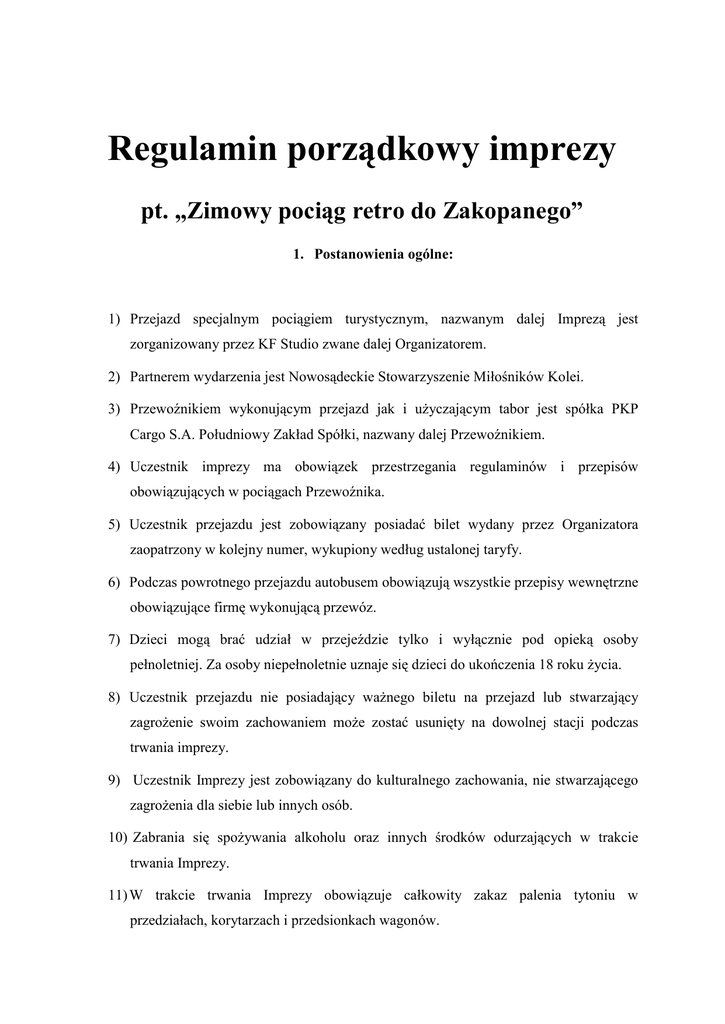 Regulamin porządkowy imprezy pt. „Zimowy pociąg retro do Zakopanego” 1. Postanowienia ogólne: 1) Przejazd specjalnym pociągiem turystycznym, nazwanym dalej Imprezą jest zorganizowany przez KF Studio zwane dalej Organizatorem. 2) Partnerem wydarzenia jest Nowosądeckie Stowarzyszenie Miłośników Kolei. 3) Przewoźnikiem wykonującym przejazd jak i uŜyczającym tabor jest spółka PKP Cargo S.A. Południowy Zakład Spółki, nazwany dalej Przewoźnikiem. 4) Uczestnik imprezy ma obowiązek przestrzegania regulaminów i przepisów obowiązujących w pociągach Przewoźnika. 5) Uczestnik przejazdu jest zobowiązany posiadać bilet wydany przez Organizatora zaopatrzony w kolejny numer, wykupiony według ustalonej taryfy. 6) Podczas powrotnego przejazdu autobusem obowiązują wszystkie przepisy wewnętrzne obowiązujące firmę wykonującą przewóz. 7) Dzieci mogą brać udział w przejeździe tylko i wyłącznie pod opieką osoby pełnoletniej. Za osoby niepełnoletnie uznaje się dzieci do ukończenia 18 roku Ŝycia. 8) Uczestnik przejazdu nie posiadający waŜnego biletu na przejazd lub stwarzający zagroŜenie swoim zachowaniem moŜe zostać usunięty na dowolnej stacji podczas trwania imprezy. 9) Uczestnik Imprezy jest zobowiązany do kulturalnego zachowania, nie stwarzającego zagroŜenia dla siebie lub innych osób. 10) Zabrania się spoŜywania alkoholu oraz innych środków odurzających w trakcie trwania Imprezy. 11) W trakcie trwania Imprezy obowiązuje całkowity zakaz palenia tytoniu w przedziałach, korytarzach i przedsionkach wagonów. 12) W czasie wysiadania i wsiadania do pociągu naleŜy zachować szczególną ostroŜność. 13) Organizator nie ponosi odpowiedzialności za szkody powstałe z winy uczestników Imprezy. 14) Zakup biletu na Imprezę jest równoznaczny akceptacją niniejszego regulaminu. 2. Opłaty: 1) Cena za przejazd jest zryczałtowana: a) dla przejazdu na trasie Chabówka - Zakopane – Chabówka wynosi 59,00zł, b) dla przejazdu na trasie Chabówka – Zakopane – Chabówka w wagonie typu salonka wynosi 119,00zł, c) dla osób korzystających z dojazdu i powrotu autobusem z Nowego Sącza dopłata do biletu wynosi 5,00zł 2) Bilet jest gwarancją miejsca siedzącego. Nie przydziela się miejsc stojących po wyczerpaniu puli biletów na Imprezę. 3) Dziecku do lat 4 przysługuje bezpłatny przejazd pod opieką dwóch osób dorosłych, jednak bez prawa do zajęcia oddzielnego miejsca siedzącego. 4) Rezerwacja i zakup biletów poprzez Internet odbywa się od dnia ogłoszenia sprzedaŜy do momentu wyczerpania puli biletów. Osoba rezerwująca bilety w ciągu 24 godzin otrzymuje na podany w formularzu adres e-mail dane do wpłaty naleŜności za zamówione bilety. MoŜliwa jest wpłata naleŜności w kasie biletowej na dworcu PKP Nowy Sącz. Czas oczekiwania na wpłatę wynosi 7 dni. Brak wpłaty skutkuje automatycznym skreśleniem z listy rezerwacyjnej. W uzasadnionych przypadkach prosimy o kontakt. 5) Indywidualne reklamacje za zwrócone bilety naleŜy kierować pisemnie do Organizatora. 6) W razie wyczerpania puli biletów zostaje zaprowadzona lista rezerwowa osób chętnych do zakupu biletu. 7) W przypadku odwołania imprezy wpłaty zostaną zwrócone uczestnikom. W razie pytań, prosimy Państwa o kontakt: KF Studio ul. Kolejowa 15 33-300 Nowy Sącz tel. 731-331-617 Nowosądeckie Stowarzyszenie Miłośników Kolei ul. Kolejowa 27 33-300 Nowy Sącz tel. 698-587-287 lub 692-546-587 e-mail: [email protected]