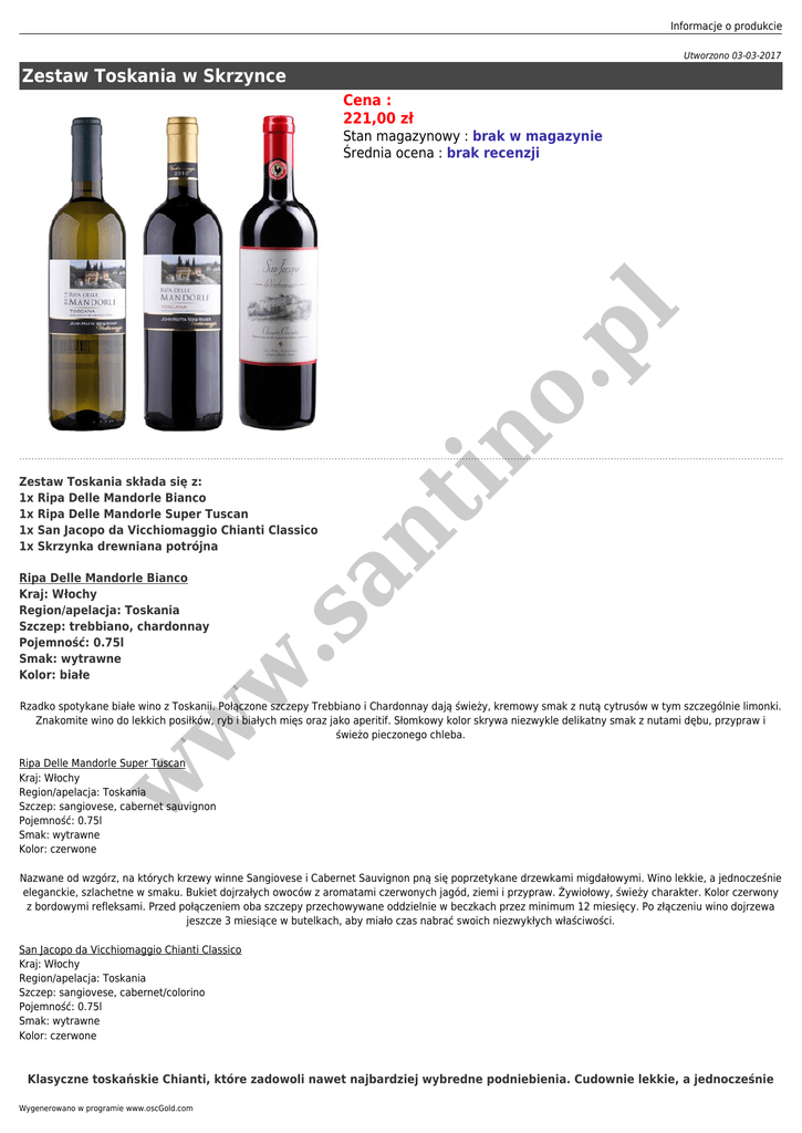 Informacje o produkcie Utworzono 03-03-2017 Zestaw Toskania w Skrzynce Cena : 221,00 zł .s w Ripa Delle Mandorle Bianco Kraj: Włochy Region/apelacja: Toskania Szczep: trebbiano, chardonnay Pojemność: 0.75l Smak: wytrawne Kolor: białe an t Zestaw Toskania składa się z: 1x Ripa Delle Mandorle Bianco 1x Ripa Delle Mandorle Super Tuscan 1x San Jacopo da Vicchiomaggio Chianti Classico 1x Skrzynka drewniana potrójna in o. pl Stan magazynowy : brak w magazynie Średnia ocena : brak recenzji w w Rzadko spotykane białe wino z Toskanii. Połączone szczepy Trebbiano i Chardonnay dają świeży, kremowy smak z nutą cytrusów w tym szczególnie limonki. Znakomite wino do lekkich posiłków, ryb i białych mięs oraz jako aperitif. Słomkowy kolor skrywa niezwykle delikatny smak z nutami dębu, przypraw i świeżo pieczonego chleba. Ripa Delle Mandorle Super Tuscan Kraj: Włochy Region/apelacja: Toskania Szczep: sangiovese, cabernet sauvignon Pojemność: 0.75l Smak: wytrawne Kolor: czerwone Nazwane od wzgórz, na których krzewy winne Sangiovese i Cabernet Sauvignon pną się poprzetykane drzewkami migdałowymi. Wino lekkie, a jednocześnie eleganckie, szlachetne w smaku. Bukiet dojrzałych owoców z aromatami czerwonych jagód, ziemi i przypraw. Żywiołowy, świeży charakter. Kolor czerwony z bordowymi refleksami. Przed połączeniem oba szczepy przechowywane oddzielnie w beczkach przez minimum 12 miesięcy. Po złączeniu wino dojrzewa jeszcze 3 miesiące w butelkach, aby miało czas nabrać swoich niezwykłych właściwości. San Jacopo da Vicchiomaggio Chianti Classico Kraj: Włochy Region/apelacja: Toskania Szczep: sangiovese, cabernet/colorino Pojemność: 0.75l Smak: wytrawne Kolor: czerwone Klasyczne toskańskie Chianti, które zadowoli nawet najbardziej wybredne podniebienia. Cudownie lekkie, a jednocześnie Wygenerowano w programie www.oscGold.com pełne i delikatne w smaku. Owocowy charakter z wyczuwalnymi nutkami wiśni i malin, a także białej czekolady i wanilii. Świeży aromat z wyczuwalnymi przyprawami, szafranem i cynamonem. Głęboki purpurowy kolor z ceglastymi refleksami. Dojrzewa przez co najmniej 12 miesięcy w dębowych beczkach. Legendarny zamek, którego korzenie sięgają V wieku jest uważany za jeden z najpiękniejszych w całej Toskanii. Ulokowany w ścisłym centrum historycznego regionu Chianti, w połowie drogi między Florencją a Sieną jest klejnotem pośród wzgórz usłanych winną latoroślą. Wybudowany jako rezydencja lordów rodu Lombardów, pełnił funkcje obronne jako wysunięta stanica strzegąca pobliskiej Florencji w czasie konfliktów ze Sieną. W renesansie budowla warowna została przekształcona w ekskluzywną posiadłość, gdzie natchnienia szukali wielcy tego świata, w tym sam Leonardo da Vinci, który był tam częstym gościem podczas malowania Mona Lisy, czy też Francisco Redi, twórca między innymi książki „Bachus w Toskanii”. Dziś średniowieczne mury w kolorze piaskowca majestatycznie górują nad zielonymi wzgórzami porośniętymi winogronami Sangiovese oraz drzewkami migdałowymi i oliwnymi. Tworzy to niesamowitą panoramę, a padające promienie słoneczne sprawiają, że atmosfera spędzanych tu chwil staje się bajkowa. w w w .s an t in o. pl Przełomowy dla historii winnicy i zamku okazał się wiek XX, gdy jego właścicielem został wielki znawca win i znakomity winemaker John Matta z żoną Paolą. Ich ogromna pasja i zaangażowanie oraz wspaniałe warunki enologiczne regionu Chianti zaowocowały powstaniem kolekcji win typu Chianti i Super Toskan. Pasja i mistrzostwo zostały docenione w 1997 roku przez przyznanie tytulu najlepszego winiarza Włoch. Osiągnięcie to udało się powtórzyć w latach 2002, 2005 oraz 2010. Winiarnia należy do prestiżowego Comitato Grandi Cru d'Italia – stowarzyszenia 140 najlepszych włoskich winiarni.