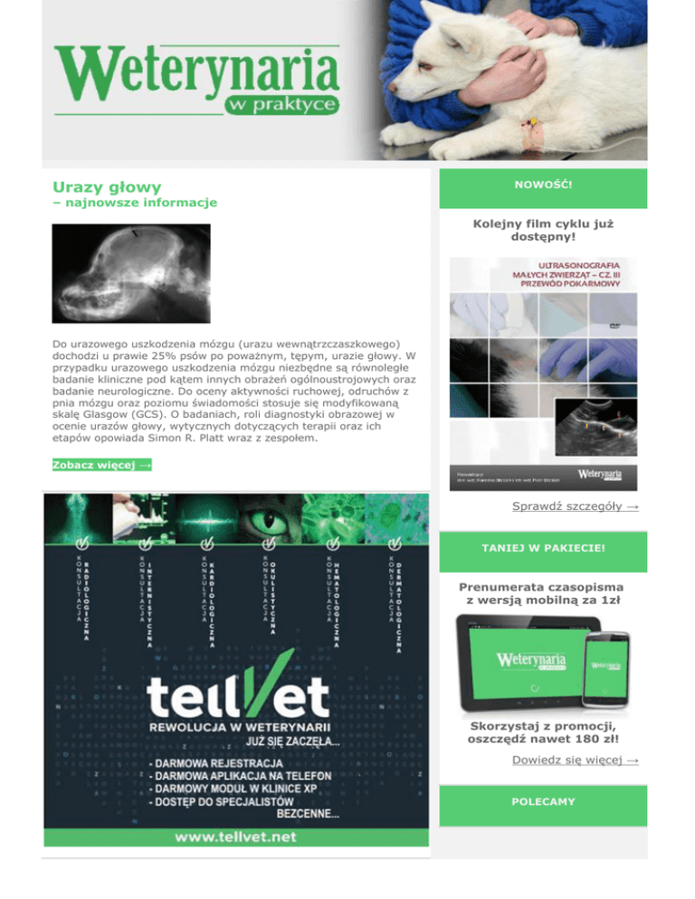 Urazy głowy NOWOŚĆ! – najnowsze informacje Kolejny film cyklu już dostępny! Do urazowego uszkodzenia mózgu (urazu wewnątrzczaszkowego) dochodzi u prawie 25% psów po poważnym, tępym, urazie głowy. W przypadku urazowego uszkodzenia mózgu niezbędne są równoległe badanie kliniczne pod kątem innych obrażeń ogólnoustrojowych oraz badanie neurologiczne. Do oceny aktywności ruchowej, odruchów z pnia mózgu oraz poziomu świadomości stosuje się modyfikowaną skalę Glasgow (GCS). O badaniach, roli diagnostyki obrazowej w ocenie urazów głowy, wytycznych dotyczących terapii oraz ich etapów opowiada Simon R. Platt wraz z zespołem. Zobacz więcej → Sprawdź szczegóły → TANIEJ W PAKIECIE! Prenumerata czasopisma z wersją mobilną za 1zł Skorzystaj z promocji, oszczędź nawet 180 zł! Dowiedz się więcej → POLECAMY Wątroba i drogi żółciowe w badaniu ultrasonograficznym psów i kotów. Cz. I Badanie ultrasonograficzne stało się podstawową techniką obrazowania jamy brzusznej. W przeszłości stanowiło uzupełnienie badania radiologicznego. Obecnie zastępuje radiografię i jest pierwszym badaniem obrazowym jamy brzusznej zwłaszcza podczas diagnozy wątroby, naczyń w obrębie tego narządu i jego okolicach oraz dróg żółciowych. Pełne badanie USG jamy brzusznej jest zalecane u każdego zwierzęcia. Badanie USG pozwala ocenić stan narządów jamy brzusznej i wykryć nawet drobne nieprawidłowości w ich budowie. Karolina Błasiak wraz z zespołem opisuje jak przygotować pacjenta do badania, charakteryzując przy tym różne techniki badań. Dowiedzą się Państwo również m.in. jak powinien wyglądać prawidłowy obraz wątroby. Zobacz więcej → Nadciśnienie płucne u psów i kotów POLECAMY Nadciśnienie płucne jest schorzeniem, które często towarzyszy zarówno chorobom serca, jak i chorobom płuc. Jest wiele przyczyn nadciśnienia płucnego. Najczęściej towarzyszy ono chorobom w fazie ciężkiej. Diagnostyka nadciśnienia płucnego wymaga doświadczenia oraz badań dodatkowych, jednak jego rozpoznanie jest niezbędne w celu wprowadzenia odpowiedniej terapii, a co za tym idzie – wydłużeniu życia i jego jakości u naszego pacjenta. O przyczynach, diagnozie oraz leczeniu opowiada Marta Parzeniecka-Jaworska wraz z Magdaleną Garncarz. Zobacz więcej → Redakcja „Weterynarii w Praktyce” 40-203 Katowice Al. Roździeńskiego 188 tel. 32 788 51 57, tel/fax 32 788 51 65, e-mail: [email protected] WWW: www.weterynaria.elamed.pl