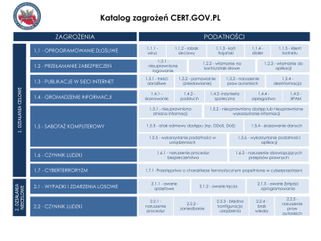Katalog zagrożeń CERT.GOV.PL ZAGROŻENIA 1.1 - OPROGRAMOWANIE ZŁOŚLIWE 1. DZIAŁANIA CELOWE 1.2 - PRZEŁAMANIE ZABEZPIECZEŃ 1.1.1 wirus 1.1.2 - robak sieciowy 1.2.1 nieuprawnione logowanie 1.3 - PUBLIKACJE W SIECI INTERNET 1.3.1 - treści obraźliwe 1.4 - GROMADZENIE INFORMACJI 1.4.1 skanowanie 1.1.3 - koń trojański 1.5 - SABOTAŻ KOMPUTEROWY 1.7 - CYBERTERRORYZM 2.1 - WYPADKI I ZDARZENIA LOSOWE 2.2 - CZYNNIK LUDZKI 1.1.4 dialer 1.2.2 - włamanie na konto/ataki siłowe 1.3.2 - pomawianie (zniesławianie) 1.4.2 podsłuch 1.1.5 - klient botnetu 1.2.3 - włamanie do aplikacji 1.3.3 - naruszenie praw autorskich 1.4.3 -inżynieria społeczna 1.5.1 - nieuprawniona zmiana informacji 1.6 - CZYNNIK LUDZKI 2. DZIAŁANIA NIECELOWE PODATNOŚCI 1.3.4 dezinformacja 1.4.4 szpiegostwo 1.4.5 SPAM 1.5.2 - nieuprawniony dostęp lub nieuprawnione wykorzystanie informacji 1.5.3 - atak odmowy dostępu (np. DDoS, DoS) 1.5.4 - skasowanie danych 1.5.5 - wykorzystanie podatności w urządzeniach 1.5.6 - wykorzystanie podatności aplikacji 1.6.1 - naruszenie procedur bezpieczeństwa 1.6.2 - naruszenie obowiązujących przepisów prawnych 1.7.1 -Przestępstwo o charakterze terrorystycznym popełnione w cyberprzestrzeni 2.1.1 - awarie sprzętowe 2.2.1 naruszenie procedur 2.1.2 - awarie łącza 2.2.2 zaniedbanie 2.2.3 - błędna konfiguracja urządzenia 2.1.3 - awarie (błędy) oprogramowania 2.2.4 brak wiedzy 2.2.5 naruszenie praw autorskich