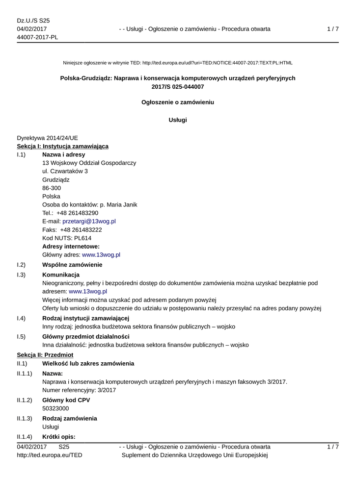 Dz.U./S S25 04/02/2017 44007-2017-PL - - Usługi - Ogłoszenie o zamówieniu - Procedura otwarta 1/7 Niniejsze ogłoszenie w witrynie TED: http://ted.europa.eu/udl?uri=TED:NOTICE:44007-2017:TEXT:PL:HTML Polska-Grudziądz: Naprawa i konserwacja komputerowych urządzeń peryferyjnych 2017/S 025-044007 Ogłoszenie o zamówieniu Usługi Dyrektywa 2014/24/UE Sekcja I: Instytucja zamawiająca I.1) Nazwa i adresy 13 Wojskowy Oddział Gospodarczy ul. Czwartaków 3 Grudziądz 86-300 Polska Osoba do kontaktów: p. Maria Janik Tel.: +48 261483290 E-mail: [email protected] Faks: +48 261483222 Kod NUTS: PL614 Adresy internetowe: Główny adres: www.13wog.pl I.2) Wspólne zamówienie I.3) Komunikacja Nieograniczony, pełny i bezpośredni dostęp do dokumentów zamówienia można uzyskać bezpłatnie pod adresem: www.13wog.pl Więcej informacji można uzyskać pod adresem podanym powyżej Oferty lub wnioski o dopuszczenie do udziału w postępowaniu należy przesyłać na adres podany powyżej I.4) Rodzaj instytucji zamawiającej Inny rodzaj: jednostka budżetowa sektora finansów publicznych – wojsko I.5) Główny przedmiot działalności Inna działalność: jednostka budżetowa sektora finansów publicznych – wojsko Sekcja II: Przedmiot II.1) Wielkość lub zakres zamówienia II.1.1) Nazwa: Naprawa i konserwacja komputerowych urządzeń peryferyjnych i maszyn faksowych 3/2017. Numer referencyjny: 3/2017 II.1.2) Główny kod CPV 50323000 II.1.3) Rodzaj zamówienia Usługi II.1.4) Krótki opis: 04/02/2017 S25 http://ted.europa.eu/TED - - Usługi - Ogłoszenie o zamówieniu - Procedura otwarta Suplement do Dziennika Urzędowego Unii Europejskiej 1/7 Dz.U./S S25 04/02/2017 44007-2017-PL - - Usługi - Ogłoszenie o zamówieniu - Procedura otwarta 2/7 Przedmiotem zamówienia jest świadczenie napraw i konserwacji (serwisowania) komputerowych urządzeń peryferyjnych oraz maszyn faksowych zgodnie z wymaganiami, instrukcjami obsługi lub eksploatacji danego urządzenia (i inną dokumentacją o ile dotyczy) oraz szczegółowym opisem przedmiotu zamówienia I jego zakresem oraz na warunkach określonych przez Zamawiającego. W przypadku Wykonawców wspólnie ubiegających się o udzielenie zamówienia warunki, o których mowa zostaną spełnione wyłącznie jeżeli co najmniej jeden z Wykonawców spełnia jednocześnie warunki w zakresie zdolności zawodowej i ten Wykonawca będzie faktycznie realizował tę część zamówienia, w której wykazał spełnienie warunku udziału, o którym mowa. II.1.5) Szacunkowa całkowita wartość II.1.6) Informacje o częściach To zamówienie podzielone jest na części: nie II.2) Opis II.2.1) Nazwa: II.2.2) Dodatkowy kod lub kody CPV 50314000 II.2.3) Miejsce świadczenia usług Kod NUTS: PL61 II.2.4) Opis zamówienia: Obowiązkiem Wykonawcy jest utrzymanie wszystkich wykazanych urządzeń w stałej i pełnej gotowości do pracy, wykonywanie niezbędnych napraw, ewentualne zastępowanie urządzeń, których nie udało się niezwłocznie naprawić, innymi urządzeniami dostarczonymi przez Wykonawcę, systematyczne monitorowanie i raportowanie o stanie urządzeń za pomocą odpowiedniego oprogramowania lub i innych czynności koniecznych do weryfikacji poprawności działania urządzeń. Zakres wykonania usługi obejmuje w szczególności: Serwisowanie (przeglądy i konserwacja): wydruki próbne przed serwisem, czyszczenie szyb zespołów lasera, czyszczenie luster, czyszczenie szyby ekranu, sprawdzenie stanu zespołu utrwalania, sprawdzenie stanów czterech zespołów obrazu (4) – w przypadku urządzeń kolorowych, demontaż, sprawdzenie i montaż zespołu taśmy transferowej, sprawdzenie i ewentualne czyszczenie w zespole pobierania papieru, czyszczenie czujników optycznych podajnika, czyszczenie rolek pobierających w podajniku automatycznym, czyszczenie i sprawdzenie poprawności działania czujników ID (2), czyszczenie wewnątrz i na zewnątrz maszyny, regulacje parametrów eksploatacyjnych, korekta wewnętrznych nastaw mechanicznych oraz wykonanie kopii kontrolnych, kalibracja zbieżności kolorów – w przypadku urządzeń kolorowych, sprawdzenie poprawności działania finisher'a oraz modułów dodatkowych i testy kontrolne, korygowanie problemów zgłaszanych przez użytkownika w zakresie ustawień sieciowych lub systemowych urządzenia. 04/02/2017 S25 http://ted.europa.eu/TED - - Usługi - Ogłoszenie o zamówieniu - Procedura otwarta Suplement do Dziennika Urzędowego Unii Europejskiej 2/7 Dz.U./S S25 04/02/2017 44007-2017-PL - - Usługi - Ogłoszenie o zamówieniu - Procedura otwarta 3/7 Serwis urządzeń będzie miał miejsce 2 x w roku kalendarzowym (w każdym roku realizacji umowy) w szczegółowo uzgodnionym terminie z Zamawiającym. Naprawy: diagnostyka urządzeń, dokonywanie interwencji wymaganych przez komunikaty sygnalizowane przez urządzenia; wykonanie napraw bieżących, usuwanie usterek, instalacji oprogramowania (o ile dotyczy i będzie to niezbędne) utylizacja wymienionych części i materiałów eksploatacyjnych zgodnie z przepisami w danej mierze obowiązujących, montaż nowych części zamiennych, regulacje parametrów eksploatacyjnych urządzenia, korekta wewnętrznych nastaw mechanicznych oraz wykonanie kopii kontrolnych, inne niewymienione powyżej czynności wymagane w celu usprawnienia sprzętu. Naprawy będą następowały w sposób bieżący, według potrzeb i na warunkach określonych umową. Realizacja usługi odbywać się będzie w siedzibie Użytkowników urządzeń peryferyjnych oraz maszyn faksowych. Dopuszcza się możliwość wykonania naprawy w miejscu wyznaczonym przez Wykonawcę jeżeli wykonanie usługi na terenie danego Użytkownika nie będzie możliwe, a Wykonawca uzyska w tym zakresie zgodę Zamawiającego (w formie e-mail lub faksu). Faktyczne wykonanie usługi w tym przypadku będzie możliwe po wcześniejszym wymontowaniu i pozostawieniu u Zamawiającego pamięci lub dysków twardych urządzeń (o ile dotyc