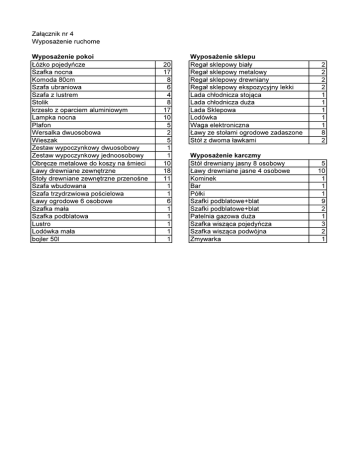 Załącznik nr 4 Wyposażenie ruchome Wyposażenie pokoi Łóżko pojedyńcze Szafka nocna Komoda 80cm Szafa ubraniowa Szafa z lustrem Stolik krzesło z oparciem aluminiowym Lampka nocna Plafon Wersalka dwuosobowa Wieszak Zestaw wypoczynkowy dwuosobowy Zestaw wypoczynkowy jednoosobowy Obręcze metalowe do koszy na śmieci Ławy drewniane zewnętrzne Stoły drewniane zewnętrzne przenośne Szafa wbudowana Szafa trzydrzwiowa pościelowa Ławy ogrodowe 6 osobowe Szafka mała Szafka podblatowa Lustro Lodówka mała bojler 50l 20 17 8 6 4 8 17 10 5 2 5 1 1 10 18 11 1 1 6 1 1 1 1 1 Wyposażenie sklepu Regał sklepowy biały Regał sklepowy metalowy Regał sklepowy drewniany Regał sklepowy ekspozycyjny lekki Lada chłodnicza stojąca Lada chłodnicza duża Lada Sklepowa Lodówka Waga elektroniczna Ławy ze stołami ogrodowe zadaszone Stół z dwoma ławkami Wyposażenie karczmy Stół drewniany jasny 8 osobowy Ławy drewniane jasne 4 osobowe Kominek Bar Półki Szafki podblatowe+blat Szafki podblatowe+blat Patelnia gazowa duża Szafka wisząca pojedyńcza Szafka wisząca podwójna Zmywarka 2 2 2 2 1 1 1 1 1 8 2 5 10 1 1 1 9 2 1 3 2 1