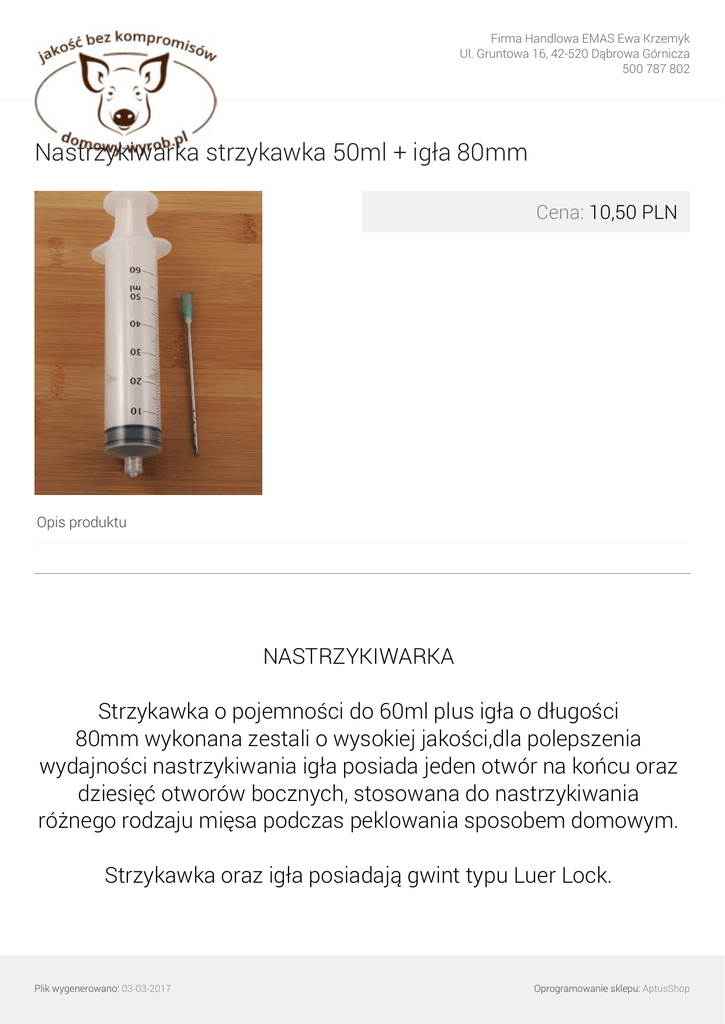 Firma Handlowa EMAS Ewa Krzemyk Ul. Gruntowa 16, 42-520 Dąbrowa Górnicza 500 787 802 Nastrzykiwarka strzykawka 50ml + igła 80mm Cena: 10,50 PLN Opis produktu NASTRZYKIWARKA Strzykawka o pojemności do 60ml plus igła o długości 80mm wykonana zestali o wysokiej jakości,dla polepszenia wydajności nastrzykiwania igła posiada jeden otwór na końcu oraz dziesięć otworów bocznych, stosowana do nastrzykiwania różnego rodzaju mięsa podczas peklowania sposobem domowym. Strzykawka oraz igła posiadają gwint typu Luer Lock. Plik wygenerowano: 03-03-2017 Oprogramowanie sklepu: AptusShop Firma Handlowa EMAS Ewa Krzemyk Ul. Gruntowa 16, 42-520 Dąbrowa Górnicza 500 787 802 Plik wygenerowano: 03-03-2017 Powered by TCPDF (www.tcpdf.org) Oprogramowanie sklepu: AptusShop