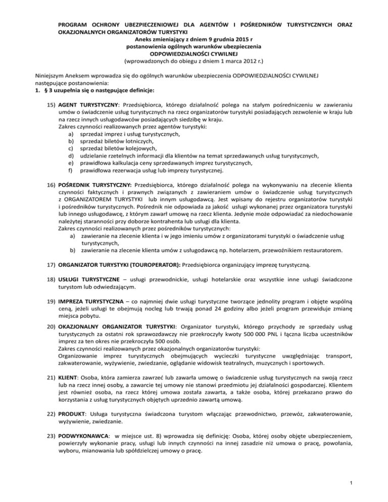 PROGRAM OCHRONY UBEZPIECZENIOWEJ DLA AGENTÓW I POŚREDNIKÓW TURYSTYCZNYCH ORAZ OKAZJONALNYCH ORGANIZATORÓW TURYSTYKI Aneks zmieniający z dniem 9 grudnia 2015 r postanowienia ogólnych warunków ubezpieczenia ODPOWIEDZIALNOŚCI CYWILNEJ (wprowadzonych do obiegu z dniem 1 marca 2012 r.) Niniejszym Aneksem wprowadza się do ogólnych warunków ubezpieczenia ODPOWIEDZIALNOŚCI CYWILNEJ następujące postanowienia: 1. § 3 uzupełnia się o następujące definicje: 15) AGENT TURYSTYCZNY: Przedsiębiorca, którego działalność polega na stałym pośredniczeniu w zawieraniu umów o świadczenie usług turystycznych na rzecz organizatorów turystyki posiadających zezwolenie w kraju lub na rzecz innych usługodawców posiadających siedzibę w kraju. Zakres czynności realizowanych przez agentów turystyki: a) sprzedaż imprez i usług turystycznych, b) sprzedaż biletów lotniczych, c) sprzedaż biletów kolejowych, d) udzielanie rzetelnych informacji dla klientów na temat sprzedawanych usług turystycznych, e) prawidłowa kalkulacja ceny sprzedawanych imprez turystycznych, f) prawidłowa rezerwacja usług lub imprezy turystycznej. 16) POŚREDNIK TURYSTYCZNY: Przedsiębiorca, którego działalność polega na wykonywaniu na zlecenie klienta czynności faktycznych i prawnych związanych z zawieraniem umów o świadczenie usług turystycznych z ORGANIZATOREM TURYSTYKI lub innym usługodawcą. Jest wpisany do rejestru organizatorów turystyki i pośredników turystycznych. Pośrednik nie odpowiada za jakość usługi wykonanej przez organizatora turystyki lub innego usługodawcę, z którym zawarł umowę na rzecz klienta. Jedynie może odpowiadać za niedochowanie należytej staranności przy doborze kontrahenta lub usługi dla klienta. Zakres czynności realizowanych przez pośredników turystycznych: a) zawieranie na zlecenie klienta i w jego imieniu umów z organizatorami turystyki o świadczenie usług turystycznych, b) zawieranie na zlecenie klienta umów z usługodawcą np. hotelarzem, przewoźnikiem restauratorem. 17) ORGANIZATOR TURYSTYKI (TOUROPERATOR): Przedsiębiorca organizujący imprezę turystyczną. 18) USŁUGI TURYSTYCZNE – usługi przewodnickie, usługi hotelarskie oraz wszystkie inne usługi świadczone turystom lub odwiedzającym. 19) IMPREZA TURYSTYCZNA – co najmniej dwie usługi turystyczne tworzące jednolity program i objęte wspólną ceną, jeżeli usługi te obejmują nocleg lub trwają ponad 24 godziny albo jeżeli program przewiduje zmianę miejsca pobytu. 20) OKAZJONALNY ORGANIZATOR TURYSTYKI: Organizator turystyki, którego przychody ze sprzedaży usług turystycznych za ostatni rok sprawozdawczy nie przekroczyły kwoty 500 000 PNL i łączna liczba uczestników imprez za ten okres nie przekroczyła 500 osób. Zakres czynności realizowanych przez okazjonalnych organizatorów turystyki: Organizowanie imprez turystycznych obejmujących wycieczki turystyczne uwzględniając transport, zakwaterowanie, wyżywienie, zwiedzanie, oglądanie widowisk teatralnych, muzycznych i sportowych. 21) KLIENT: Osoba, która zamierza zawrzeć lub zawarła umowę o świadczenie usług turystycznych na swoją rzecz lub na rzecz innej osoby, a zawarcie tej umowy nie stanowi przedmiotu jej działalności gospodarczej. Klientem jest również osoba, na rzecz której umowa została zawarta, a także osoba, której przekazano prawo do korzystania z usług turystycznych objętych uprzednio zawartą umową. 22) PRODUKT: Usługa turystyczna świadczona turystom włączając przewodnictwo, przewóz, zakwaterowanie, wyżywienie, zwiedzanie. 23) PODWYKONAWCA: w miejsce ust. 8) wprowadza się definicję: Osoba, której osoby objęte ubezpieczeniem, powierzyły wykonanie pracy, usługi lub innych czynności na innej zasadzie niż umowa o pracę, powołania, wyboru, mianowania lub spółdzielczej umowy o pracę. 1 2. § 4 dopisuje się ust. 6 w brzmieniu: „Towarzystwo ponosi odpowiedzialność za szkody powstałe w następstwie błędnej lub niepełnej informacji, bądź informacji, która nie została przekazana przez agenta turystycznego Klientowi w wymaganym terminie lub nie została przekazana w ogóle, chociaż powinna była być przekazana. Warunkiem przyjęcia odpowiedzialności za szkody powstałe w następstwie informacji błędnej lub niepełnej jest pisemna forma informacji (dopuszcza się e-mail lub SMS). Towarzystwo nie przyjmuje odpowiedzialności za szkody powstałe w następstwie błędnej lub niepełnej informacji przekazanej w formie ustnej (rozmowa bezpośrednia lub telefoniczna).” 3. § 6 1) w ust. 1 pkt 10 wykreśla się dotychczasowy zapis i otrzymuje on brzmienie „polegające na niewywiązaniu się z wszelkich zobowiązań płatniczych Ubezpieczonego.” 2) dopisuje się ust. 1 pkt. 28 w brzmieniu: „powstałe w następstwie błędów lub zaniedbań leżących po stronie organizatora turystyki, w tym również z tytułu szkód powstałych w następstwie braku informacji lub nieterminowo przekazanej informacji przez organizatora turystyki agentowi turystycznemu, również szkód powstałych w następstwie przekazania informacji błędnych lub niepełnych.” 3) dopisuje się ust. 1 pkt. 29 w brzmieniu: „podlegające jakiemukolwiek ubezpieczeniu obowiązkowemu, w szczególności obowiązkowemu ubezpieczeniu na rzecz klientów w związku z działalnością wykonywaną przez organizatorów turystyki i pośredników turystycznych niezależnie od tego czy obowiązek ten został spełniony.” 4) dopisuje się ust. 4 w brzmieniu: „Zakres ubezpieczenia dla organizatorów turystyki i pośredników turystycznych nie obejmuje odpowiedzialności cywilnej za szkody powstałe w następstwie błędnej lub niepełnej informacji oraz nie obejmuje odpowiedzialności za szkody powstałe w następstwie błędnej kalkulacji ceny imprezy turystycznej.” 4. § 11 dopisuje się ust. 5 w brzmieniu: „Maksymalna suma gwarancyjna dla szkód określonych w § 4 ust. 6 wynosi 100 000 