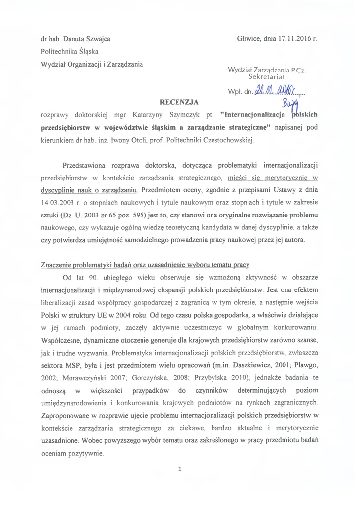 dr hab. Danuta Szwajca Gliwice, dnia 17.11.2016 r. Politechnika Śląska Wydział Organizacji i Zarządzania Wydział Zarządzania P.Cz. Sekretariat RECENZJA rozprawy doktorskiej mgr Katarzyny Szymczyk pt Jyja "Internacjonalizacja polskich przedsiębiorstw w województwie śląskim a zarządzanie strategiczne" napisanej pod kierunkiem dr hab. inż. Iwony Otoli, prof. Politechniki Częstochowskiej Przedstawiona rozprawa doktorska, dotycząca problematyki internacjonalizacji przedsiębiorstw w kontekście zarządzania strategicznego, mieści się merytorycznie w dyscyplinie nauk o zarządzaniu. Przedmiotem oceny, zgodnie z przepisami Ustawy z dnia 14.03.2003 r. o stopniach naukowych i tytule naukowym oraz stopniach i tytule w zakresie sztuki (Dz. U. 2003 nr 65 poz. 595) jest to, czy stanowi ona oryginalne rozwiązanie problemu naukowego, czy wykazuje ogólną wiedzę teoretyczną kandydata w danej dyscyplinie, a także czy potwierdza umiejętność samodzielnego prowadzenia pracy naukowej przez jej autora. Znaczenie problematyki badań oraz uzasadnienie wyboru tematu pracy Od lat 90. ubiegłego wieku obserwuje się wzmożoną aktywność w obszarze internacjonalizacji i międzynarodowej ekspansji polskich przedsiębiorstw. Jest ona efektem liberalizacji zasad współpracy gospodarczej z zagranicą w tym okresie, a następnie wejścia Polski w struktury UE w 2004 roku. Od tego czasu polska gospodarka, a właściwie działające w jej ramach podmioty, zaczęły aktywnie uczestniczyć w globalnym konkurowaniu. Współczesne, dynamiczne otoczenie generuje dla krajowych przedsiębiorstw zarówno szanse, jak i trudne wyzwania Problematyka internacjonalizacji polskich przedsiębiorstw, zwłaszcza sektora MSP, była i jest przedmiotem wielu opracowań (m in. Daszkiewicz, 2001; Plawgo, 2002; Morawczyński 2007; Gorczyńska, 2008; Przybylska 2010), jednakże badania te odnoszą w większości przypadków do czynników determinujących poziom umiędzynarodowienia i konkurowania krajowych podmiotów na rynkach zagranicznych. Zaproponowane w rozprawie ujęcie problemu internacjonalizacji polskich przedsiębiorstw w kontekście zarządzania strategicznego za ciekawe, bardzo aktualne i merytorycznie uzasadnione. Wobec powyższego wybór tematu oraz zakreślonego w pracy przedmiotu badań oceniam pozytywnie. 1 Koncepcja, cele pracy i problem badawczy Tytuł pracy, jasno i jednoznacznie sformułowany, sugeruje podjęty problem badawczy i przedmiot badań. Autorka sformułowała we wstępie cele pracy: główny i szczegółowe, jednak nie dokonała ich wyraźnego podziału na teoretyczne i praktyczne. Odnośnie do celu głównego, który brzmi następująco: "przedstawienie koncepcji internacjonalizacji w podejściu zasobowym nieklasycznym w obszarze zarządzania strategicznego, którego zastosowanie warunkuje rozwój przedsiębiorstw na rynkach zagranicznych", bardziej precyzyjne wydaje się być określenie "weryfikacja", "identyfikacja" zamiast "przedstawienie koncepcji". Cele szczegółowe dotyczą: usystematyzowania dorobku naukowego z zakresu zarządzania strategicznego i strategii internacjonalizacji przedsiębiorstw w oparciu o literaturę naukową, artykuły i akty prawne, identyfikacji poziomu internacjonalizacji polskich przedsiębiorstw w województwie śląskim oraz budowy teoretycznego modelu strategii internacjonalizacji w oparciu o podejście zasobowe nieklasyczne. Problem badawczy został ujęty w formie hipotez: głównej i trzech cząstkowych. W hipotezie głównej założono, że zastosowanie podejścia zasobowego nieklasycznego determinuje internacjonalizację polskich przedsiębiorstw w województwie śląskim Hipotezę główną wsparto trzema następującymi hipotezami cząstkowymi: - internacjonalizacja polskich przedsiębiorstw w województwie śląskim opiera się zasadniczo na modelu upssalskim, - otoczenie warunkuje strategię wyjścia poza rynek polski, która częściej ukierunkowana jest na obrót wewnątrzwspólnotowy, - przedsiębiorstwa w województwie śląskim, które wdrożyły model wczesnej internacjonalizacji, funkcjonują na rynku sprecyzowanym pod kątem klienta, oferują produkty i/lub usługi unikatowe, a podstawą działalności firmy jest umiejętne wykorzystanie technologii informatycznych. Hipotezy pracy, zarówno główną, jak i cząstkowe uznaję za dość jasno i precyzyjnie określone. Metodyka badań Przedmiot badań, realizacja celów rozprawy naukowej, wreszcie rozwiązanie problemu badawczego wymaga zastosowania odpowiednich metod badawczych, a także wykorzystania wielu źródeł danych. W opiniowanej pracy wykorzystano następujące metody badawcze: 2 1) krytyczną analizę literatury krajowej i zagranicznej (350 pozycji, w tym 165 zagranicznych, głównie anglojęzycznych), 2) analizę danych ze źródeł wtórnych, w tym roczników statystycznych GUS, materiałów i dokumentów udostępnionych przez władze województwa śląskiego, stron inetmetowych dotyczących wspierania przedsiębiorczości w regionie śląskim, 3) wywiady pogłębione z wybranymi przedsiębiorstwami województwa śląskiego (N=14), 4) ankietę z wykorzystaniem technik CAWI i CATI na próbie liczącej 100 przedsiębiorstw. Recenzowana praca ma w dużej mierze charakter empiryczny. Dobór i wykorzystanie danych, jak i zastosowane metody badawcze uważam za właściwe i wystarczające. Struktura treści, formalna i merytoryczna ocena rozprawy Praca liczy 203 strony i jest podzielona na pięć rozdziałów, w tym trzy teoretyczne, liczące 91 stron, a dwa empiryczne, zawarte na 82 stronach. Taką strukturę uznaję za poprawną, podobnie jak i objętość całości. Zasadniczym celem części teoretycznej pracy, określonym zresztą przez Doktorantkę jako cel nr 1, jest uporządkowanie pojęć i koncepcji z badanego zakresu poprzez analizę dotychczasowego dorobku naukowego. Tego celu nie udało się Autorce w pełni zrealizować. Przede wszystkim tytuły rozdziałów i poszcz