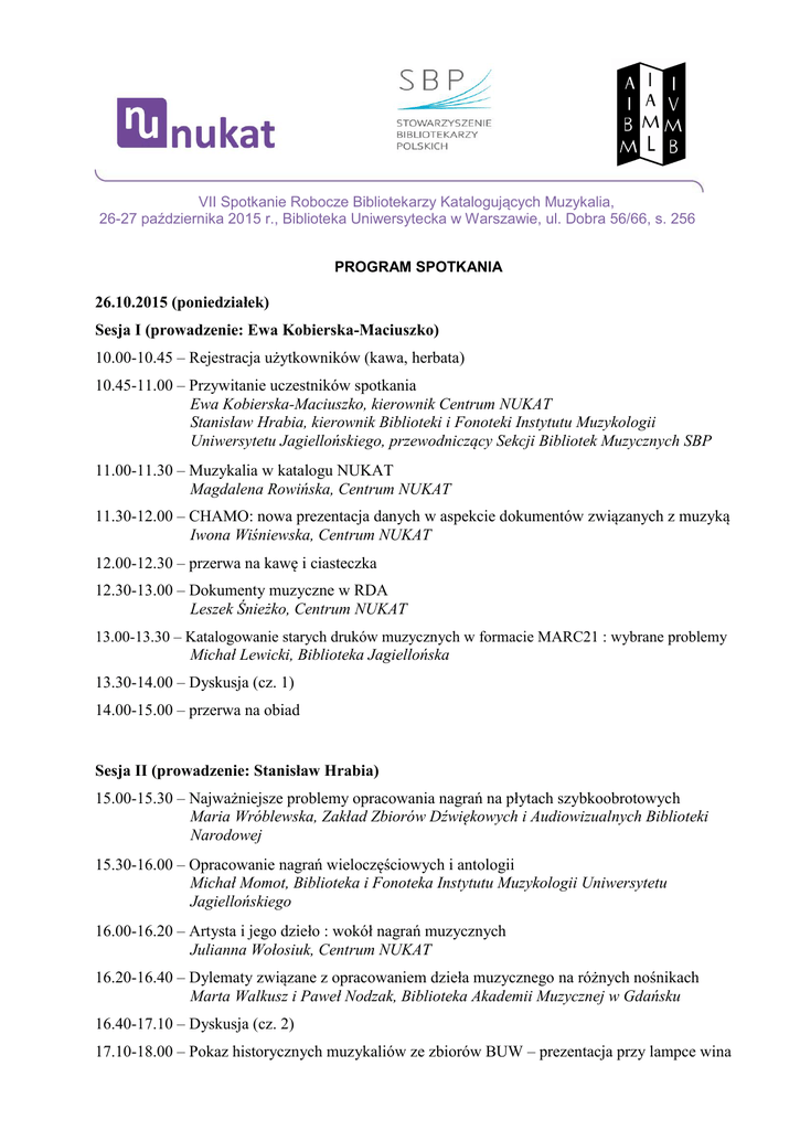 VII Spotkanie Robocze Bibliotekarzy Katalogujących Muzykalia, 26-27 października 2015 r., Biblioteka Uniwersytecka w Warszawie, ul. Dobra 56/66, s. 256 PROGRAM SPOTKANIA 26.10.2015 (poniedziałek) Sesja I (prowadzenie: Ewa Kobierska-Maciuszko) 10.00-10.45 – Rejestracja użytkowników (kawa, herbata) 10.45-11.00 – Przywitanie uczestników spotkania Ewa Kobierska-Maciuszko, kierownik Centrum NUKAT Stanisław Hrabia, kierownik Biblioteki i Fonoteki Instytutu Muzykologii Uniwersytetu Jagiellońskiego, przewodniczący Sekcji Bibliotek Muzycznych SBP 11.00-11.30 – Muzykalia w katalogu NUKAT Magdalena Rowińska, Centrum NUKAT 11.30-12.00 – CHAMO: nowa prezentacja danych w aspekcie dokumentów związanych z muzyką Iwona Wiśniewska, Centrum NUKAT 12.00-12.30 – przerwa na kawę i ciasteczka 12.30-13.00 – Dokumenty muzyczne w RDA Leszek Śnieżko, Centrum NUKAT 13.00-13.30 – Katalogowanie starych druków muzycznych w formacie MARC21 : wybrane problemy Michał Lewicki, Biblioteka Jagiellońska 13.30-14.00 – Dyskusja (cz. 1) 14.00-15.00 – przerwa na obiad Sesja II (prowadzenie: Stanisław Hrabia) 15.00-15.30 – Najważniejsze problemy opracowania nagrań na płytach szybkoobrotowych Maria Wróblewska, Zakład Zbiorów Dźwiękowych i Audiowizualnych Biblioteki Narodowej 15.30-16.00 – Opracowanie nagrań wieloczęściowych i antologii Michał Momot, Biblioteka i Fonoteka Instytutu Muzykologii Uniwersytetu Jagiellońskiego 16.00-16.20 – Artysta i jego dzieło : wokół nagrań muzycznych Julianna Wołosiuk, Centrum NUKAT 16.20-16.40 – Dylematy związane z opracowaniem dzieła muzycznego na różnych nośnikach Marta Walkusz i Paweł Nodzak, Biblioteka Akademii Muzycznej w Gdańsku 16.40-17.10 – Dyskusja (cz. 2) 17.10-18.00 – Pokaz historycznych muzykaliów ze zbiorów BUW – prezentacja przy lampce wina VII Spotkanie Robocze Bibliotekarzy Katalogujących Muzykalia, 26-27 października 2015 r., Biblioteka Uniwersytecka w Warszawie, ul. Dobra 56/66, s. 256 27.10.2015 (wtorek) Sesja III (prowadzenie: Marta Walkusz) 9.30-10.15 – Opery, balety, koncerty jako dokumenty audiowizualne Iwona Leonowicz, Centrum NUKAT 10.15-10.45 – Khw dla muzykaliów : aktualne problemy Monika Bielska, Centrum NUKAT 10.45-11.15 – przerwa na kawę i kanapki 11.15-11.45 – Problemy katalogerów okiem administratora Anna Sobiepanek, Centrum NUKAT 11.45-12.05 – Tematowanie muzykaliów dziś Magdalena Choryło, Centrum NUKAT 12.05-12.30 – Dyskusja (cz. 3) 12.30-13.00 – Podsumowanie i zakończenie spotkania (Stanisław Hrabia, Magdalena Rowińska)