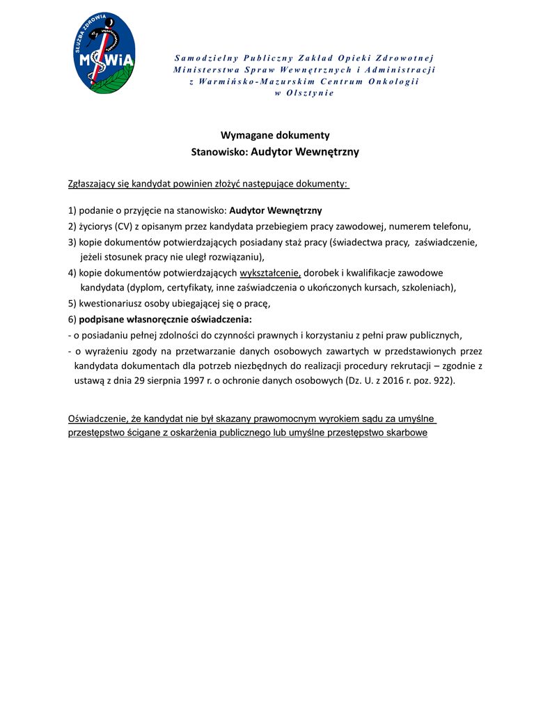 Samodzielny Publiczny Zakład Opieki Zdrowotnej M i n i s t e r s t w a S p r a w We w n ę t r z n y c h i A d m i n i s t r a c j i z Wa r m i ń s k o - M a z u r s k i m C e n t r u m O n k o l o g i i w Olsztynie Wymagane dokumenty Stanowisko: Audytor Wewnętrzny Zgłaszający się kandydat powinien złożyd następujące dokumenty: 1) podanie o przyjęcie na stanowisko: Audytor Wewnętrzny 2) życiorys (CV) z opisanym przez kandydata przebiegiem pracy zawodowej, numerem telefonu, 3) kopie dokumentów potwierdzających posiadany staż pracy (świadectwa pracy, zaświadczenie, jeżeli stosunek pracy nie uległ rozwiązaniu), 4) kopie dokumentów potwierdzających wykształcenie, dorobek i kwalifikacje zawodowe kandydata (dyplom, certyfikaty, inne zaświadczenia o ukooczonych kursach, szkoleniach), 5) kwestionariusz osoby ubiegającej się o pracę, 6) podpisane własnoręcznie oświadczenia: - o posiadaniu pełnej zdolności do czynności prawnych i korzystaniu z pełni praw publicznych, - o wyrażeniu zgody na przetwarzanie danych osobowych zawartych w przedstawionych przez kandydata dokumentach dla potrzeb niezbędnych do realizacji procedury rekrutacji – zgodnie z ustawą z dnia 29 sierpnia 1997 r. o ochronie danych osobowych (Dz. U. z 2016 r. poz. 922). Oświadczenie, że kandydat nie był skazany prawomocnym wyrokiem sądu za umyślne przestępstwo ścigane z oskarżenia publicznego lub umyślne przestępstwo skarbowe