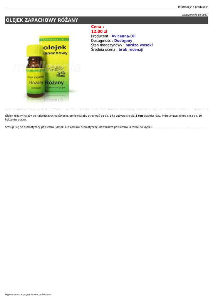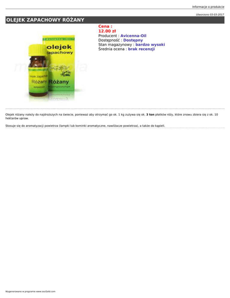 Informacje o produkcie Utworzono 03-03-2017 OLEJEK ZAPACHOWY RÓŻANY Cena : 12.00 zł Producent : Avicenna-Oil Dostępność : Dostępny Stan magazynowy : bardzo wysoki Średnia ocena : brak recenzji Olejek różany należy do najdroższych na świecie, ponieważ aby otrzymać go ok. 1 kg zużywa się ok. 3 ton płatków róży, które znowu zbiera się z ok. 10 hektarów upraw. Stosuje się do aromatyzacji powietrza (lampki lub kominki aromatyczne, nawilżacze powietrza), a także do kąpieli. Wygenerowano w programie www.oscGold.com