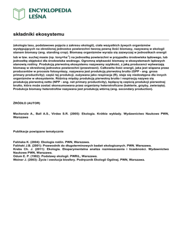 składniki ekosystemu (ekologia lasu, podstawowe pojęcia z zakresu ekologii), ciała wszystkich żywych organizmów występujących na określonej jednostce powierzchni tworzą pewną ilość biomasy, nazywaną w ekologii stanem biomasy (ang. standing crop). Biomasę organizmów wyraża się zazwyczaj w jednostkach energii lub w tzw. suchej masie (np. tony×ha-1) na jednostkę powierzchni w przypadku środowiska lądowego, lub jednostkę objętości dla środowiska wodnego. Ogromną większość biomasy w ekosystemach lądowych stanowią rośliny. Produkcją pierwotną ekosystemu nazywamy szybkość, z jaką producenci wytwarzają biomasę w określonej jednostce powierzchni (przestrzeni). Całkowita ilość energii, jaka jest wiązana przez producentów w procesie fotosyntezy, nazywana jest produkcją pierwotną brutto (GPP - ang. gross primary productivity); część tej produkcji, zużywana jako respiracja (R), staje się niedostępna dla innych organizmów w ekosystemie. Różnicę między produkcją pierwotną brutto i respiracją nazywa się produkcją pierwotną netto (NPP - ang. net primary productivity), będącą tą częścią produkcji pierwotnej brutto, która może zostać skonsumowana przez organizmy heterotroficzne (bakterie, grzyby, zwierzęta). Produkcja biomasy heterotrofów nazywana jest produkcją wtórną (ang. secondary production). ŹRÓDŁO (AUTOR) Mackenzie A., Ball A.S., Virdee S.R. (2005): Ekologia. Krótkie wykłady. Wydawnictwo Naukowe PWN, Warszawa Publikacje powiązane tematycznie Falińska K. (2004): Ekologia roślin. PWN, Warszawa. Faliński J.B. (2001): Przewodnik do długoterminowych badań ekologicznych. PWN. Warszawa. Krebs Ch. J. (2011): Ekologia. Eksperymentalna analiza rozmieszczenia i liczebności. Wydawnictwo Naukowe PWN, Warszawa. Odum E. P. (1982): Podstawy ekologii. PWRiL, Warszawa. Weiner J. (2003): Życie i ewolucja biosfery. Podręcznik Ekologii Ogólnej. PWN, Warszawa.
