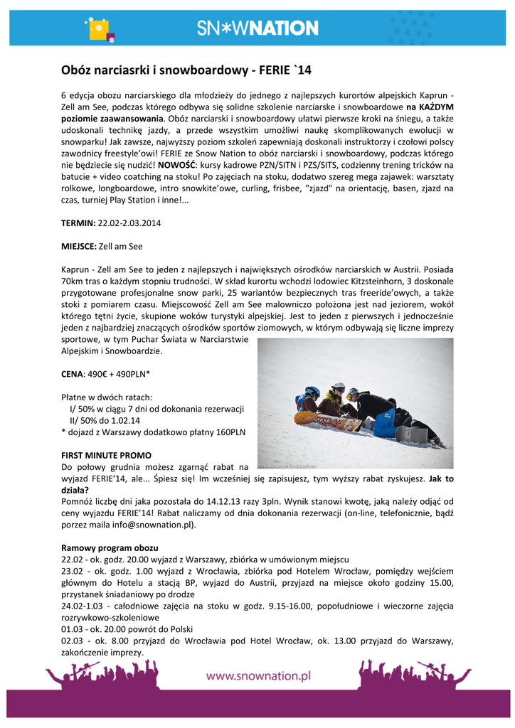 Obóz narciasrki i snowboardowy - FERIE `14 6 edycja obozu narciarskiego dla młodzieży do jednego z najlepszych kurortów alpejskich Kaprun Zell am See, podczas którego odbywa się solidne szkolenie narciarske i snowboardowe na KAŻDYM poziomie zaawansowania. Obóz narciarski i snowboardowy ułatwi pierwsze kroki na śniegu, a także udoskonali technikę jazdy, a przede wszystkim umożliwi naukę skomplikowanych ewolucji w snowparku! Jak zawsze, najwyższy poziom szkoleń zapewniają doskonali instruktorzy i czołowi polscy zawodnicy freestyle’owi! FERIE ze Snow Nation to obóz narciarski i snowboardowy, podczas którego nie będziecie się nudzić! NOWOŚĆ: kursy kadrowe PZN/SITN i PZS/SITS, codzienny trening tricków na batucie + video coatching na stoku! Po zajęciach na stoku, dodatwo szereg mega zajawek: warsztaty rolkowe, longboardowe, intro snowkite’owe, curling, frisbee, "zjazd" na orientację, basen, zjazd na czas, turniej Play Station i inne!... TERMIN: 22.02-2.03.2014 MIEJSCE: Zell am See Kaprun - Zell am See to jeden z najlepszych i największych ośrodków narciarskich w Austrii. Posiada 70km tras o każdym stopniu trudności. W skład kurortu wchodzi lodowiec Kitzsteinhorn, 3 doskonale przygotowane profesjonalne snow parki, 25 wariantów bezpiecznych tras freeride’owych, a także stoki z pomiarem czasu. Miejscowość Zell am See malowniczo położona jest nad jeziorem, wokół którego tętni życie, skupione woków turystyki alpejskiej. Jest to jeden z pierwszych i jednocześnie jeden z najbardziej znaczących ośrodków sportów ziomowych, w którym odbywają się liczne imprezy sportowe, w tym Puchar Świata w Narciarstwie Alpejskim i Snowboardzie. CENA: 490€ + 490PLN* Płatne w dwóch ratach: I/ 50% w ciągu 7 dni od dokonania rezerwacji II/ 50% do 1.02.14 * dojazd z Warszawy dodatkowo płatny 160PLN FIRST MINUTE PROMO Do połowy grudnia możesz zgarnąć rabat na wyjazd FERIE’14, ale... Śpiesz się! Im wcześniej się zapisujesz, tym wyższy rabat zyskujesz. Jak to działa? Pomnóż liczbę dni jaka pozostała do 14.12.13 razy 3pln. Wynik stanowi kwotę, jaką należy odjąć od ceny wyjazdu FERIE’14! Rabat naliczamy od dnia dokonania rezerwacji (on-line, telefonicznie, bądź porzez maila [email protected]). Ramowy program obozu 22.02 - ok. godz. 20.00 wyjazd z Warszawy, zbiórka w umówionym miejscu 23.02 - ok. godz. 1.00 wyjazd z Wrocławia, zbiórka pod Hotelem Wrocław, pomiędzy wejściem głównym do Hotelu a stacją BP, wyjazd do Austrii, przyjazd na miejsce około godziny 15.00, przystanek śniadaniowy po drodze 24.02-1.03 - całodniowe zajęcia na stoku w godz. 9.15-16.00, popołudniowe i wieczorne zajęcia rozrywkowo-szkoleniowe 01.03 - ok. 20.00 powrót do Polski 02.03 - ok. 8.00 przyjazd do Wrocławia pod Hotel Wrocław, ok. 13.00 przyjazd do Warszawy, zakończenie imprezy. Cena zawiera zakwaterowanie w hotelu młodzieżowym*** JUNGES HOTEL AM SEE wraz z pełnym wyżywieniem (tj. śniadania, obiadokolacje, lunch pakiet na stok) 6dniowy skipass (karnet narciarski) obejmujący wszystkie ośrodki kompleksu Kaprun – Zell Am See (jeździmy zarówno na lodowcu Kitzsteinhorn, jak i w niższych partiach gór) przejazd komfortowym autokarem na trasie Wrocław - Zell am See – Wrocław (dojazd z Warszawy odbywa się busem, jest dodatkowo płatny 160pln) SZKOLENIE NARCIARSKIE I SNOWBOARDOWE NA KAŻDYM POZIOME ZAAWANSOWANIA (również dla osób stawiających pierwsze kroki na śniegu!) 1/ szeroki wachlarz zajęć na śniegu - jazda techniczna, elementy freestyle’u i jazdy freeride’owej pod opieką wykwalifikowanych instruktorów i zawodników 2/ szkolenie kadrowe SITN/PZN i PITS/PZS (bez opłat związkowych: wewnętrzny egzamin i opłaty za wydanie dokumentów potwierdzających zdobyte umiejętności) 3/ nowoczesna metodyka nauczania, wykorzystanie wideo analizy i wykłady multimedialne 4/ zawody – slalom gigant i kontest freestyle’owy 5/ narciarsko-snowbaordowe biegi na orientację całodobowa opieka kadry pedagogicznej (doświadczeni pedagodzy z uprawnieniami opiekunów) ubezpieczenie NW, KL, koszty ratownictwa przy odpowiednich warunkach atmosferycznych – bezpieczne INTRO SNOWKITE’OWE pod okiem instruktora International Kiteboarding Organization a ponadto atrakcyjny program popołudniowo-wieczorny: 1/ warsztaty rolkowe, deskorolkowe i longboardowe z utytuowanym zawodnikiem Bartkiem Górczykiem 2/ wieczorny trening tricków na batucie pod okiem instruktorów! 3/ curling! 4/ wyjście na basen 5/ frisbee on ice 6/ projekcje filmów 7/ turnieje: koszykówki, tenisa stołowego, play station i inne!... testowanie desek snowboardowych i nart freeskiingowych bonus: gadżety SNOW NATION !!! Zakwaterowanie i wyżywienie Hotel młodzieżowy*** malowniczo położony jest w miejscowości Zell Am See nad samym brzegiem jeziora Zeller See. Pokoje są w pełni wyposażone i oferują wysoki standard, wszystkie z łazienkami, 2,4,5 i 6 osobowe. Ośrodek posiada salę restauracyjną, wyciszone sale do gier i projekcji filmów, mini-bar i narciarnię. Na dzienne wyżywienie składa się śniadanie w formie bufetu i obiadokolacja, złożona z 3 dań. Ponadto uczestnicy wyjazdu codzinnie otrzymują lunch pakiet na stok. Dojazd do stoku odbywa się spod pensjonatu własnym autokarem i trwa około 5-10minut, w zależności od ośrodka, do którego jedziemy. Opieka Młodzież jest pod stałą opieką instruktorów i opiekunów. Obóz narciarski zapewnia wypełnienie czasu od momentu rozpoczęcia dnia do jego zakończenia. Uczestnicy stosują się do regulaminu wyjazdu. Warunki uczestnictwa 1. wiek 12-19 lat 2. wypełnienie i odesłanie formulazrza zgłoszeniowego uczestnika obozu na adres mailowy: [email protected] lub dostarczenie go osobiście 3. dokonanie wpłaty zaliczki (po otrzymaniu wpłaty, biuro szkoły wysyła potwierdzenie wpisania uczestnika na obóz – stanowi to gwarancję rezerwacji miejsca) oraz pozostałych wpłat w określonym terminie 4. 
