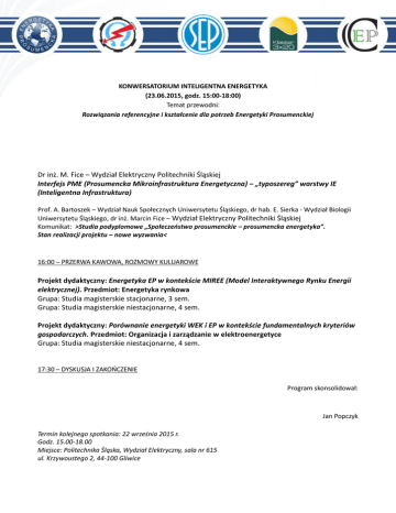 KONWERSATORIUM INTELIGENTNA ENERGETYKA (23.06.2015, godz. 15:00-18:00) Temat przewodni: Rozwiązania referencyjne i kształcenie dla potrzeb Energetyki Prosumenckiej Dr inż. M. Fice – Wydział Elektryczny Politechniki Śląskiej Interfejs PME (Prosumencka Mikroinfrastruktura Energetyczna) – „typoszereg” warstwy IE (Inteligentna Infrastruktura) Prof. A. Bartoszek – Wydział Nauk Społecznych Uniwersytetu Śląskiego, dr hab. E. Sierka - Wydział Biologii Uniwersytetu Śląskiego, dr inż. Marcin Fice – Wydział Elektryczny Politechniki Śląskiej Komunikat: >Studia podyplomowe „Społeczeństwo prosumenckie – prosumencka energetyka”. Stan realizacji projektu – nowe wyzwania< 16:00 – PRZERWA KAWOWA, ROZMOWY KULUAROWE Projekt dydaktyczny: Energetyka EP w kontekście MIREE (Model Interaktywnego Rynku Energii elektrycznej). Przedmiot: Energetyka rynkowa Grupa: Studia magisterskie stacjonarne, 3 sem. Grupa: Studia magisterskie niestacjonarne, 4 sem. Projekt dydaktyczny: Porównanie energetyki WEK i EP w kontekście fundamentalnych kryteriów gospodarczych. Przedmiot: Organizacja i zarządzanie w elektroenergetyce Grupa: Studia magisterskie niestacjonarne, 4 sem. 17:30 – DYSKUSJA I ZAKOŃCZENIE Program skonsolidował: Jan Popczyk Termin kolejnego spotkania: 22 września 2015 r. Godz. 15.00-18.00 Miejsce: Politechnika Śląska, Wydział Elektryczny, sala nr 615 ul. Krzywoustego 2, 44-100 Gliwice