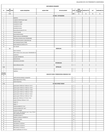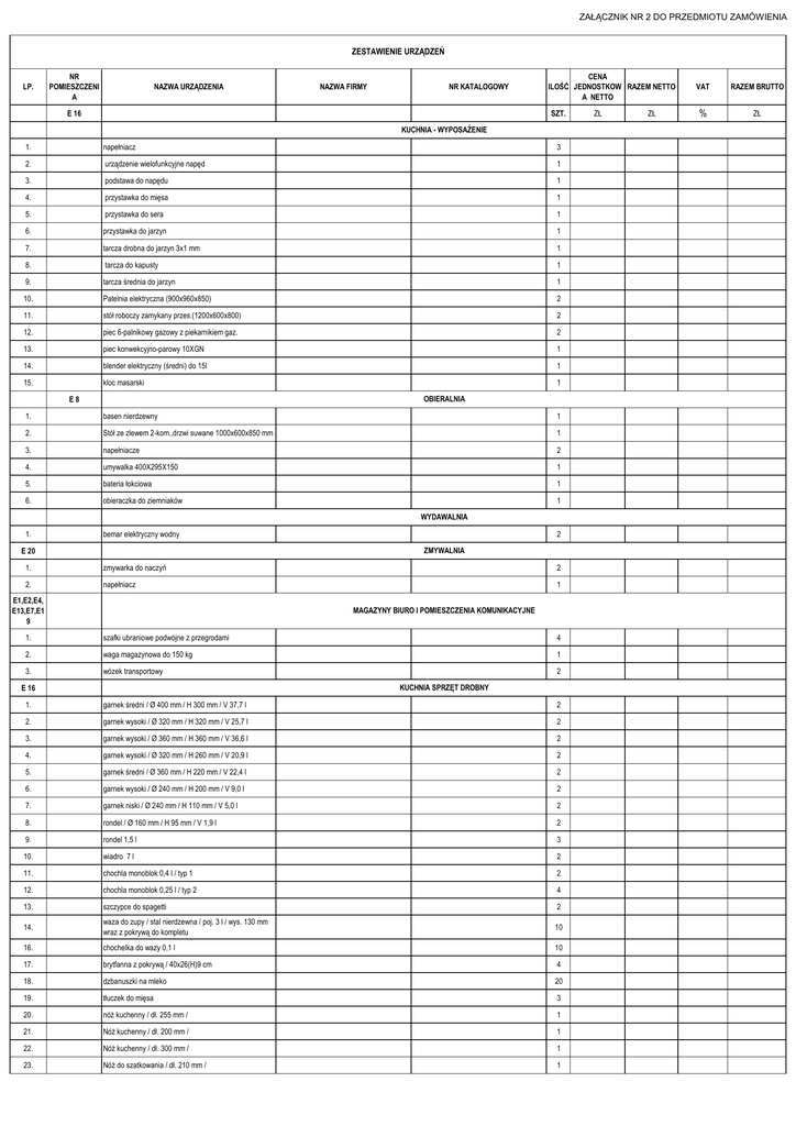 ZAŁĄCZNIK NR 2 DO PRZEDMIOTU ZAMÓWIENIA ZESTAWIENIE URZĄDZEŃ LP. NR POMIESZCZENI A NAZWA URZĄDZENIA NAZWA FIRMY NR KATALOGOWY E 16 CENA ILOŚĆ JEDNOSTKOW RAZEM NETTO A NETTO SZT. KUCHNIA - WYPOSAŻENIE 1. napełniacz 3 2. urządzenie wielofunkcyjne napęd 1 3. podstawa do napędu 1 4. przystawka do mięsa 1 5. przystawka do sera 1 6. przystawka do jarzyn 1 7. tarcza drobna do jarzyn 3x1 mm 1 8. tarcza do kapusty 1 9. tarcza średnia do jarzyn 1 10. Patelnia elektryczna (900x960x850) 2 11. stół roboczy zamykany przes.(1200x600x800) 2 12. piec 6-palnikowy gazowy z piekarnikiem gaz. 2 13. piec konwekcyjno-parowy 10XGN 1 14. blender elektryczny (średni) do 15l 1 15. kloc masarski 1 OBIERALNIA E8 1. basen nierdzewny 1 2. Stół ze zlewem 2-kom.,drzwi suwane 1000x600x850 mm 1 3. napełniacze 2 4. umywalka 400X295X150 1 5. bateria łokciowa 1 6. obieraczka do ziemniaków 1 WYDAWALNIA 1. bemar elektryczny wodny 2 ZMYWALNIA E 20 1. zmywarka do naczyń 2 2. napełniacz 1 E1,E2,E4, E13,E7,E1 9 MAGAZYNY BIURO I POMIESZCZENIA KOMUNIKACYJNE 1. szafki ubraniowe podwójne z przegrodami 4 2. waga magazynowa do 150 kg 1 3. wózek transportowy 2 KUCHNIA SPRZĘT DROBNY E 16 1. garnek średni / Ø 400 mm / H 300 mm / V 37,7 l 2 2. garnek wysoki / Ø 320 mm / H 320 mm / V 25,7 l 2 3. garnek wysoki / Ø 360 mm / H 360 mm / V 36,6 l 2 4. garnek wysoki / Ø 320 mm / H 260 mm / V 20,9 l 2 5. garnek średni / Ø 360 mm / H 220 mm / V 22,4 l 2 6. garnek wysoki / Ø 240 mm / H 200 mm / V 9,0 l 2 7. garnek niski / Ø 240 mm / H 110 mm / V 5,0 l 2 8. rondel / Ø 160 mm / H 95 mm / V 1,9 l 2 9. rondel 1,5 l 3 10. wiadro 7 l 2 11. chochla monoblok 0,4 l / typ 1 2 12. chochla monoblok 0,25 l / typ 2 4 13. szczypce do spagetti 2 14. waza do zupy / stal nierdzewna / poj. 3 l / wys. 130 mm wraz z pokrywą do kompletu 10 16. chochelka do wazy 0,1 l 10 17. brytfanna z pokrywą / 40x26(H)9 cm 4 18. dzbanuszki na mleko 20 19. tłuczek do mięsa 3 20. nóż kuchenny / dł. 255 mm / 1 21. Nóż kuchenny / dł. 200 mm / 1 22. Nóż kuchenny / dł. 300 mm / 1 23. Nóż do szatkowania / dł. 210 mm / 1 ZŁ ZŁ VAT RAZEM BRUTTO % ZŁ ZAŁĄCZNIK NR 2 DO PRZEDMIOTU ZAMÓWIENIA 24. Nóż do szatkowania / dł. 255 mm / 1 25. Nóż do chleba / dł. 235 mm / 1 26. Nóż do chleba / dł. 315 mm / 1 27. Nóż do wędlin / dł. 315 mm / 1 28. Nóż do pieczeni / dł. 230 mm / 1 29. Nóż do filetowania giętki / dł. 220 mm / 1 30. Miska polerowana / Ø28 cm / h 10,8 cm / poj. 4,8 l / 3 31. Miska polerowana / Ø32 cm / h 12 cm / poj. 6,5 l / 4 32. Miska satynowana / Ø38 cm / h 18 cm / poj. 16 l / 2 33. Miska satynowana / Ø30 cm / h 14 cm / poj. 8 l / 2 34. Wanna okrągła / Ø50 cm / h 24,0 cm / 32,5l 2 35. Rózga dł. 300 mm 1 36. Nóż stołowy 100 37. Widelec stołowy 100 38. Łyżka stołowa 100 39. Łyżeczka do herbaty 100 40. Garnek do ryb z pokrywką 600x180x110 mm 41. Talerz płytki / śr. 270 mm / 100 42. Talerz głęboki / poj. 0,33 l / 100 43. Talerz płytki / śr. 190 mm / 100 44. Półmisek owalny / 360x265 mm 45. Kubek do gorących napojów 250 ml 46. Podstawa pod garnki 500x500x450 mm 4 47. dzbanki na herbatę 2l 12 4 6 100 RAZEM