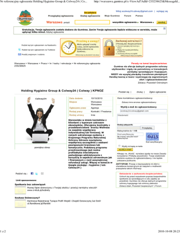 Nr referencyjny ogłoszenia Holding Hygiaino Group & Colway24 ( Co... 1z2 http://warszawa.gumtree.pl/c-ViewAd?AdId=235238625&MessageId... Witaj [email protected] | wyloguj się Przeglądaj ogłoszenia Warszawa Dodaj ogłoszenie Moje Gumtree Forum Pomoc wszystkie ogłoszenia zmień Warszawa szukaj Gratulacje, Twoje ogłoszenie zostało dodane do Gumtree. Zanim Twoje ogłoszenie będzie widoczne w serwisie, może upłynąć kilka minut. Edytuj ogłoszenie Podziel się tym ogłoszeniem na Facebook'u Podziel się tym ogłoszeniem na Twitterze Prześlij znajomym i rodzinie Warszawa > Warszawa > Praca > hr / kadry / rekrutacja > Nr referencyjny ogłoszenia 235238625 Porady na temat bezpieczeństwa: Gumtree nie oferuje żadnych programów ochrony użytkownika i nigdy nie pośredniczy w transakcjach pomiędzy sprzedającym i kupującym. NIGDY nie wysyłaj pieniędzy transferem pieniężnym! Handluj twarzą w twarz i wystrzegaj się zagranicznych ofert i ogłoszeniodawców! Zobacz: Pozostań Ostrożnym Holding Hygiaino Group & Colway24 ( Colway ) KPNOZ powiększ obraz Data dodania 10/10/2010 Miejsce Warszawa Warszawa Ogłaszane przez Agencja Rodzaj pracy Kontrakt / Freelance Rodzaj umowy Inne Stanowiska w dziale kontaktów z klientami z typowym zakresem obowiązków. Oferujemy kontrakty z przedstawicielami branży Wellness na zasadzie współpracy indywidualnej lub firmowej. W ramach wdrażanego systemu z Krajowego Programu Naturalnej Ochrony Zdrowia nawiążemy współpracę szczególnie z osobami powiązanymi branżowo lub tematycznie. Podstawą programu prozdrowotnego jest realna profilaktyka interaktywna podwójnego oddziaływania z korzyścią w aspekcie zdrowotnym jak i finansowym z racji wewnętrznej refundacji usługi. Więcej w temacie w Google szukając : hygiaino ( lub: Colway24 ) Podziel się : Linki sponsorowane Spotkania bez zobowiązań Poznaj fajne dziewczyny z Twojej okolicy i przeżyj namiętny wieczór! www.s-klub.pl/kobiety Podziel się | drukuj | Zgłoś ogłoszenie Dane kontaktowe ogłoszeniodawcy Zobacz inne anonse ogłoszeniodawcy Wyślij e-mail do ogłoszeniodawcy Dodaj załącznik: Maksymalnie do 1 MB Nie możesz odczytać kodu? Odsłuchaj kod Kod weryfikacyjny Wyślij mi kopię e-maila wyślij e-mail Klikając na „Wyślij”, wyrażasz zgodę na nasze Zasady korzystania i Politykę prywatności. Twoja wiadomość zostanie wysłana do ogłoszeniodawcy i nie będzie pokazana publicznie. ANTYSPAM: Proszę o nieprzysyłanie mi ofert o charakterze komercyjnym ani zapytań o możliwość przesyłania takich informacji Ostrzeżenie o zachowaniu bezpieczeństwa: Uchroń się przed oszustwem poprzez bezpośrednie spotkanie ze sprzedającym w celu zapłaty za przedmiot. Gumtree nie oferuje żadnych programów ochrony kupującego lub ochrony płatności. Zobacz dział „Pozostań bezpiecznym” | Forum Szukasz Dziewczyny? Darmowa Rejestracja Tysiące Profli Wejdź i Znajdź Dziewczynę Już Dziś! ul.Randkowa.pl/Randki 2010-10-08 20:23 Nr referencyjny ogłoszenia Holding Hygiaino Group & Colway24 ( Co... 2z2 http://warszawa.gumtree.pl/c-ViewAd?AdId=235238625&MessageId... Agencje Pracy Znajdź biura najbliżej domu! Agencje, biura, pośrednictwo www.pkt.pl Szukasz Elektryka? Zapytaj o usługi elektryków. Oszczędzaj czas i do 30% ceny! AAAZapytanie.pl Opieka Nad Starszymi Nowe Oferty Pracy. Od Zaraz! Legalna Praca nawet 1200€ - Sprawdź www.Promedica24.pl/Praca-Opiekunka Pomoc O nas Polityka prywatności Zasady korzystania Napisz do Gumtree Popularne wyszukiwania Copyright © 2005-2010 Kijiji International Limited. Wszelkie prawa zastrzeżone. Śledź nas na Twitterze 2010-10-08 20:23
