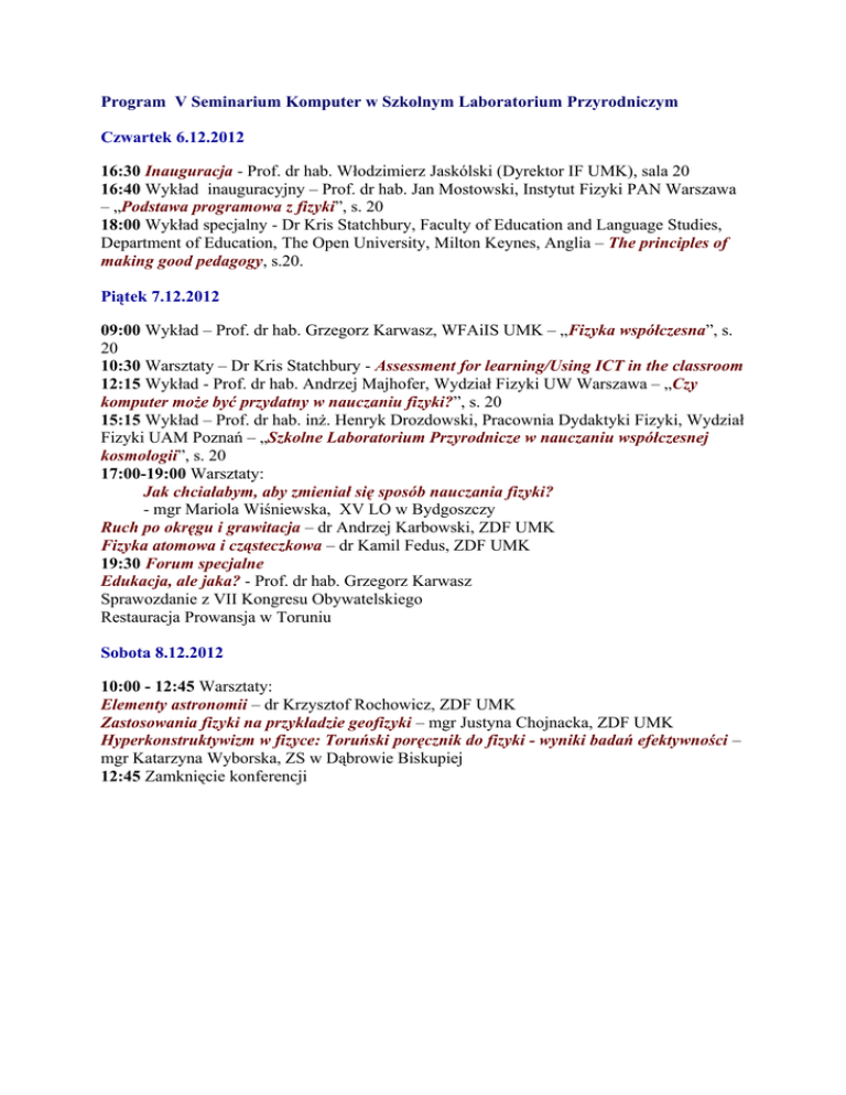 Program V Seminarium Komputer w Szkolnym Laboratorium Przyrodniczym Czwartek 6.12.2012 16:30 Inauguracja - Prof. dr hab. Włodzimierz Jaskólski (Dyrektor IF UMK), sala 20 16:40 Wykład inauguracyjny – Prof. dr hab. Jan Mostowski, Instytut Fizyki PAN Warszawa – „Podstawa programowa z fizyki”, s. 20 18:00 Wykład specjalny - Dr Kris Statchbury, Faculty of Education and Language Studies, Department of Education, The Open University, Milton Keynes, Anglia – The principles of making good pedagogy, s.20. Piątek 7.12.2012 09:00 Wykład – Prof. dr hab. Grzegorz Karwasz, WFAiIS UMK – „Fizyka współczesna”, s. 20 10:30 Warsztaty – Dr Kris Statchbury - Assessment for learning/Using ICT in the classroom 12:15 Wykład - Prof. dr hab. Andrzej Majhofer, Wydział Fizyki UW Warszawa – „Czy komputer może być przydatny w nauczaniu fizyki?”, s. 20 15:15 Wykład – Prof. dr hab. inż. Henryk Drozdowski, Pracownia Dydaktyki Fizyki, Wydział Fizyki UAM Poznań – „Szkolne Laboratorium Przyrodnicze w nauczaniu współczesnej kosmologii”, s. 20 17:00-19:00 Warsztaty: Jak chciałabym, aby zmieniał się sposób nauczania fizyki? - mgr Mariola Wiśniewska, XV LO w Bydgoszczy Ruch po okręgu i grawitacja – dr Andrzej Karbowski, ZDF UMK Fizyka atomowa i cząsteczkowa – dr Kamil Fedus, ZDF UMK 19:30 Forum specjalne Edukacja, ale jaka? - Prof. dr hab. Grzegorz Karwasz Sprawozdanie z VII Kongresu Obywatelskiego Restauracja Prowansja w Toruniu Sobota 8.12.2012 10:00 - 12:45 Warsztaty: Elementy astronomii – dr Krzysztof Rochowicz, ZDF UMK Zastosowania fizyki na przykładzie geofizyki – mgr Justyna Chojnacka, ZDF UMK Hyperkonstruktywizm w fizyce: Toruński poręcznik do fizyki - wyniki badań efektywności – mgr Katarzyna Wyborska, ZS w Dąbrowie Biskupiej 12:45 Zamknięcie konferencji