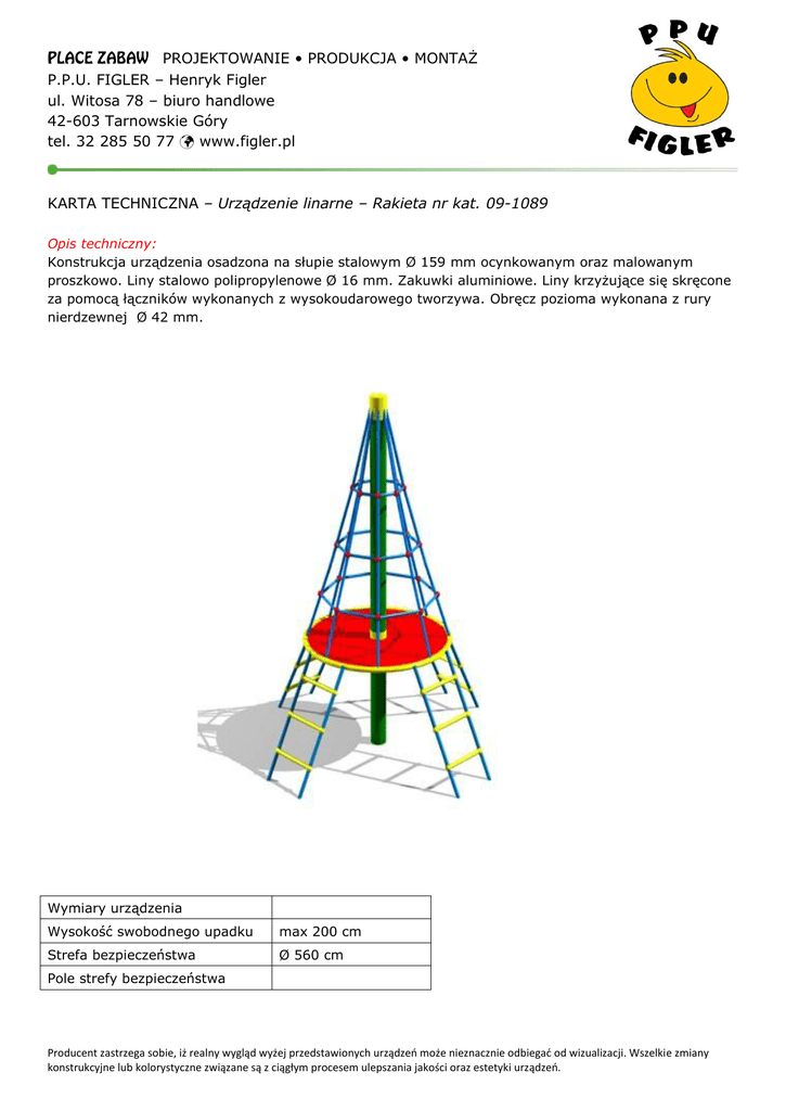 PROJEKTOWANIE • PRODUKCJA • MONTAŻ P.P.U. FIGLER – Henryk Figler ul. Witosa 78 – biuro handlowe 42-603 Tarnowskie Góry tel. 32 285 50 77 www.figler.pl KARTA TECHNICZNA – Urządzenie linarne – Rakieta nr kat. 09-1089 Opis techniczny: Konstrukcja urządzenia osadzona na słupie stalowym Ø 159 mm ocynkowanym oraz malowanym proszkowo. Liny stalowo polipropylenowe Ø 16 mm. Zakuwki aluminiowe. Liny krzyżujące się skręcone za pomocą łączników wykonanych z wysokoudarowego tworzywa. Obręcz pozioma wykonana z rury nierdzewnej Ø 42 mm. Wymiary urządzenia Wysokość swobodnego upadku max 200 cm Strefa bezpieczeństwa Ø 560 cm Pole strefy bezpieczeństwa Producent zastrzega sobie, iż realny wygląd wyżej przedstawionych urządzeń może nieznacznie odbiegać od wizualizacji. Wszelkie zmiany konstrukcyjne lub kolorystyczne związane są z ciągłym procesem ulepszania jakości oraz estetyki urządzeń.