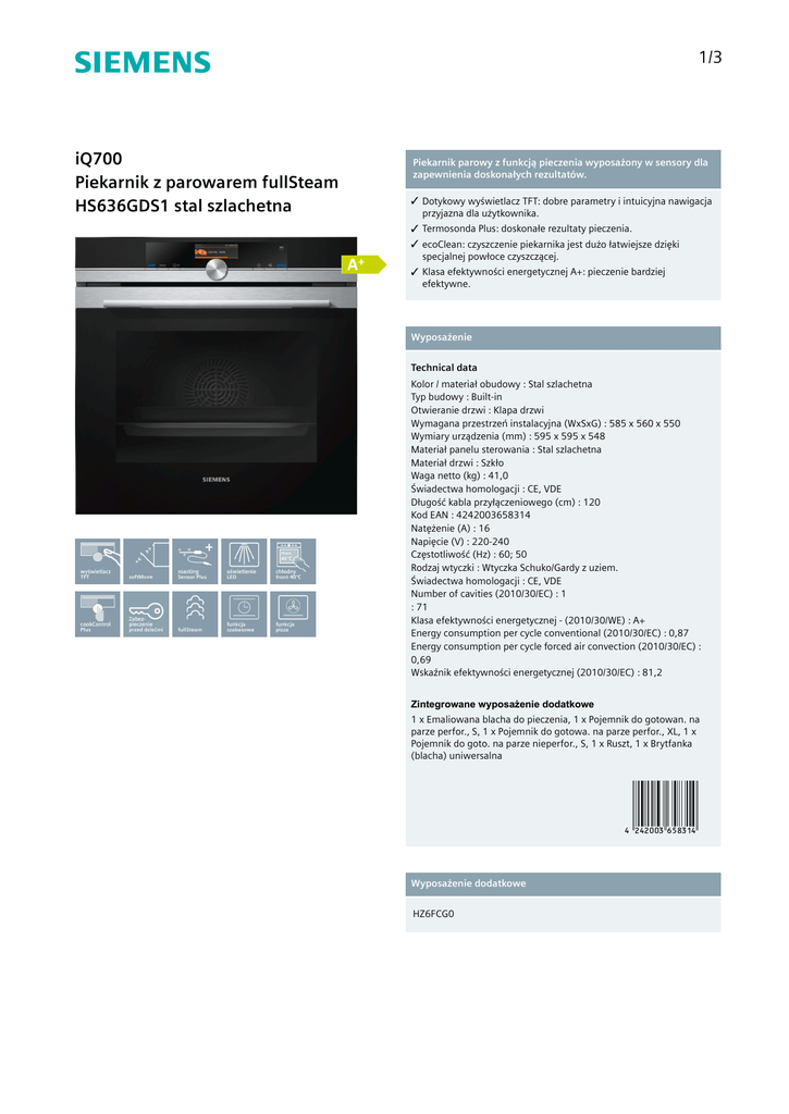 1/3 iQ700 Piekarnik z parowarem fullSteam HS636GDS1 stal szlachetna Piekarnik parowy z funkcją pieczenia wyposażony w sensory dla zapewnienia doskonałych rezultatów. ✓ Dotykowy wyświetlacz TFT: dobre parametry i intuicyjna nawigacja przyjazna dla użytkownika. ✓ Termosonda Plus: doskonałe rezultaty pieczenia. ✓ ecoClean: czyszczenie piekarnika jest dużo łatwiejsze dzięki specjalnej powłoce czyszczącej. ✓ Klasa efektywności energetycznej A+: pieczenie bardziej efektywne. Wyposażenie Technical data Kolor / materiał obudowy : Stal szlachetna Typ budowy : Built-in Otwieranie drzwi : Klapa drzwi Wymagana przestrzeń instalacyjna (WxSxG) : 585 x 560 x 550 Wymiary urządzenia (mm) : 595 x 595 x 548 Materiał panelu sterowania : Stal szlachetna Materiał drzwi : Szkło Waga netto (kg) : 41,0 Świadectwa homologacji : CE, VDE Długość kabla przyłączeniowego (cm) : 120 Kod EAN : 4242003658314 Natężenie (A) : 16 Napięcie (V) : 220-240 Częstotliwość (Hz) : 60; 50 Rodzaj wtyczki : Wtyczka Schuko/Gardy z uziem. Świadectwa homologacji : CE, VDE Number of cavities (2010/30/EC) : 1 : 71 Klasa efektywności energetycznej - (2010/30/WE) : A+ Energy consumption per cycle conventional (2010/30/EC) : 0,87 Energy consumption per cycle forced air convection (2010/30/EC) : 0,69 Wskaźnik efektywności energetycznej (2010/30/EC) : 81,2 Zintegrowane wyposażenie dodatkowe 1 x Emaliowana blacha do pieczenia, 1 x Pojemnik do gotowan. na parze perfor., S, 1 x Pojemnik do gotowa. na parze perfor., XL, 1 x Pojemnik do goto. na parze nieperfor., S, 1 x Ruszt, 1 x Brytfanka (blacha) uniwersalna '!2E20AD-gfidbe! Wyposażenie dodatkowe HZ6FCG0 2/3 iQ700 Piekarnik z parowarem fullSteam HS636GDS1 stal szlachetna Wyposażenie Typ piekarnika / rodzaje grzania: ● ● Piekarnik z parowarem fullSteam z 13 rodzajami grzania: termoobieg 4D, termoobieg eco, grzanie góra/dół, grzanie góra/dół ECO, grill z obiegiem powietrza, grill o dużej powierzchni, grill o małej powierzchni, funkcja pizza, funkcja coolStart, grzanie dolne, pieczenie w niskiej temp., podgrzewanie, podtrzymywanie ciepła Dodatkowe metody grzania z wykorzystaniem pary: para 100%, regeneracja, fermentacja, rozmrażanie ● Regulacja temperatury: 30 °C - 250 °C ● Pojemność: 71 l Komfort i bezpieczeństwo: ● ● Kolorowy wyświetlacz tekstowy TFT 3,7" z przyciskami sensorowymi Automatyczna propozycja temperatury Wyświetlacz aktualnej temperatury Kontrola rozgrzewania Funkcja szabasowa ● EcoClean: ścianka tylna ● Wewnętrzna strona drzwi w pełni szklana ● Temperatura na drzwiach piekarnika max. 40° C ● , softClose - miękkie domykanie drzwi, soft opening ● System wspomagający wybór potrawy cookControl Plus ● Termosonda Plus ● Zabezpieczenie przed uruchomieniem przez dzieci Wyłącznik bezpieczeństwa Wskaźnik zalegania ciepła przycisk start wyłącznik kontaktowy drzwi ● Wielofunkcyjny zegar elektroniczny ● Szybkie nagrzewanie ● Oświetlenie LED, Oświetlenie piekarnika włączane przez otwarcie drzwi (z możliwością odłączenia) ● Dmuchawa chłodząca ● Stalowy wentylator ● Przycisk informacyjny ● zbiornik wody o pojemności 1 l ● Wskaźnik zapełnienia pojemnika na wodę ● 1 x Emaliowana blacha do pieczenia, 1 x Pojemnik do gotowan. na parze perfor., S, 1 x Pojemnik do gotowa. na parze perfor., XL, 1 x Pojemnik do goto. na parze nieperfor., S, 1 x Ruszt, 1 x Brytfanka (blacha) uniwersalna Dane techniczne: ● Długość przewodu sieciowego: 120 cm ● Wartosc calk. przylacz.elektr.: 3.65 kW ● Wymiary (WxSxG): 595 mm x 595 mm x 548 mm ● Klasa efektywności energetycznej (zgodne z EU Nr. 65/2014): A+ Zużycie energii dla cyklu w trybie tradycyjnym: 0.87 kWh Zużycie energii dla cyklu w trybie z włączonym wentylatorem: 0.69 kWh Liczba komór: 1 Źródło ciepła: elektryczne Objętość: 71 l 3/3 iQ700 Piekarnik z parowarem fullSteam HS636GDS1 stal szlachetna Rysunki wymiarowe