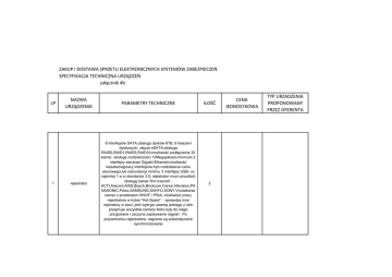 ZAKUP I DOSTAWA SPRZETU ELEKTRONICZNYCH SYSTEMÓW ZABEZPIECZEŃ SPECYFIKACJA TECHNICZNA URZĄDZEŃ załącznik 4b LP 1 NAZWA URZĄDZENIA PARAMETRY TECHNICZNE ILOŚĆ rejestrator 8 interfejsów SATA,obsługa dysków 6TB, 8 kieszeni dyskowych, złącze eSATA;obsługa RAID0,RAID1,RAID5,RAID10;mozliwość podłączenia 32 kamer, obsługa rozdzielczości 12Megapikseli;minimum 2 interfejsy sieciowe Gigabit Ethernet;mozliwość niezależnejpracy interfejsów:tryb rozdzielania ruchu sieciowego,lub redundancji;minimu 3 interfejsy USB- co najmniej 1 w w standarcie 3.0; rejestrator musi umozliwić obsługę kamer firm trzecich : ACTI,Arecont,AXIS,Bosch,Brickcom,Canon,Hikvision,PA NASONIC,Pelco,SAMSUNG,SANYO,SONY,Vivotekoraz kamer z protokołem ONVIF i PSIA; możliwość pracy rejestratora w trybie "Hot-Spare". - sprawdza inne rejstratory w sieci, jeśli wykryje usterkę jednego z nich przejmuje wszystkie kamery które były do niego przy[pisane i zaczyna zapisywanie nagrań . Po przywróceniu rejestratora, nagrania są automatycznie synchronizowane 2 CENA JEDNOSTKOWA TYP URZADZENIA PROPONOWANY PRZEZ OFERENTA 2 3 4 5 6 kamera tulejowa dysk HDD switch GB mozliwość generowania 30 klatek na sekundę przy rozdzielczości 192x1080;Kolor: 0,02 lux przy F1.2, 50IRE, migawka 1/30s; obiektyw moto-zoom, 4x zbliżenie optyczne, ogniskowa 2.8do12mm, kąt widzenia 90,1 stopnido 31 stopni; H264 High Profile, Main Profilei Baseline Profile; regulacja strumienia w zakresie od 32 Kbps do 16 Mbps, mechaniczny fitr podczerwieni; diody IR w zasięgu 30m, diody podczerwień umiejscowione za ciemnym tworzywemumozliwiajacym penetracje do 90% promieni IR; migawka regulowana w zakresie przynajmniej od 1s do 1/100000s; redukcja szumów 3D DNR z mozliwośćia płybnnej regulacji mocy, przynajmniej 25 stopniowej; WDR o mocy nie mniejszej niz 120dB z mozliwością przynajmniej 10 stopniowej regulacji; funkacja kompensacji silnego światła (HLC High Light Compensation) oraz tylnego światła BLC; mozliwość niezależnego nagrywania na kartę pamięci w standarcie SDXC, serwer NAS, lub udział sieciowy SMB/CIFS; mozliwość przypisania powierzchni karty pamieci oddzielnie dla VIDEO i dla zdjęć; IP67; zasilanie 12VDC z tolerancją 20%, lub PoE(802.3af), 12W max; wejście i wyjscie alarmowe, wyjście analogowe (75Q/BNC) kamera zintegrowana z uchwytem (ukryty tor kablowy) przeznaczone są do systemów monitoringu, zamknięty w obudowie 3,5" ze złączem SATA/600 ,wykorzystują technologię IntelliPower; bufor 64MB,czas dpostepu 4,5ms,interfejs SATA 3,czas dostepu odczytywanie 5,1ms, czas dostepu zapisywanie 5,1ms standsardy:IEEE 802.3, IEEE 802.3u, IEEE 802.3ab, IEEE 802.3z, IEEE 802.3x, IEEE802.1p, IEEE 802.3az; IEEE 822.3af PoE, IEEE 802.3at PoE Plus; porty :24 x RJ45 PoE Gigabit Ethernet 4 x (SFP/RJ-45);zasilanie 100240 V AC ( zewnetrzny); pobór mocy 454 W max. (375W PoE); przepustowośc 41,67Mpps; Tablica adresów MAC 16KB; bufor 1,5MB; mozliwość montazu w szafie rack, moc min3000VA91800W), czas podtrzymania dla 80% zasilacz awaryjny UPS obciążenia - min 12min, posiada układ AVR, posiada interfejs komunikacyjny, montaz w szafir rack, wysokość 3U, rozbudowa o moduły bateryjne, gwarancja min 2 lata moduł bateryjny wspólpracujacy integralnie z zasilaczem UPS 37 12 4 2 8 monitor lcd 50" Przekatna obrazu 50”,Rozdzielczość 3840x2160 (4K),Odswiezanie 1500Hz PMI,Smart TV,Łączność WiFi,DLNA,Bluetooth,Moc głósników 2x10W,Liczba złączy HDMI3, Liczba złączy USB 2 ,Złącze Ethernet (LAN) Tak, Kompozytowe wejście wideo 1 ,Komponentowe wejście wideo 1, Cyfrowe wyjście optyczne 1, Złącze CI(Common Interface) 1 ,Wejście RF (naziemne/kablowe) 1,Klasa energetyczna A+ 3 SPCE 652.100 7 8 moduł rozszerzeń wejść/wyjść w obudowie SPCE 452 2 9 moduł wyjść przekaźnikowych w obudowie 10 klawiatura LCD SPCK420 4 Moduł bezprzewodowy SPCW 110.000 3 12 pilot bezprewodowe wspólopracujace z modułem SPCW 110.000 30 13 kontroler przejść SPCA 210.100 4 14 czytnik HID MF1040 8 15 przenośne urządzenie wizualizacyjne elektronicznych systemów zabezpieczeń (SSWiN,CCTV) 7 11 16 szafa rack parametry w tabeli poniżej stojaca na cokole,42U,600x600, panel wentylacyjny (4 wentylatory) z termostatem regulowanym w zakresie 1825stopni Celcjusza, listwa zasilajaca 5x230V (5szt.),sciany zdejmowalne, drzwi przezroczyste Wyświetlacz o przekątnej pomiędzy 15-16 cali i rozdzielczości przynajmniej 1920 na 1080 z podświetleniem LED matowy aby zminimalizować odblaski Procesor Typ procesora x86 Przykładowo: Intel Core i5 6300U lub równoważny: Warunki równoważności –wydajności nie mniejsza w teście procesora niż 4300 punktów. 3 1 http://www.cp ubenchmark. net/cpu_list.p hp Pamięć operacyjna Zainstalowane przynajmniej 8GB o prędkości taktowania powyżej 2100Mhz W przypadku zaproponowania pamięci 8GB musi być możliwość dołożenia pamięci do wolnego banku. Pamięć masowa Dysk typu flash o pojemności przynajmniej 256GB Karta grafiki Obsługująca w pełni parametry ekranu Karta dźwiękowa Zintegrowana Kamera Wbudowana kamera o rozdzielczości minimum 1,0 MPix Karty sieciowe Karta WiFi zgodna ze standardami ac/a/b/g/n Bluetooth o standardzie przynajmniej 4.0 Modem WWAN (3G lub LTE) z możliwością zainstalowania karty SIM dowolnego polskiego operatora sieci GSM Karta LAN 10/100/1000 Porty Przynajmniej trzy porty USB 3 przy czym jeden Power Share Slot na karty SD Złącze HDMI Złącze VGA Złącze combo audio ( mikrofon/ słuchawki ) Klawiatura QWERTY Gładzik Zamontowany touchpad Mysz Bezprzewodowa laserowa Bluetooth Napęd optyczny Zewnętrzny przenośny napęd USB Wymagania dodatkowe Waga netto poniżej 2,0 kg Zamontowany czytnik linii papilarnych Komputer z linii biznesowej producenta Złącze stacji dokującej umożliwiające podłączenie dodatkowych portów : D-Sub, DVI, DisplayPort, RJ-45, eSATA, USB System operacyjny System operacyjny Windows 7 PL w wersji biznesowej 64 bitowej lub równoważny