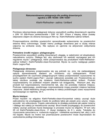 Rekomendowana pielęgnacja dla podłóg drewnianych zgodna z DIN 18356 i DIN 18367 Kiehl-Refresher- satina / brillant Poniższa rekomendacja pielęgnacji dotyczy wszystkich podłóg drewnianych zgodnie z DIN 18 356-Prace parkieciarskie i DIN 18 367- Prace z klepką, które zostały olejowane olejem do drewna tworzącym film np. Kiehl-Refresher-satina/ brillant. Przeprowadzona obróbka powierzchni spowodowała wytworzenie na powierzchni drewna filmu ochronnego. Dzięki niemu podłoga drewniana jest w dużej mierze odporna na wnikanie wody. Nie wpływa on ujemnie na aktywność oddychania drewna. Potrzebne środki myjąco- pielęgnacyjne: Powierzchnie wszystkich podłóg drewnianych ulegają, w zależności od eksploatacji, naturalnemu zużyciu. Dlatego też, aby zachować ich wartość wymagane jest ich regularne mycie i pielęgnacja, które przeprowadza się produktami Kiehl-Refreshersatina/ brillant i Keihl-Parketto-clean-Konzentrat. Mycie na sucho następuje padem Kiehl- Legno-Pad. Pielęgnacja okresowa: Pielęgnację okresową przeprowadza się wg potrzeb np. przy nie zadawalającej optyce spowodowanej śladami po chodzeniu czy zadrapaniami. Przed przystąpieniem do czynności pielęgnacyjnych należy przeprowadzić czyszczenie na sucho padem Kiehl-Legno-Pad i usunąć całkowicie powstały pył. Powierzchnię po takiej obróbce poddaje się działaniu Kiehl-Refresher-satina/ brillant. Produkt rozprowadzamy na podłodze mopem płaskim lub ściągaczką. Ważnym jest, aby produkt był rozprowadzony równomiernie tak, aby nie powstały matowe miejsca. Podczas częściowego, powtórnego rozprowadzania mogą powstać miejsca bardziej nasycone. Jeżeli kładziemy drugą warstwę to należy przestrzegać czasu wysychania wynoszącego co najmniej 24 h. Mycie bieżące: Przed myciem na wilgotno Kiehl-Parketto-clean-Konzentrat należy usunąć duże zabrudzenia nie przylegające trwale do podłoża takie jak piasek przy użyciu: mopa, szczotki lub odkurzacza. Często zabrudzenia te działają podobnie jak papier ścierny i dlatego też należy je niezwłocznie usunąć. Brud trwale przylegający do powierzchni należy usunąć podczas mycia bieżącego w procesie mycia na wilgotno. W tym celu 25 ml Kiehl-Parketto-clean-Konz. (1 dozę) dodajemy do 8 L wody. Tekstylia do czyszczenia zanurzamy w roztworze myjącym i dokładnie wyciskamy tak ,aby z nich nie kapało. Mycie na mokro lub przemaczanie powierzchni może doprowadzić do uszkodzenia podłogi drewnianej. 1 Czyszczeni na sucho: Czyszczenie na sucho należy przeprowadzić jeżeli film Refresher został uszkodzony w wyniku eksploatacji, optyka powierzchni jest nie do przyjęcia lub brud tak mocno przylega do podłoża, że nie można go usunąć w ramach mycia bieżącego. Czyszczenie przeprowadza się w formie sanacji filmu pielęgnacyjnego na sucho padem Kiehl-Legno-Pad oraz maszyną jednotarczową. Proszę stosować się do zaleceń zawartych w opisie produktu i certyfikacie bezpieczeństwa WE oraz karcie technicznej produktu. Częstotliwość wykonywania czynności myjąco- pielęgnacyjnych Eksploatacja Podłogi normalnie eksploatowane, np.: pomieszczenia mieszkalne, sypialnie Podłogi średnio mocno eksploatowane, np.: korytarze, schody, biura. Podłogi bardzo mocno eksploatowane, np.: restauracje, sklepy, szkoły, koszary itp. Hale sportowe i hale wszechstronnego przeznaczenia Pielęgnacja okresowa (Kiehl-Refreshersatina/ brillant) Mycie bieżące (Kiehl-Parkettoclean- Konz.) Czyszczenie na sucho (Kiehl-Legno-Pad) Po każdym czyszczeniu na sucho lub wg potrzeby Codziennie lub wg potrzeby W zależności od eksploatacji Po każdym czyszczeniu na sucho lub wg potrzeby Codziennie lub wg potrzeby W zależności od eksploatacji lub co 6-12 miesięcy. Po każdym czyszczeniu na sucho lub wg potrzeby Codziennie lub wg potrzeby W zależności od eksploatacji lub co 3- 6 miesięcy Po każdym czyszczeniu na sucho lub wg potrzeby Codziennie lub wg potrzeby W zależności od eksploatacji 2 Wskazówka: • Po olejowanych podłogach drewnianych nie można chodzić 2- 3 dni po nałożeniu oleju. Im dłużej w pierwszych dniach po położeniu oleju podłoga będzie delikatnie eksploatowana, tym większa będzie jej żywotność. • W pierwszych dniach tylko ostrożnie sprzątać na sucho i nie rozkładać żadnych dywanów. Materiał nośny dywanu ( antypoślizgowy) musi być odpowiedni do zabezpieczonych podłóg drewnianych. • Olejowanych podłóg drewnianych nigdy nie poddawać obróbce wiórami stalowymi. • Powierzchnia olejowana jest wynikiem pracy rzemieślnika. Oznacza to, że powierzchnia taka zawiera małe „usterki” w formie wtrąceń pyłu czy też cząstek brudu. Nie maja one jednak żadnego wpływu na jej żywotność. • Meble i inne ciężkie przedmioty wyposażenia wnętrz ostrożnie rozstawić. Nogi stołów i krzeseł zaopatrzyć w odpowiednie podkładki filcowe np. w oprawie z tworzywa sztucznego. • Przy zastosowaniu krzeseł na kółkach używać tylko miękkich kółek zgodnie z DIN 68131, dodatkowo zaleca się użycie odpowiednich podkładek. • Ważne: Zawsze kiedy powierzchnia olejowanej podłogi drewnianej jest zużyta poprzez chodzenie lub eksploatację, należy ją odnowić. • Obszary przy wejściu należy wyposażyć w wystarczająco duże wycieraczki zbierające brud. • Samopoczucie człowieka oraz zachowanie wartości podłogi drewnianej wymagają zdrowego klimatu pomieszczenia. Przy temp. pomieszczenia ok. 18 – 20 º C i relatywnej wilgotności powietrza 50- 60 % jest osiągnięty idealny klimat pomieszczenia. Wyższa wilgotność powietrza powoduje pęcznienie drewna, podczas gdy niższa jego kurczenie się i powstanie większych lub mniejszych fug. • Proszę stosować się do zaleceń zawartych w opisie produktu i certyfikacie bezpieczeństwa WE oraz karcie technicznej produktu. 3