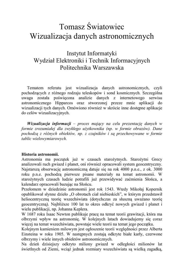 Tomasz Światowiec Wizualizacja danych astronomicznych Instytut Informatyki Wydział Elektroniki i Technik Informacyjnych Politechnika Warszawska Tematem referatu jest wizualizacja danych astronomicznych, czyli pochodzących z różnego rodzaju teleskopów i sond kosmicznych. Szczególna uwaga została poświęcona analizie danych z internetowego serwisu astronomicznego Hipparcos oraz stworzonej przeze mnie aplikacji do wizualizacji tych danych. Omówiono również w skrócie inne dostępne aplikacje do celów wizualizacyjnych. Wizualizacja informacji – proces mający na celu prezentację danych w formie zrozumiałej dla zwykłego użytkownika (np. w formie obrazów). Dane pochodzą z różnych obiektów, np. z czujników i są przechowywane w formie tablic wielowymiarowych. Historia astronomii. Astronomia ma początek już w czasach starożytnych. Starożytni Grecy analizowali ruch gwiazd i planet, oni również opracowali system geocentryczny. Najstarszą obserwację astronomiczną datuje się na rok 4000 p.n.e., z ok. 3000 roku p.n.e. pochodzą pierwsze pisane materiały na temat astronomii. W starożytnych czasach ludzie potrafili już przewidywać zaćmienia Słońca, a kalendarz opracowali bazując na Słońcu. Przełomem w dziedzinie astronomii jest rok 1543. Wtedy Mikołaj Kopernik opublikował słynne dzieło „O obrotach ciał niebieskich”, w którym przedstawił heliocentryczną teorię wszechświata (dotychczas za słuszną uważano teorię geocentryczną). Najbliższe 100 lat to okres odkryć nowych gwiazd i planet i wielu publikacji, np. Johanna Keplera. W 1687 roku Isaac Newton publikuje pracę na temat teorii grawitacji, która ma olbrzymi wpływ na astronomię. W kolejnych latach dowiadujemy się coraz więcej na temat wszechświata, powstaje wiele teorii na temat jego początku. Kolejnym kamieniem milowym jest ogłoszenie teorii względności przez Alberta Einsteina w roku 1905. W następnych zostają odkryte białe karły, czerwone olbrzymy i wiele innych obiektów astronomicznych. Na dzień dzisiejszy odkryto miliony gwiazd w odległości milionów lat świetlnych od Ziemi, wciąż jednak rozmiary wszechświata są wielką zagadką, niewiele również wiadomo na temat jego powstania. Historia grafiki i wizualizacji. Wizualizacja jest znana w społeczeństwie od setek lat. Najprostszym jej przykładem mogą być mapy – pozwalają przekształcić szereg liczb (współrzędne, wysokość) na formę bardziej atrakcyjna dla widza, czyli obraz. Innym przykładem może być prognoza pogody. Współczesnym „guru” wizualizacji jest Edward Tufte, profesor Yale, nazwany przez New York Times „Leonardo Da Vinci danych”. Jest ekspertem od wszelkiego rodzaju wykresów i diagramów, to jemu właśnie zawdzięczamy „sparkline”, czyli diagram pokazujący zmiany jakiegoś parametru, np. akcji na giełdzie. Tufte jest autorem pracy „The Visual Display of Quantitative Information” z 1983 roku. Opisał w niej zasady wizualizacji danych naukowych, w szczególności sprzeciwiał się jakiemukolwiek upiększaniu obrazów, wszelkiej dekoracji, uważał, że obraz ma na celu wyłącznie przekazać informacje i pomóc w jej interpretacji. Ostatnio (2003) człowiek ten głównie znany z jest z krytyki wobec Power Pointa (praca pt. „PowerPoint is evil”). W odpowiedzi na to, zwolennicy Power Pointa przygotowali te prace w formie prezentacji PowerPoint . Poważny rozwój wizualizacji zaczął się w 1987 roku, po wydaniu specjalnego numeru „Computer Graphics” dotyczącego wizualizacji danych naukowych. Od tego czasu temat wizualizacji (ogólnej oraz niektórych tylko obszarów nauki) zaczęto poruszać na wielu konferencjach i warsztatach na temat grafiki komputerowej, np. Siggraph. Wydano też wiele książek i artykułów na ten temat. Dane wolumetryczne Dane astronomiczne są przykładem danych wolumetrycznych. Oznacza to, że parametry obiektów (w tym przypadku planet, gwiazd) są przechowywane w postaci wielowymiarowych tablic zawierających liczby. Innymi przykładami danych wolumetrycznych są np. obrazy tomografii mózgu (http://graphics.stanford.edu/data/voldata) Dane astronomiczne Wiele serwisów udostępnia dane teleskopów i sond kosmicznych. Są to np.: NASA Astronomical Data Center (USA) http://adc.gsfc.nasa.gov/ astronomiczne pochodzące z CASU Astronomical Data Centre (UK) http://casu.ast.cam.ac.uk/casuadc The Canadian Astronomy Data Centre (Kanada) http://cadcwww.dao.nrc.ca/ SIMBAD Astronomical Database (Francja) http://simbad.u-strasbg.fr/simbad/ Serwisy te umożliwiają przeszukiwanie baz danych wg wielu kryteriów. Najważniejsze parametry astronomiczne • Współrzędne ICRS (International Celestial Reference System): o Rektascencja – kąt dwuścienny pomiędzy płaszczyzną koła godzinnego punktu równonocy wiosennej (rektascensja równa 0h) a płaszczyzną koła godzinnego obiektu. o Deklinacja - kąt pomiędzy kierunkiem poprowadzonym od obserwatora do obiektu a płaszczyzną równika niebieskiego. • Fe/H – temperatura w st. Kelvina, logarytm dziesiętny współczynnika grawitacji, względny współczynnik metaliczności • GEN (Geneva Photometric System) - indeks kolorów, różnica między jasnością świateł przepuszczonych przez odpowiednie filtry (U – ultrafiolet, B – niebieskie, V – widzialne) o U-B color index o V-B color index o B1-B color index o B2-B color index o V1-B color index o G-B color index Ponadto pomiar ten zawiera względną jasność obiektu. • JP11 (Johnson’s Photometry) – jasność światła o danej długości fali o U (nmes) magnitude at λeff = 360 nm o B (nmes) magnitude at λeff = 450 nm o V (nmes) magnitude at λeff = 555 nm o R (nmes) magnitude at λeff = 670 nm o I (nmes) magnitude at λeff = 870 nm o J (nmes) magnitude at λeff = 1.2 µm o K (nmes) magnitude at λeff = 2.2 µm o L (nmes) magnitude at λeff = 3.5 µm o M (nmes) magnitude at λeff = 5.0 µm o N (nmes) magnitude at λeff = 9.0