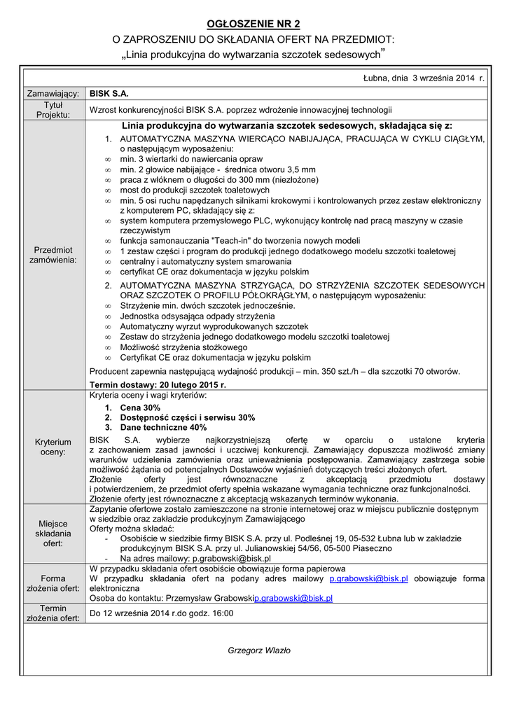 OGŁOSZENIE NR 2 O ZAPROSZENIU DO SKŁADANIA OFERT NA PRZEDMIOT: „Linia produkcyjna do wytwarzania szczotek sedesowych” Łubna, dnia 3 września 2014 r. Zamawiający: Tytuł Projektu: BISK S.A. Wzrost konkurencyjności BISK S.A. poprzez wdrożenie innowacyjnej technologii Linia produkcyjna do wytwarzania szczotek sedesowych, składająca się z: Przedmiot zamówienia: 1. AUTOMATYCZNA MASZYNA WIERCĄCO NABIJAJĄCA, PRACUJĄCA W CYKLU CIĄGŁYM, o następującym wyposażeniu: • min. 3 wiertarki do nawiercania opraw • min. 2 głowice nabijające - średnica otworu 3,5 mm • praca z włóknem o długości do 300 mm (niezłożone) • most do produkcji szczotek toaletowych • min. 5 osi ruchu napędzanych silnikami krokowymi i kontrolowanych przez zestaw elektroniczny z komputerem PC, składający się z: • system komputera przemysłowego PLC, wykonujący kontrolę nad pracą maszyny w czasie rzeczywistym • funkcja samonauczania "Teach-in" do tworzenia nowych modeli • 1 zestaw części i program do produkcji jednego dodatkowego modelu szczotki toaletowej • centralny i automatyczny system smarowania • certyfikat CE oraz dokumentacja w języku polskim 2. AUTOMATYCZNA MASZYNA STRZYGĄCA, DO STRZYŻENIA SZCZOTEK SEDESOWYCH ORAZ SZCZOTEK O PROFILU PÓŁOKRĄGŁYM, o następującym wyposażeniu: • Strzyżenie min. dwóch szczotek jednocześnie. • Jednostka odsysająca odpady strzyżenia • Automatyczny wyrzut wyprodukowanych szczotek • Zestaw do strzyżenia jednego dodatkowego modelu szczotki toaletowej • Możliwość strzyżenia stożkowego • Certyfikat CE oraz dokumentacja w języku polskim Producent zapewnia następującą wydajność produkcji – min. 350 szt./h – dla szczotki 70 otworów. Termin dostawy: 20 lutego 2015 r. Kryteria oceny i wagi kryteriów: 1. Cena 30% 2. Dostępność części i serwisu 30% 3. Dane techniczne 40% Kryterium oceny: Miejsce składania ofert: Forma złożenia ofert: Termin złożenia ofert: BISK S.A. wybierze najkorzystniejszą ofertę w oparciu o ustalone kryteria z zachowaniem zasad jawności i uczciwej konkurencji. Zamawiający dopuszcza możliwość zmiany warunków udzielenia zamówienia oraz unieważnienia postępowania. Zamawiający zastrzega sobie możliwość żądania od potencjalnych Dostawców wyjaśnień dotyczących treści złożonych ofert. Złożenie oferty jest równoznaczne z akceptacją przedmiotu dostawy i potwierdzeniem, że przedmiot oferty spełnia wskazane wymagania techniczne oraz funkcjonalności. Złożenie oferty jest równoznaczne z akceptacją wskazanych terminów wykonania. Zapytanie ofertowe zostało zamieszczone na stronie internetowej oraz w miejscu publicznie dostępnym w siedzibie oraz zakładzie produkcyjnym Zamawiającego Oferty można składać: - Osobiście w siedzibie firmy BISK S.A. przy ul. Podleśnej 19, 05-532 Łubna lub w zakładzie produkcyjnym BISK S.A. przy ul. Julianowskiej 54/56, 05-500 Piaseczno - Na adres mailowy: [email protected] W przypadku składania ofert osobiście obowiązuje forma papierowa W przypadku składania ofert na podany adres mailowy [email protected] obowiązuje forma elektroniczna Osoba do kontaktu: Przemysław [email protected] Do 12 września 2014 r.do godz. 16:00 Grzegorz Wlazło