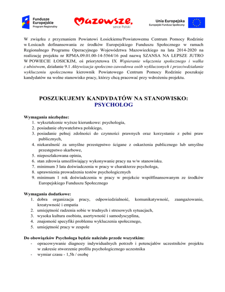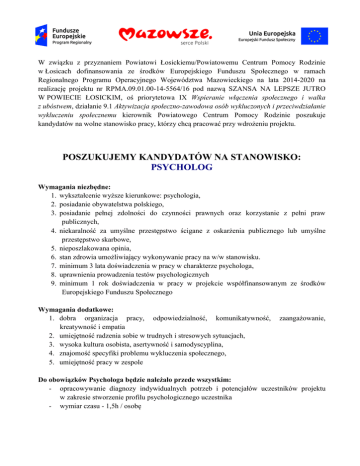 W związku z przyznaniem Powiatowi Łosickiemu/Powiatowemu Centrum Pomocy Rodzinie w Łosicach dofinansowania ze środków Europejskiego Funduszu Społecznego w ramach Regionalnego Programu Operacyjnego Województwa Mazowieckiego na lata 2014-2020 na realizację projektu nr RPMA.09.01.00-14-5564/16 pod nazwą SZANSA NA LEPSZE JUTRO W POWIECIE ŁOSICKIM, oś priorytetowa IX Wspieranie włączenia społecznego i walka z ubóstwem, działanie 9.1 Aktywizacja społeczno-zawodowa osób wykluczonych i przeciwdziałanie wykluczeniu społecznemu kierownik Powiatowego Centrum Pomocy Rodzinie poszukuje kandydatów na wolne stanowisko pracy, którzy chcą pracować przy wdrożeniu projektu. POSZUKUJEMY KANDYDATÓW NA STANOWISKO: PSYCHOLOG Wymagania niezbędne: 1. wykształcenie wyższe kierunkowe: psychologia, 2. posiadanie obywatelstwa polskiego, 3. posiadanie pełnej zdolności do czynności prawnych oraz korzystanie z pełni praw publicznych, 4. niekaralność za umyślne przestępstwo ścigane z oskarżenia publicznego lub umyślne przestępstwo skarbowe, 5. nieposzlakowana opinia, 6. stan zdrowia umożliwiający wykonywanie pracy na w/w stanowisku. 7. minimum 3 lata doświadczenia w pracy w charakterze psychologa, 8. uprawnienia prowadzenia testów psychologicznych 9. minimum 1 rok doświadczenia w pracy w projekcie współfinansowanym ze środków Europejskiego Funduszu Społecznego Wymagania dodatkowe: 1. dobra organizacja pracy, odpowiedzialność, komunikatywność, kreatywność i empatia 2. umiejętność radzenia sobie w trudnych i stresowych sytuacjach, 3. wysoka kultura osobista, asertywność i samodyscyplina, 4. znajomość specyfiki problemu wykluczenia społecznego, 5. umiejętność pracy w zespole zaangażowanie, Do obowiązków Psychologa będzie należało przede wszystkim: - opracowywanie diagnozy indywidualnych potrzeb i potencjałów uczestników projektu w zakresie stworzenie profilu psychologicznego uczestnika - wymiar czasu - 1,5h / osobę Warunki pracy na stanowisku: Umowa cywilnoprawna, zatrudnienie od grudnia 2016r. Wymagane dokumenty: - CV z dokładnym opisem przebiegu pracy zawodowej - list motywacyjny - kserokopie dokumentów potwierdzających wykształcenie i doświadczenie zawodowe - kwestionariusz osobowy dla osoby ubiegającej się o zatrudnienie - oświadczenie o niekaralności, korzystaniu z pełni praw publicznych oraz posiadaniu pełnej zdolności do czynności prawnych - zaświadczenie/oświadczenie o braku przeciwwskazań zdrowotnych do wykonywania pracy na określonym stanowisku - inne dokumenty o posiadanych kwalifikacjach i umiejętnościach. Zamawiający zastrzega sobie prawo żądania dodatkowych dokumentów niezbędnych do rozpatrzenia oferty. Termin, miejsce i sposób składania ofert: Wymagane dokumenty należy składać w zaklejonej kopercie osobiście w siedzibie Powiatowego Centrum Pomocy Rodzinie w Łosicach ul. Narutowicza 6, 08-200 Łosice pok. 40 lub pocztą na adres urzędu z dopiskiem „NABÓR PSYCHOLOG W RAMACH PROJEKTU” w terminie do dnia 30 listopada 2016r. do godz. 9.00 (decyduje data wpływu). Kserokopie dokumentów powinny być poświadczone za zgodność z oryginałem. Informacje dodatkowe: Postępowanie w sprawie naboru obejmuje analizę formalną złożonych dokumentów oraz rozmowy z kandydatami spełniającymi wymagania formalne. Kandydaci spełniający wymagania formalne zostaną indywidualnie powiadomieni o terminie rozmowy kwalifikacyjnej. W przypadku zatrudnienia kandydat zobowiązany będzie do przedłożenia pracodawcy oryginały dokumentów. Zgłoszenia kandydatów złożone po terminie w inny sposób niż określony w ogłoszeniu bez kompletu wymaganych dokumentów nie będą brane pod uwagę w postępowaniu rekrutacyjnym. Oferty niekompletne lub te, które wpłyną po wyżej określonym terminie nie będą rozpatrywane. /-/ Małgorzata Witkowska Łosice, 23.11.2016r.