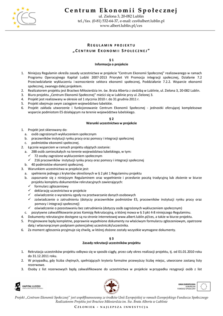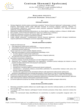 C e n t r u m E k o n o m i i S p o ł e c znej ul. Zielona 3, 20-082 Lublin tel./fax. (0-81) 532-64-37, e-mail: [email protected] www.albert.lublin.pl/ces REGULAMIN PROJEKTU „CENTRUM EKONOMII SPOŁECZNEJ” §1 Informacja o projekcie 1. Niniejszy Regulamin określa zasady uczestnictwa w projekcie "Centrum Ekonomii Społecznej" realizowanego w ramach Programu Operacyjnego Kapitał Ludzki 2007-2013 Priorytet VII Promocja integracji społecznej, Działanie 7.2 Przeciwdziałanie wykluczeniu i wzmocnienie sektora ekonomii społecznej, Poddziałanie 7.2.2. Wsparcie ekonomii społecznej, zwanego dalej projektem. Realizatorem projektu jest Bractwo Miłosierdzia im. św. Brata Alberta z siedzibą w Lublinie, ul. Zielona 3, 20-082 Lublin. Biuro projektu „Centrum Ekonomii Społecznej” mieści się w Lublinie przy ul. Zielonej 3. Projekt jest realizowany w okresie od 1 stycznia 2010 r. do 31 grudnia 2011 r. Projekt obejmuje swym zasięgiem województwo lubelskie. Projekt zakłada utworzenie i funkcjonowanie Centrum Ekonomii Społecznej - jednostki oferującej kompleksowe wsparcie podmiotom ES działającym na terenie województwa lubelskiego. 2. 3. 4. 5. 6. §2 Warunki uczestnictwa w projekcie 1. Projekt jest skierowany do: osób zagrożonych wykluczeniem społecznym pracowników instytucji rynku pracy oraz pomocy i integracji społecznej podmiotów ekonomii społecznej. 2. Łącznie wsparciem w ramach projektu objętych zostanie: a. 288 osób zamieszkałych na terenie województwa lubelskiego, w tym: 72 osoby zagrożone wykluczeniem społecznym 216 pracowników instytucji rynku pracy oraz pomocy i integracji społecznej b. 40 podmiotów ekonomii społecznej. 3. Warunkiem uczestnictwa w projekcie jest: a. spełnienie jednego z kryteriów określonych w § 2 pkt 1 Regulaminu projektu b. zapoznanie się z niniejszym Regulaminem oraz wypełnienie i przesłanie pocztą tradycyjną lub złożenie w biurze projektu kompletu dokumentów rekrutacyjnych zawierających: formularz zgłoszeniowy deklarację uczestnictwa w projekcie oświadczenie o wyrażeniu zgody na przetwarzanie danych osobowych zaświadczenie o zatrudnieniu (dotyczy pracowników podmiotów ES, pracowników instytucji rynku pracy oraz pomocy i integracji społecznej) oświadczenie o pozostawaniu bez zatrudnienia (dotyczy osób zagrożonych wykluczeniem społecznym) c. pozytywne zakwalifikowanie przez Komisję Rekrutacyjną, o której mowa w § 3 pkt 4-8 niniejszego Regulaminu. 4. Dokumenty rekrutacyjne dostępne są na stronie internetowej www.albert.lublin.pl/ces, a także w biurze projektu. 5. Przyjmowane będą kompletne, poprawnie wypełnione dokumenty na właściwym formularzu zgłoszeniowym, opatrzone datą i własnoręcznym podpisem potencjalnej uczestniczki/uczestnika. 6. Za moment zgłoszenia przyjmuje się chwilę, w której złożone zostały wszystkie wymagane dokumenty. a. b. c. §3 Zasady rekrutacji uczestników projektu 1. 2. 3. Rekrutacja uczestników projektu odbywa się w sposób ciągły, przez cały okres realizacji projektu, tj. od 01.01.2010 roku do 31.12.2011 roku. W przypadku, gdy liczba chętnych, spełniających kryteria formalne przewyższy liczbę miejsc, utworzone zostaną listy rezerwowe. Osoby z list rezerwowych będą zakwalifikowane do uczestnictwa w projekcie w przypadku rezygnacji osób z list Projekt „Centrum Ekonomii Społecznej” jest współfinansowany ze środków Unii Europejskiej w ramach Europejskiego Funduszu Społecznego Realizatorem Projektu jest Bractwo Miłosierdzia im. Św. Brata Alberta w Lublinie CZŁOWIEK - NAJLEPSZA INWESTYCJA C e n t r u m E k o n o m i i S p o ł e c znej ul. Zielona 3, 20-082 Lublin tel./fax. (0-81) 532-64-37, e-mail: [email protected] www.albert.lublin.pl/ces podstawowych (przed rozpoczęciem szkolenia). Kwalifikacja uczestników projektu dokonywana będzie przez Komisję Rekrutacyjną, w której skład wejdą: Kierownik Projektu, Asystent Kierownika Projektu, Specjalista ds. przedsiębiorczości społecznej i doradztwa lokalnego (Doradca). 5. Komisja rekrutacyjna dokonuje kwalifikacji uczestników projektu biorąc pod uwagę: a. kryteria formalne: złożenie poprawnie wypełnionych dokumentów rekrutacyjnych spełnianie warunków uczestnictwa w projekcie, o których mowa w § 2 pkt 1 niniejszego Regulaminu kolejność zgłoszeń b. kryteria dodatkowe: pozytywna dyskryminacja płci - pierwszeństwo udziału w projekcie będą miały kobiety, które stanowić będą 70 % grupy docelowej motywacja potencjalnych uczestników projektu do prowadzenia działalności w sektorze ekonomii społecznej (dotyczy osób fizycznych zainteresowanych utworzeniem spółdzielni socjalnej). 6. W przypadku niespełnienia wymagań rekrutacji, kandydatka/kandydat zostanie poproszony o uzupełnienie braków formalnych. W przypadku nie złożenia uzupełnień, kandydatka/kandydat zostaje skreślony z listy uczestników projektu. Na miejsce skreślonej kandydatki/kandydata wchodzi pierwsza osoba z listy rezerwowej. 7. Kandydatki/kandydaci, którzy zostali zakwalifikowani do uczestnictwa w projekcie będą informowani o wynikach telefonicznie lub za pośrednictwem poczty elektronicznej. 8. Decyzja Komisji Rekrutacyjnej jest ostateczna i wiążąca. 4. §4 Prawa i obowiązki uczestników projektu 1. Uczestnik projektu ma prawo do: udziału w oferowanych w ramach projektu formach wsparcia otrzymania materiałów szkoleniowych otrzymania certyfikatu bądź zaświadczenia o uczestnictwie w danym szkoleniu w ramach projektu zwrotu kosztów dojazdu na szkolenia 2. Obowiązki uczestnika projektu: a. przestrzegania zasad niniejszego Regulaminu b. złożenia kompletu wymaganych dokumentów rekrutacyjnych c. uczestniczenia we wszystkich zajęciach, na które się zakwalifikował – potwierdzonego własnoręcznym podpisem na liście obecności d. wypełniania ankiet ewaluacyjnych w trakcie uczestnictwa w projekcie oraz na zakończenie w nim udziału e. bieżącego informowania Asystenta Kierownik