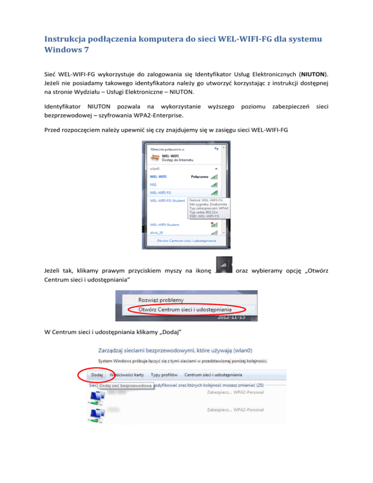 Instrukcja podłączenia komputera do sieci WEL-WIFI-FG dla systemu Windows 7 Sieć WEL-WIFI-FG wykorzystuje do zalogowania się Identyfikator Usług Elektronicznych (NIUTON). Jeżeli nie posiadamy takowego identyfikatora należy go utworzyć korzystając z instrukcji dostępnej na stronie Wydziału – Usługi Elektroniczne – NIUTON. Identyfikator NIUTON pozwala na wykorzystanie bezprzewodowej – szyfrowania WPA2-Enterprise. wyższego poziomu zabezpieczeń sieci Przed rozpoczęciem należy upewnić się czy znajdujemy się w zasięgu sieci WEL-WIFI-FG Jeżeli tak, klikamy prawym przyciskiem myszy na ikonę Centrum sieci i udostępniania” W Centrum sieci i udostępniania klikamy „Dodaj” oraz wybieramy opcję „Otwórz Wybieramy „Ręcznie utwórz profil sieciowy”: A następnie wpisujemy dane jak na obrazku poniżej, zatwierdzamy klikając „Dalej”: Następnie klikamy „Zmień ustawienia połączenia”: Przechodzimy do zakładki „Zabezpieczenia”: Upewniamy się, że wszystko mamy ustawione jak na rysunku poniżej, oraz klikamy przycisk „Ustawienia” po prawej stronie: W ustawieniach odznaczamy opcję „Weryfikuj certyfikat serwera” oraz potwierdzamy przyciskiem „OK”. Po kliknięciu OK powracamy do okna z ustawieniami i wybieramy opcję „Ustawienia zaawansowane”: Po wejściu w „Ustawienia zaawansowane” wybieramy tryb uwierzytelniania jako „Uwierzytelnianie użytkownika”: A następnie wybieramy „Zapisz poświadczenia”: Wpisujemy w pierwsze pole swój Identyfikator Usług Elektronicznych (NIUTON) oraz hasło: Po kliknięciu OK zamykamy okno ustawień zaawansowanych klikając OK, zamykamy okno „WEL-WIFIFG właściwości sieci bezprzewodowej”, zamykamy okno zarządzania sieciami bezprzewodowymi oraz z dostępnych sieci Wi-Fi wybieramy WEL-WIFI-FG: Dziękuję za poświęcenie tych paru minut Przełoży się to na bezpieczeństwo oraz jakość usług. W razie wszelkich pytań: Marcin Głowacki - 83 98 09 – [email protected] – 6 / 45 Dariusz Jasiński – 83 94 40 – [email protected] – 6 / 45