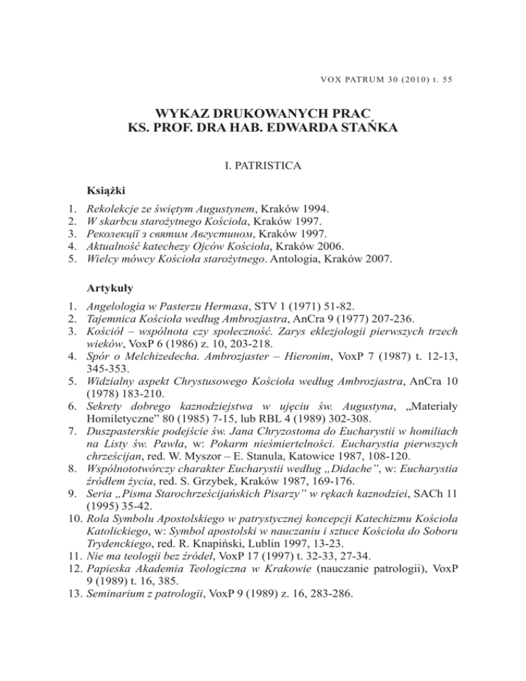 V O X PAT R U M 3 0 ( 2 0 1 0 ) t . 5 5 WYKAZ DRUKOWANYCH PRAC KS. PROF. DRA HAB. EDWARDA STAŃKA I. PATRISTICA Książki 1. 2. 3. 4. 5. Rekolekcje ze świętym Augustynem, Kraków 1994. W skarbcu starożytnego Kościoła, Kraków 1997. Реколекції з святим Августином, Kraków 1997. Aktualność katechezy Ojców Kościoła, Kraków 2006. Wielcy mówcy Kościoła starożytnego. Antologia, Kraków 2007. Artykuły 1. Angelologia w Pasterzu Hermasa, STV 1 (1971) 51-82. 2. Tajemnica Kościoła według Ambrozjastra, AnCra 9 (1977) 207-236. 3. Kościół – wspólnota czy społeczność. Zarys eklezjologii pierwszych trzech wieków, VoxP 6 (1986) z. 10, 203-218. 4. Spór o Melchizedecha. Ambrozjaster – Hieronim, VoxP 7 (1987) t. 12-13, 345-353. 5. Widzialny aspekt Chrystusowego Kościoła według Ambrozjastra, AnCra 10 (1978) 183-210. 6. Sekrety dobrego kaznodziejstwa w ujęciu św. Augustyna, „Materiały Homiletyczne” 80 (1985) 7-15, lub RBL 4 (1989) 302-308. 7. Duszpasterskie podejście św. Jana Chryzostoma do Eucharystii w homiliach na Listy św. Pawła, w: Pokarm nieśmiertelności. Eucharystia pierwszych chrześcijan, red. W. Myszor – E. Stanula, Katowice 1987, 108-120. 8. Wspólnototwórczy charakter Eucharystii według „Didache”, w: Eucharystia źródłem życia, red. S. Grzybek, Kraków 1987, 169-176. 9. Seria „Pisma Starochrześcijańskich Pisarzy” w rękach kaznodziei, SACh 11 (1995) 35-42. 10. Rola Symbolu Apostolskiego w patrystycznej koncepcji Katechizmu Kościoła Katolickiego, w: Symbol apostolski w nauczaniu i sztuce Kościoła do Soboru Trydenckiego, red. R. Knapiński, Lublin 1997, 13-23. 11. Nie ma teologii bez źródeł, VoxP 17 (1997) t. 32-33, 27-34. 12. Papieska Akademia Teologiczna w Krakowie (nauczanie patrologii), VoxP 9 (1989) t. 16, 385. 13. Seminarium z patrologii, VoxP 9 (1989) z. 16, 283-286. 22 WYKAZ DRUKOWANYCH PRAC KS. PROF. EDWARDA STAŃKA 14. Stosunek chrześcijan starożytnych do dziecka przed jego narodzeniem według Ojców Kościoła, RBL 44 (1991) 47-53. 15. Tradycja w ujęciu Wincentego z Lerynu, w: Tradycja w Kościele. Materiały z sympozjum zorganizowanego przez Papieską Akademię Teologiczną, Polskie Towarzystwo Teologiczne, Instytut Teologiczny Księży Misjonarzy w Krakowie, red. T. Dzidek – B. Sieńczak – J.D. Szczurek, Kraków 1994, 25-33. 16. Doświadczenie Kościoła w spotkaniu z gnozą, w: New Age. Pseudoreligia, red. S. Dobrzanowski, Kraków 1994, 28-38; „Materiały Homiletyczne” 142 (1994) 4-13. 17. Kazanie w starożytności chrześcijańskiej, w: Fenomen kazania, red. W. Przyczyna, Kraków 1994, 15-27. 18. Duch Święty w dziejach Kościoła, w: Duch Chrystusa i duch świata. Materiały z sympozjum, Warszawa 1998, 46-60. 19. Tajemnica wcielenia w ujęciu Maksyma Wyznawcy i Jana Damasceńskiego, VoxP 20 (2000) t. 38-39, 333-340. 20. Koncepcja homilii patrystycznej, VoxP 23 (2003) t. 44-45, 23-34. 21. Świętość w rozumieniu starożytnych chrześcijan, „Materiały Homiletyczne” 205 (2003) 6-19. 22. Dzieje sakramentu pokuty, „Materiały Homiletyczne” 214 (2004) 4-19. 23. Pytania pod adresem „drugiej pokuty”, w: Kościół, świat i zbawienie we wczesnym chrześcijaństwie, SACh 17, Warszawa 2004, 194-213. 24. Św. Augustyn – odrzucone ciało?, ŻD 42 (2005) 35-41. 25. Miłosierdzie w Kościele starożytnym, „Materiały Homiletyczne” 224 (2005) 15-24. 26. Eucharystia jako Ofiara. Aspekt historyczny, w: Eucharystia na ołtarzu świata, red. S. Koperek, Kraków 2006, 27-48. 27. Śladami Soboru i Jubileuszu, w: Eucharystia na ołtarzu świata, red. S. Koperek, Kraków 2006, 223-236. 28. Eschatologiczny wymiar Eucharystii (Głos Ojców Kościoła), „Materiały Homiletyczne” 229 (2006) 4-11. 29. Ostrze historycznej prawdy, w: Historia vita memoriae, Kraków 2009, 75-84. 30. Kapłaństwo w oczach Ojców Kościoła, „Przegląd Kalwaryjski” 14 (2010) 7-17. II. HOMILETICA Książki 1. 2. 3. 4. 5. Homilie na niedziele i święta roku A, Kraków 1985. Homilie na niedziele i święta roku B, Kraków 1987. Homilie na niedziele i święta roku C, Kraków 1988. Kazania pasyjne, Kraków 1992. Ewangelia dziś – rok A, t. 1, Kraków 1992 (zawierają homilie drukowane wcześniej we wrocławskim tygodniku katolickim „Nowe Życie”). WYKAZ DRUKOWANYCH PRAC KS. PROF. EDWARDA STAŃKA 23 6. Ewangelia dziś – rok A, t. 2, Kraków 1992. 7. Ewangelia dziś – rok B, t. 1, Kraków 1993. 8. Ewangelia dziś – rok B, t. 2, Kraków 1993. 9. Ewangelia dziś – rok C, t. 1, Kraków 1993. 10. Ewangelia dziś – rok C, t. 2, Kraków 1994. 11. Czyń, co widzisz – kazania pasyjne przy krzyżu św. Jadwigi, Kraków 1996. 12. Ewangeliczne krople, t. 1, Kraków 1997 (zawierają homilie drukowane wcześniej w krakowskim tygodniku katolickim „Źródło”). 13. Ewangeliczne krople, t. 2, Kraków 1997 14. Ewangeliczne krople, t. 3, Kraków 1997. 15. Z kaznodziejskiego warsztatu, Kraków 1997 (wyd. 2 – 2002). 16. Skarby królowej Jadwigi – rozważania majowe, Kraków 1998 (wyd. 2 – Rzeszów 2006). 17. Przy Jakubowej studni – rozważania na niedziele i święta roku B, Kraków 1999. 18. Wawelskie kazania pasyjne, Kraków 2001. 19. Rekolekcje z wielkimi prorokami, Kraków 2002. 20. Kazania pasyjne, Kraków 2003 (Dzieła zebrane). 21. Homilie, Kraków 2003 (Dzieła zebrane). 22. Konferencje i rozważania, Kraków 2003 (Dzieła zebrane). 23. Kazania katechizmowe, Kraków 2003 (Dzieła zebrane). 24. Konferencje biblijne, Kraków 2003 (Dzieła zebrane). 25. Konferencje i rozważania, Kraków 2003 (Dzieła zebrane). 26. Rekolekcje, Kraków 2004 (Dzieła zebrane). 27. Rozważania Biblijne, Kraków 2004 (Dzieła zebrane). 28. Rozważania na cały rok, Kraków 2004 (Dzieła zebrane). 29. Kazania katechizmowe, Kraków 2004 (Dzieła zebrane). 30. Homilie i rozważania rok ABC, Kraków 2004 (Dzieła zebrane). 31. Na progu wieczności. Kazania pogrzebowe, Kraków 2005. 32. Spotkanie w wieczerniku.