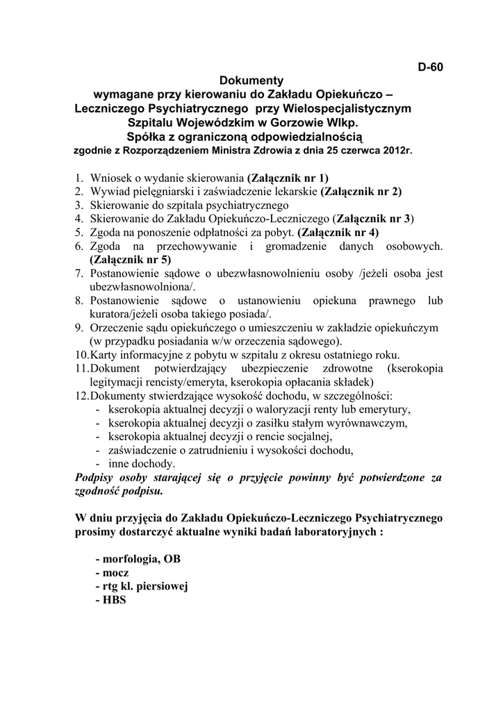 D-60 Dokumenty wymagane przy kierowaniu do Zakładu Opiekuńczo – Leczniczego Psychiatrycznego przy Wielospecjalistycznym Szpitalu Wojewódzkim w Gorzowie Wlkp. Spółka z ograniczoną odpowiedzialnością zgodnie z Rozporządzeniem Ministra Zdrowia z dnia 25 czerwca 2012r. 1. 2. 3. 4. 5. 6. Wniosek o wydanie skierowania (Załącznik nr 1) Wywiad pielęgniarski i zaświadczenie lekarskie (Załącznik nr 2) Skierowanie do szpitala psychiatrycznego Skierowanie do Zakładu Opiekuńczo-Leczniczego (Załącznik nr 3) Zgoda na ponoszenie odpłatności za pobyt. (Załącznik nr 4) Zgoda na przechowywanie i gromadzenie danych osobowych. (Załącznik nr 5) 7. Postanowienie sądowe o ubezwłasnowolnieniu osoby /jeżeli osoba jest ubezwłasnowolniona/. 8. Postanowienie sądowe o ustanowieniu opiekuna prawnego lub kuratora/jeżeli osoba takiego posiada/. 9. Orzeczenie sądu opiekuńczego o umieszczeniu w zakładzie opiekuńczym (w przypadku posiadania w/w orzeczenia sądowego). 10.Karty informacyjne z pobytu w szpitalu z okresu ostatniego roku. 11.Dokument potwierdzający ubezpieczenie zdrowotne (kserokopia legitymacji rencisty/emeryta, kserokopia opłacania składek) 12.Dokumenty stwierdzające wysokość dochodu, w szczególności: - kserokopia aktualnej decyzji o waloryzacji renty lub emerytury, - kserokopia aktualnej decyzji o zasiłku stałym wyrównawczym, - kserokopia aktualnej decyzji o rencie socjalnej, - zaświadczenie o zatrudnieniu i wysokości dochodu, - inne dochody. Podpisy osoby starającej się o przyjęcie powinny być potwierdzone za zgodność podpisu. W dniu przyjęcia do Zakładu Opiekuńczo-Leczniczego Psychiatrycznego prosimy dostarczyć aktualne wyniki badań laboratoryjnych : - morfologia, OB - mocz - rtg kl. piersiowej - HBS Załączniki do rozporządzenia Ministra Zdrowia z dnia 25 czerwca 2012 r. (poz. ....) Załącznik nr 1 WNIOSEK O WYDANIE SKIEROWANIA DO ZAKŁADU OPIEKUŃCZOLECZNICZEGO/ZAKŁADU PIELĘGNACYJNO-OPIEKUŃCZEGO DANE ŚWIADCZENIOBIORCY: ................................................................................................................................................................ Imię i Nazwisko ................................................................................................................................................................ Adres zamieszkania ................................................................................................................................................................ numer PESEL, a w przypadku jego braku – numer dokumentu potwierdzającego tożsamość .................................................... Miejscowość, data .............................................................................................. Podpis świadczeniobiorcy ......................................................... pieczęć zakładu opieki zdrowotnej ............................................................. miejscowość, data, godzina SKIEROWANIE DO SZPITALA PSYCHIATRYCZNEGO ........................................................................................................................................................................ (nazwa i adres) Po osobistym zbadaniu w dniu dzisiejszym kieruję Pana/Panią..……………………………....................… ............………………………………………………………..ur.........................w ....................................... (imię ojca) miejsce zamieszkania ..................................................................................................................................... 1. Stan cywilny: 1) panna/kawaler 4) rozwiedziona(y) 2) zamężna/żonaty 5) brak danych 2. Zatrudnienie: 1) czynna(y) zawodowo 3) na utrzymaniu innych osób 5) utrzymuje się z innych źródeł 3. Wykształcenie: 1) podstawowe, 4) wyższe, 3) wdowa/wdowiec 2) emeryt(ka)/rencista(ka) 4) bezrobotna(y) 6) brak danych 2) zawodowe, 5) inne/niepełne, 3) średnie, 6) brak danych 4. Rodzaj i nr dokumentu stwierdzającego tożsamość osoby badanej lub inny dowód ................................ .....................................……………………………………………………................................................... 5. Osoba badana jest / nie jest ubezwłasnowolniona częściowo lub całkowicie (właściwe podkreślić) 6. Dane o osobach będących z mocy prawa uczestnikami postępowania sądowego (art. 46 ust. 1 ustawy): 1) małżonek............................................…………………………………….................………………… (imię, nazwisko, adres) 2) osoba sprawująca opiekę faktyczną ....................……………………………………..................……. (imię, nazwisko, adres) 3) przedstawiciel ustawowy .............................………………………………………….......................… (imię, nazwisko, adres) 7. Wywiad od osoby badanej .......................................................................................................................... .......................................................................................................................................................................... .......................................................................................................................................................................... .......................................................................................................................................................................... .......................................................................................................................................................................... .......................................................................................................................................................................... .................