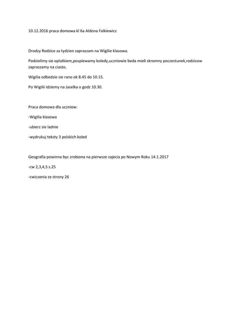 10.12.2016 praca domowa kl 6a Aldona Falkiewicz Drodzy Rodzice za tydzien zapraszam na Wigilie klasowa. Podzielimy sie oplatkiem,pospiewamy koledy,uczniowie beda mieli skromny poczestunek,rodzicow zapraszamy na ciasto. Wigilia odbedzie sie rano ok 8.45 do 10.15. Po Wigilii idziemy na Jaselka o godz 10.30. Praca domowa dla uczniow: -Wigilia klasowa -ubierz sie ladnie -wydrukuj teksty 3 polskich koled Geografia powinna byc zrobiona na pierwsze zajecia po Nowym Roku 14.1.2017 -cw 2,3,4,5 s.25 -cwiczenia ze strony 26
