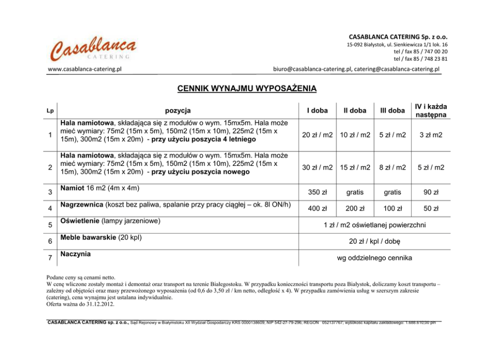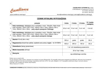 CASABLANCA CATERING Sp. z o.o. 15-092 Białystok, ul. Sienkiewicza 1/1 lok. 16 tel / fax 85 / 747 00 20 tel / fax 85 / 748 23 81 www.casablanca-catering.pl [email protected], [email protected] CENNIK WYNAJMU WYPOSAŻENIA pozycja Lp 1 2 3 4 5 6 7 Hala namiotowa, składająca się z modułów o wym. 15mx5m. Hala może mieć wymiary: 75m2 (15m x 5m), 150m2 (15m x 10m), 225m2 (15m x 15m), 300m2 (15m x 20m) - przy użyciu poszycia 4 letniego Hala namiotowa, składająca się z modułów o wym. 15mx5m. Hala może mieć wymiary: 75m2 (15m x 5m), 150m2 (15m x 10m), 225m2 (15m x 15m), 300m2 (15m x 20m) - przy użyciu poszycia nowego Namiot 16 m2 (4m x 4m) Nagrzewnica (koszt bez paliwa, spalanie przy pracy ciągłej – ok. 8l ON/h) Oświetlenie (lampy jarzeniowe) Meble bawarskie (20 kpl) Naczynia I doba II doba III doba IV i każda następna 20 zł / m2 10 zł / m2 5 zł / m2 3 zł m2 30 zł / m2 15 zł / m2 8 zł / m2 5 zł / m2 350 zł gratis gratis 90 zł 400 zł 200 zł 100 zł 50 zł 1 zł / m2 oświetlanej powierzchni 20 zł / kpl / dobę wg oddzielnego cennika Podane ceny są cenami netto. W cenę wliczone zostały montaż i demontaż oraz transport na terenie Białegostoku. W przypadku konieczności transportu poza Białystok, doliczamy koszt transportu – zależny od objętości oraz masy przewożonego wyposażenia (od 0,6 do 3,50 zł / km netto, odległość x 4). W przypadku zamówienia usług w szerszym zakresie (catering), cena wynajmu jest ustalana indywidualnie. Oferta ważna do 31.12.2012. CASABLANCA CATERING sp. z o.o., Sąd Rejonowy w Białymstoku XII Wydział Gospodarczy KRS 0000138609; NIP 542-27-79-296; REGON 052137767; wysokość kapitału zakładowego: 1.688.610,00 pln