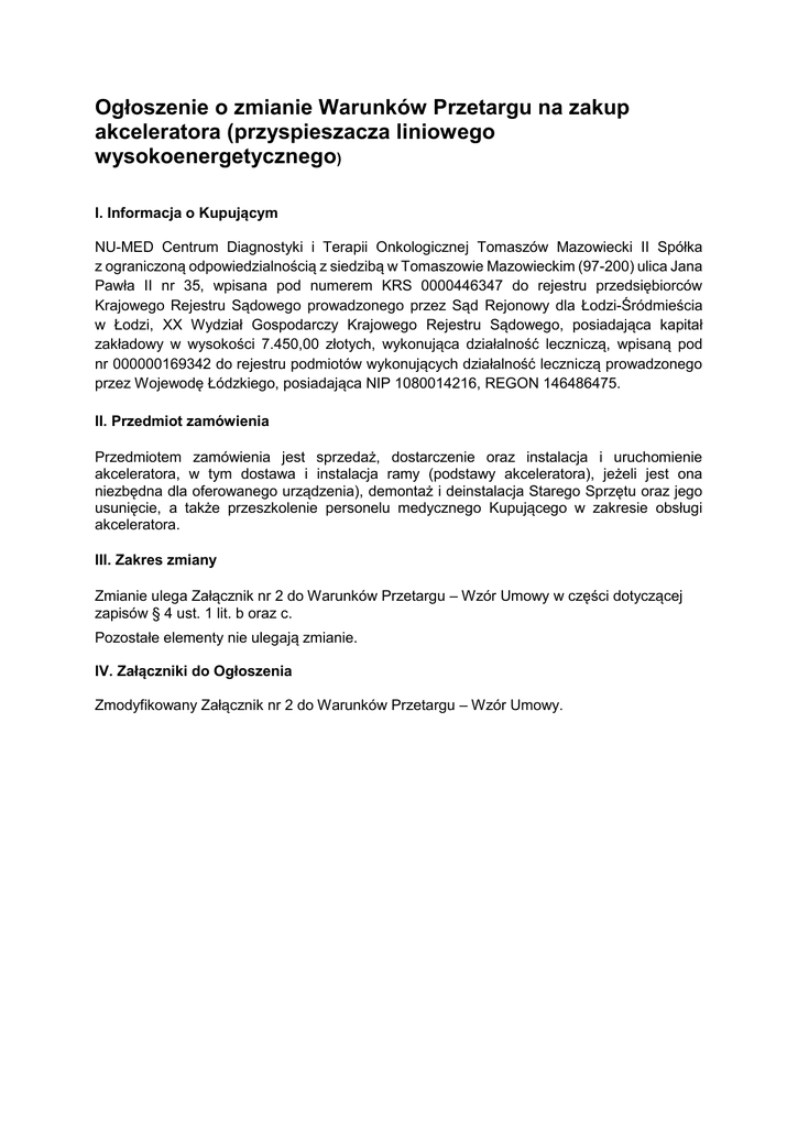 Ogłoszenie o zmianie Warunków Przetargu na zakup akceleratora (przyspieszacza liniowego wysokoenergetycznego) I. Informacja o Kupującym NU-MED Centrum Diagnostyki i Terapii Onkologicznej Tomaszów Mazowiecki II Spółka z ograniczoną odpowiedzialnością z siedzibą w Tomaszowie Mazowieckim (97-200) ulica Jana Pawła II nr 35, wpisana pod numerem KRS 0000446347 do rejestru przedsiębiorców Krajowego Rejestru Sądowego prowadzonego przez Sąd Rejonowy dla Łodzi-Śródmieścia w Łodzi, XX Wydział Gospodarczy Krajowego Rejestru Sądowego, posiadająca kapitał zakładowy w wysokości 7.450,00 złotych, wykonująca działalność leczniczą, wpisaną pod nr 000000169342 do rejestru podmiotów wykonujących działalność leczniczą prowadzonego przez Wojewodę Łódzkiego, posiadająca NIP 1080014216, REGON 146486475. II. Przedmiot zamówienia Przedmiotem zamówienia jest sprzedaż, dostarczenie oraz instalacja i uruchomienie akceleratora, w tym dostawa i instalacja ramy (podstawy akceleratora), jeżeli jest ona niezbędna dla oferowanego urządzenia), demontaż i deinstalacja Starego Sprzętu oraz jego usunięcie, a także przeszkolenie personelu medycznego Kupującego w zakresie obsługi akceleratora. III. Zakres zmiany Zmianie ulega Załącznik nr 2 do Warunków Przetargu – Wzór Umowy w części dotyczącej zapisów § 4 ust. 1 lit. b oraz c. Pozostałe elementy nie ulegają zmianie. IV. Załączniki do Ogłoszenia Zmodyfikowany Załącznik nr 2 do Warunków Przetargu – Wzór Umowy.