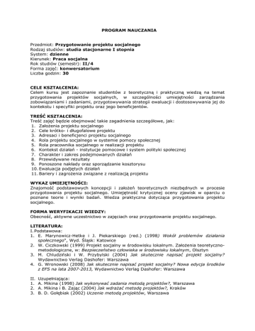 PROGRAM NAUCZANIA Przedmiot: Przygotowanie projektu socjalnego Rodzaj studiów: studia stacjonarne I stopnia System: dzienne Kierunek: Praca socjalna Rok studiów (semestr): II/4 Forma zajęć: konwersatorium Liczba godzin: 30 CELE KSZTAŁCENIA: Celem kursu jest zapoznanie studentów z teoretyczną i praktyczną wiedzą na temat przygotowania projektów socjalnych, w szczególności umiejętności zarządzania zobowiązaniami i zadaniami, przygotowywania strategii ewaluacji i dostosowywania jej do kontekstu i specyfiki projektu oraz jego beneficjentów. TREŚĆ KSZTAŁCENIA: Treść zajęć będzie obejmować takie zagadnienia szczegółowe, jak: 1. Założenia projektu socjalnego 2. Cele krótko- i długofalowe projektu 3. Adresaci i beneficjenci projektu socjalnego 4. Rola projektu socjalnego w systemie pomocy społecznej 5. Rola pracownika socjalnego w realizacji projektu 6. Kontekst działań - instytucje pomocowe i system polityki społecznej 7. Charakter i zakres podejmowanych działań 8. Przewidywane rezultaty 9. Ponoszone nakłady oraz sporządzanie kosztorysu 10. Ewaluacja podjętych działań 11. Bariery i zagrożenia związane z realizacją projektu WYKAZ UMIEJĘTNOŚCI: Znajomość podstawowych koncepcji i założeń teoretycznych niezbędnych w procesie przygotowania projektu socjalnego. Umiejętność krytycznej oceny zjawisk w oparciu o poznane teorie i wyniki badań. Wiedza praktyczna dotycząca przygotowania projektu socjalnego. FORMA WERYFIKACJI WIEDZY: Obecność, aktywne uczestnictwo w zajęciach oraz przygotowanie projektu socjalnego. LITERATURA: I. Podstawowa: 1. E. Marynowicz-Hetke i J. Piekarskiego (red.) (1998) Wokół problemów działania społecznego", Wyd. Śląsk: Katowice 2. W. Ciczkowski (1999) Projekt socjalny w środowisku lokalnym. Założenia teoretycznometodologiczne, w: Bezpieczeństwo człowieka w środowisku lokalnym, Olsztyn 3. M. Chludziński i W. Przybylski (2004) Jak skutecznie napisać projekt socjalny? Wydawnictwo Verlag Dashofer: Warszawa 4. G. Wronowski (2008) Jak skutecznie napisać projekt socjalny? Nowa edycja środków z EFS na lata 2007-2013, Wydawnictwo Verlag Dashofer: Warszawa II. 1. 2. 3. Uzupełniająca: A. Mikina (1998) Jak wykonywać zadania metodą projektów?, Warszawa A. Mikina i B. Zając (2004) Jak wdrażać metodę projektów?, Kraków B. D. Gołębiak (2002) Uczenie metodą projektów, Warszawa