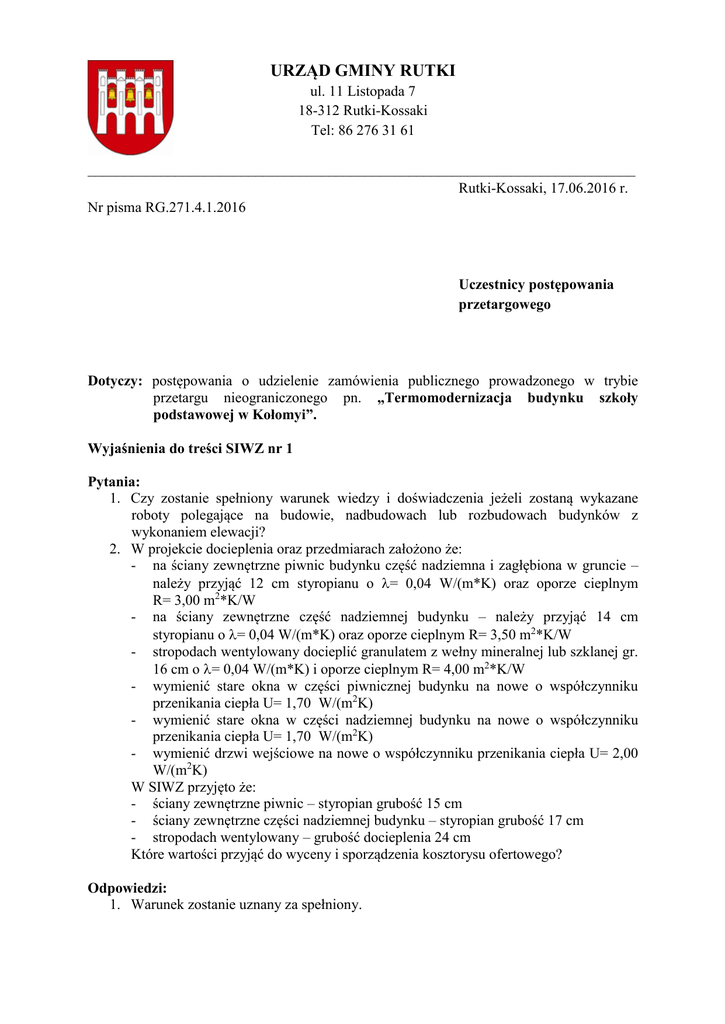 URZĄD GMINY RUTKI ul. 11 Listopada 7 18-312 Rutki-Kossaki Tel: 86 276 31 61 ___________________________________________________________________________ Rutki-Kossaki, 17.06.2016 r. Nr pisma RG.271.4.1.2016 Uczestnicy postępowania przetargowego Dotyczy: postępowania o udzielenie zamówienia publicznego prowadzonego w trybie przetargu nieograniczonego pn. „Termomodernizacja budynku szkoły podstawowej w Kołomyi”. Wyjaśnienia do treści SIWZ nr 1 Pytania: 1. Czy zostanie spełniony warunek wiedzy i doświadczenia jeżeli zostaną wykazane roboty polegające na budowie, nadbudowach lub rozbudowach budynków z wykonaniem elewacji? 2. W projekcie docieplenia oraz przedmiarach założono że: - na ściany zewnętrzne piwnic budynku część nadziemna i zagłębiona w gruncie – należy przyjąć 12 cm styropianu o = 0,04 W/(m*K) oraz oporze cieplnym R= 3,00 m2*K/W - na ściany zewnętrzne część nadziemnej budynku – należy przyjąć 14 cm styropianu o = 0,04 W/(m*K) oraz oporze cieplnym R= 3,50 m2*K/W - stropodach wentylowany docieplić granulatem z wełny mineralnej lub szklanej gr. 16 cm o = 0,04 W/(m*K) i oporze cieplnym R= 4,00 m2*K/W - wymienić stare okna w części piwnicznej budynku na nowe o współczynniku przenikania ciepła U= 1,70 W/(m2K) - wymienić stare okna w części nadziemnej budynku na nowe o współczynniku przenikania ciepła U= 1,70 W/(m2K) - wymienić drzwi wejściowe na nowe o współczynniku przenikania ciepła U= 2,00 W/(m2K) W SIWZ przyjęto że: - ściany zewnętrzne piwnic – styropian grubość 15 cm - ściany zewnętrzne części nadziemnej budynku – styropian grubość 17 cm - stropodach wentylowany – grubość docieplenia 24 cm Które wartości przyjąć do wyceny i sporządzenia kosztorysu ofertowego? Odpowiedzi: 1. Warunek zostanie uznany za spełniony. 2. Mając na uwadze, że w wyniku realizacji, w oparciu o środki finansowe z Unii Europejskiej, robót termomodernizacyjnych określonych w projekcie ma być efektywna oszczędność energii (w stosunku do kosztów). Do wykonania robót należy przyjąć zgodnie z wynikami audytu energetycznego następujące grubości materiałów ociepleniowych: - na ściany zewnętrzne piwnic budynku część nadziemna i zagłębiona w gruncie – należy przyjąć 15 cm styropianu o = 0,04 W/(m*K) oraz oporze cieplnym R= 3,75 m2*K/W - na ściany zewnętrzne część nadziemnej budynku – należy przyjąć 17 cm styropianu o = 0,04 W/(m*K) oraz oporze cieplnym R= 4,25 m2*K/W - stropodach wentylowany docieplić granulatem z wełny mineralnej lub szklanej gr. 24 cm o = 0,04 W/(m*K) i oporze cieplnym R= 6,00 m2*K/W - wymienić stare okna w części piwnicznej budynku na nowe o współczynniku przenikania ciepła U= 0,90 W/(m2K) - wymienić stare okna w części nadziemnej budynku na nowe o współczynniku przenikania ciepła U= 0,90 W/(m2K) - wymienić drzwi wejściowe na nowe o współczynniku przenikania ciepła U= 1,30 W/(m2K) WÓJT Teresa Grodzka