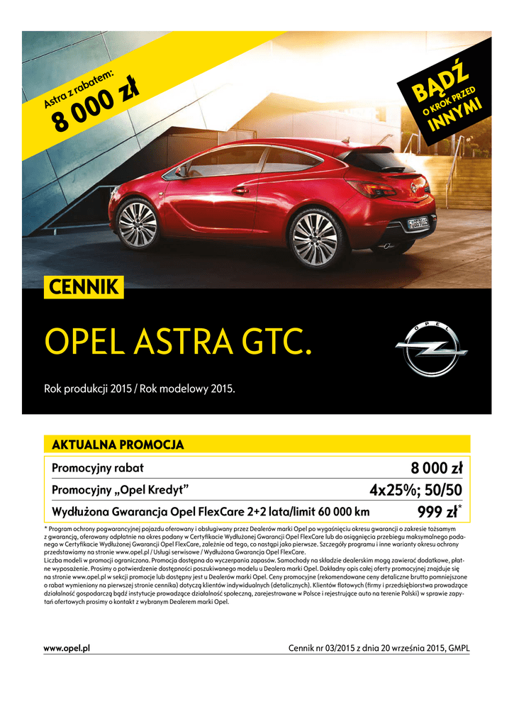 ra z Ast 8 : em t a rab 0 0 0 Ź D BĄ MI zł O ED PRZ K KRO INN Y CENNIK OPEL ASTRA GTC. Rok produkcji 2015 / Rok modelowy 2015. AKTUALNA PROMOCJA 8 000 zł Promocyjny „Opel Kredyt” 4x25%; 50/50 Wydłużona Gwarancja Opel FlexCare 2+2 lata/limit 60 000 km 999 zł* Promocyjny rabat * Program ochrony pogwarancyjnej pojazdu oferowany i obsługiwany przez Dealerów marki Opel po wygaśnięciu okresu gwarancji o zakresie tożsamym z gwarancją, oferowany odpłatnie na okres podany w Certyfikacie Wydłużonej Gwarancji Opel FlexCare lub do osiągnięcia przebiegu maksymalnego podanego w Certyfikacie Wydłużonej Gwarancji Opel FlexCare, zależnie od tego, co nastąpi jako pierwsze. Szczegóły programu i inne warianty okresu ochrony przedstawiamy na stronie www.opel.pl / Usługi serwisowe / Wydłużona Gwarancja Opel FlexCare. Liczba modeli w promocji ograniczona. Promocja dostępna do wyczerpania zapasów. Samochody na składzie dealerskim mogą zawierać dodatkowe, płatne wyposażenie. Prosimy o potwierdzenie dostępności poszukiwanego modelu u Dealera marki Opel. Dokładny opis całej oferty promocyjnej znajduje się na stronie www.opel.pl w sekcji promocje lub dostępny jest u Dealerów marki Opel. Ceny promocyjne (rekomendowane ceny detaliczne brutto pomniejszone o rabat wymieniony na pierwszej stronie cennika) dotyczą klientów indywidualnych (detalicznych). Klientów flotowych (firmy i przedsiębiorstwa prowadzące działalność gospodarczą bądź instytucje prowadzące działalność społeczną, zarejestrowane w Polsce i rejestrujące auto na terenie Polski) w sprawie zapytań ofertowych prosimy o kontakt z wybranym Dealerem marki Opel. www.opel.pl Cennik nr 03/2015 z dnia 20 września 2015, GMPL Cennik – Opel Astra GTC Rok produkcji 2015, rok modelowy 2015 Ceny promocyjne* Enjoy Sport BiTurbo 1.4 Turbo 120 KM** M6 72 550 78 400 – 1.4 Turbo 140 KM** M6 74 550 80 400 – A6 79 550 85 400 – M6 81 950 87 800 – 1.6 Turbo 170 KM A6 85 800 91 650 – 1.6 Turbo 200 KM Start/Stop M6 84 750 90 600 – 1.6 CDTI 110 KM Start/Stop M6 81 350 87 200 – 1.6 CDTI 136 KM Start/Stop M6 83 750 89 600 – 2.0 CDTI 165 KM Start/Stop M6 89 050 94 900 – A6 92 650 98 500 – M6 – – 111 300 1.4 Turbo 140 KM 1.6 Turbo 170 KM Start/Stop 1 2.0 CDTI 165 KM 2.0 CDTI BiTurbo 195 KM Start/Stop 1 * Liczba modeli w promocji ograniczona. Promocja dostępna do wyczerpania zapasów. Samochody na składzie dealerskim mogą zawierać dodatkowe, płatne wyposażenie. Prosimy o potwierdzenie dostępności poszukiwanego modelu u Dealera marki Opel. Dokładny opis całej oferty promocyjnej znajduje się na stronie www.opel.pl w sekcji promocje lub dostępny jest u Dealerów marki Opel. Ceny promocyjne (rekomendowane ceny detaliczne brutto pomniejszone o rabat wymieniony na pierwszej stronie cennika) dotyczą klientów indywidualnych (detalicznych). Klientów flotowych (firmy i przedsiębiorstwa prowadzące działalność gospodarczą bądź instytucje prowadzące działalność społeczną, zarejestrowane w Polsce i rejestrujące auto na terenie Polski) w sprawie zapytań ofertowych prosimy o kontakt z wybranym Dealerem marki Opel. Ceny katalogowe Enjoy Sport BiTurbo 1.4 Turbo 120 KM** M6 80 550 86 400 – 1.4 Turbo 140 KM** M6 82 550 88 400 – A6 87 550 93 400 – M6 89 950 95 800 – 1.6 Turbo 170 KM A6 93 800 99 650 – 1.6 Turbo 200 KM Start/Stop M6 92 750 98 600 – 1.6 CDTI 110 KM Start/Stop M6 89 350 95 200 1.6 CDTI 136 KM Start/Stop M6 91 750 97 600 2.0 CDTI 165 KM Start/Stop M6 97 050 102 900 – A6 100 650 106 500 – M6 – – 119 300 1.4 Turbo 140 KM 1.6 Turbo 170 KM Start/Stop 1 2.0 CDTI 165 KM 2.0 CDTI BiTurbo 195 KM Start/Stop 1 ** Silnik dostępny z systemem Start/Stop – dopłata 1 400 zł. 1 Silnik produkowany tylko do końca kwietnia 2015 r. p Cennik Opla Astry GTC, rok produkcji 2015, rok modelowy 2015A, nr 3/2015 z dnia 20 września 2015 1/4 Wyposażenie standardowe Tapicerka materiałowa Silvanus, czarna Felgi strukturalne 17", stalowe System monitorujący ciśnienie w oponach Klimatyzacja sterowana ręcznie Kierownica pokryta skórą z przyciskami sterowania Układ stabilizacji toru jazdy ESP z kontrolą trakcji TCS i ABS Obniżone zawieszenie sportowe Widoczna końcówka układu wydechowego (niedostępna z silnikami 1.4 Turbo 120 KM, 1.7 CDTI) Przednie i boczne poduszki powietrzne dla kierowcy i pasażera, kurtynowe poduszki dachowe System przypominania o zapięciu pasów na przednich siedzeniach Elektrycznie sterowane przednie szyby Elektrycznie sterowane i podgrzewane lusterka zewnętrzne w kolorze nadwozia Światła do jazdy dziennej (ze standardowymi żarówkami) Regulacja wysokości fotela kierowcy Tylne siedzenia dzielone w proporcji 40/60. Kieszenie z tyłu oparć foteli kierowcy i pasażera Kolumna kierownicy regulowana w pionie i poziomie Zaczepy Isofix w oparciach tylnych zewnętrznych siedzeń Radioodtwarzacz CD/MP3 400 z 6 głośnikami i złączem AUX-in Enjoy Sport BiTurbo S S S S S S S S S S S S S S ― ― S ― ― S S S S S S S S S ― ― S ― ― S ― ― S S S S S S S S S S S S S S S S S S S S S S S S 400 S 400 3 000 1 500/P ― 1 700/P 900/P ― S S S S S S S S ― ― S S P/S S S 500/P ― S S S S 1 600 S 1 600 P ― ― S ― 700 P S S ― ― S ― ― ― ― S S DWF T43 AKY AKO T3S UGE CE4 2 200 600/P 700/P 4500 600/P P 1 000/P 500/P 2 200 600/P 700/P 4 500 600/P P 1 000/P 500/P 2 200 600/P 700/P 4 500 600/P P 1 000/P 500/P A8Z 5 200/P 5 200/P 5 200/P RT8 RQ9/RQA/RTH RUA F45 4 600 6 200 350 3 500 1 600 3 200 350 3 500 1 600 3 200 ― 3 500 TAHL/TAHK ― 0 ― TADC ― 4 650 ― TAHI ― 5 650 ― TAHJ ― ― 6 000 TAHH PWT UJM C67 N34 + UC3 FX3 XJ2 E3C AYC UH0/UH1 AEF/AXG DWE T3N AH3 A64+EA1/E A2 N37 AHN UZZ/UNM/ UYN+UW6 U68 K33 Komputer pokładowy Tempomat z ogranicznikiem prędkości Tapicerka materiałowa Imola/Atlantis, czarna, z ergonomicznymi sportowymi fotelami przednimi TAJE (dostępna tylko z „Pakietami Foteli Ergonomicznych”) Felgi a