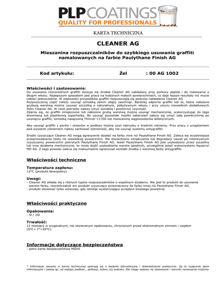 KARTA TECHNICZNA CLEANER AG Mieszanina rozpuszczalników do szybkiego usuwania graffiti namalowanych na farbie Paulythane Finish AG Kod artykułu: Żel : 00 AG 1002 Właściwości i zastosowanie: Do usuwania różnorodnych graffiti stosuje się środek Cleaner AG nakładany przy pomocy pędzla i do malowania o długim włosiu. Najlepszym sposobem jest praca na kolejnych małych powierzchniach, co daje lepsze rezultaty niż mycie całości jednocześnie. W większości przypadków graffiti rozpuszczają się podczas nakładania Cleaner AG Rozpuszczoną część należy usunąć szmatką zanim zdąży zaschnąć. Bardziej odporne graffiti lub te, które nałożono grubszą warstwą można usuwać szczotką o naturalnym, półsztywnym włosiu i przy użyciu niewielkich dodatkowych ilości Cleaner AG. W razie potrzeby należy umyć szmatkę i powtórzyć czynność. Zdarza się, że graffiti zmiękczone lub nałożone grubą warstwą można usunąć mechanicznie, wykorzystując do tego drewnianą lub plastikową szpachelkę. By usunąć pozostałe resztki zabarwień zaleca się umyć całą powierzchnię po usunięciu graffiti, szmatką nasączoną Thinner C1700 lub mieszaniną węglowodorów alifatycznych. Aby usunąć graffiti z porów i otworów w podłożu można użyć natrysku o średnim ciśnieniu. Przy pracy z urządzeniem pod wysokim ciśnieniem należy zachować ostrożność, aby nie usunąć systemu antygraffiti Środki czyszczące Cleaner AG mogą agresywnie działać na farby inne niż Paulythane Finish AG. Zaleca się wcześniejsze przeprowadzenie testu na niewielkiej powierzchni. Nie stwierdzono zmiękczenia lub degradacji nawet po intensywnym czyszczeniu powierzchni pokrytych Paulythane Finish AG. Jeżeli Paulythane Finish AG jest uszkodzony przez szczeliny lub inne działania mechaniczne, to może dojść uszkodzenia warstw spodnich, szczególnie jeżeli wykorzystano Aquacryl MO AG. Z tego powodu zaleca się maksymalnie ograniczać kontakt środka z warstwą farby antygraffiti. Właściwości techniczne Temperatura zapłonu: 12°C (produkt łatwopalny) Uwagi: - Cleaner AG składa się z różnych typów rozpuszczalników o wspólnym działaniu. Nie jest to produkt do usuwania warstw farby, rozcieńczalnik ani produkt czyszczący przeznaczony do farby innej niż Paulythane Finish AG. - produkt stosować tylko wówczas, gdy istnieje wystarczający przepływ świeżego powietrza Właściwości praktyczne Opakowania: - 5l / 25l Trwałość: 12 miesięcy w oryginalnym, nie otwieranym opakowaniu, chronionym przed ekstremalnym zimnem i ciepłem (5°C< t°<35°C). Informacje dotyczące bezpieczeństwa - patrz karta bezpieczeństwa MSDS * Informacje zawarte w karcie technicznej opierają się o badania laboratoryjne i doświadczenia praktyczne. Są to wyłącznie dane informacyjne i zależą np. od rodzaju podłoża , aplikacji, koloru czy połysku. Nie mając wpływu na stosowanie i warunki nanoszenia możemy KARTA TECHNICZNA brać odpowiedzialność wyłącznie za jakość wyrobu i gwarantować, że odpowiada on naszym normom. Nie bierzemy również odpowiedzialności za straty lub uszkodzenia powstałe w wyniku aplikacji wyrobów niezgodnie z zaleceniami lub niewłaściwego ich użycia.