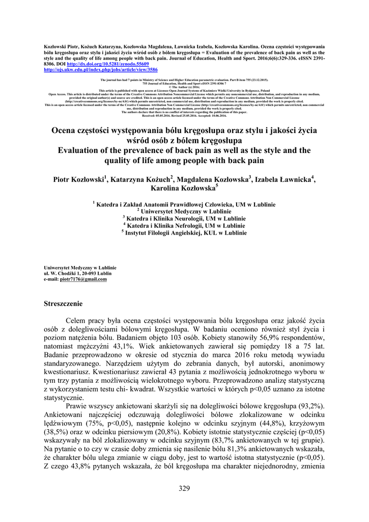 Kozłowski Piotr, Kożuch Katarzyna, Kozłowska Magdalena, Ławnicka Izabela, Kozłowska Karolina. Ocena częstości występowania bólu kręgosłupa oraz stylu i jakości życia wśród osób z bólem kręgosłupa = Evaluation of the prevalence of back pain as well as the style and the quality of life among people with back pain. Journal of Education, Health and Sport. 2016;6(6):329-336. eISSN 23918306. DOI http://dx.doi.org/10.5281/zenodo.55609 http://ojs.ukw.edu.pl/index.php/johs/article/view/3586 The journal has had 7 points in Ministry of Science and Higher Education parametric evaluation. Part B item 755 (23.12.2015). 755 Journal of Education, Health and Sport eISSN 2391-8306 7 © The Author (s) 2016; This article is published with open access at Licensee Open Journal Systems of Kazimierz Wielki University in Bydgoszcz, Poland Open Access. This article is distributed under the terms of the Creative Commons Attribution Noncommercial License which permits any noncommercial use, distribution, and reproduction in any medium, provided the original author(s) and source are credited. This is an open access article licensed under the terms of the Creative Commons Attribution Non Commercial License (http://creativecommons.org/licenses/by-nc/4.0/) which permits unrestricted, non commercial use, distribution and reproduction in any medium, provided the work is properly cited. This is an open access article licensed under the terms of the Creative Commons Attribution Non Commercial License (http://creativecommons.org/licenses/by-nc/4.0/) which permits unrestricted, non commercial use, distribution and reproduction in any medium, provided the work is properly cited. The authors declare that there is no conflict of interests regarding the publication of this paper. Received: 05.05.2016. Revised 25.05.2016. Accepted: 10.06.2016. Ocena częstości występowania bólu kręgosłupa oraz stylu i jakości życia wśród osób z bólem kręgosłupa Evaluation of the prevalence of back pain as well as the style and the quality of life among people with back pain Piotr Kozłowski1, Katarzyna Kożuch2, Magdalena Kozłowska3, Izabela Ławnicka4, Karolina Kozłowska5 1 Katedra i Zakład Anatomii Prawidłowej Człowieka, UM w Lublinie 2 Uniwersytet Medyczny w Lublinie 3 Katedra i Klinika Neurologii, UM w Lublinie 4 Katedra i Klinika Nefrologii, UM w Lublinie 5 Instytut Filologii Angielskiej, KUL w Lublinie Uniwersytet Medyczny w Lublinie ul. W. Chodźki 1, 20-093 Lublin e-mail: [email protected] Streszczenie Celem pracy była ocena częstości występowania bólu kręgosłupa oraz jakość życia osób z dolegliwościami bólowymi kręgosłupa. W badaniu oceniono również styl życia i poziom natężenia bólu. Badaniem objęto 103 osób. Kobiety stanowiły 56,9% respondentów, natomiast mężczyźni 43,1%. Wiek ankietowanych zawierał się pomiędzy 18 a 75 lat. Badanie przeprowadzono w okresie od stycznia do marca 2016 roku metodą wywiadu standaryzowanego. Narzędziem użytym do zebrania danych, był autorski, anonimowy kwestionariusz. Kwestionariusz zawierał 43 pytania z możliwością jednokrotnego wyboru w tym trzy pytania z możliwością wielokrotnego wyboru. Przeprowadzono analizę statystyczną z wykorzystaniem testu chi- kwadrat. Wszystkie wartości w których p<0,05 uznano za istotne statystycznie. Prawie wszyscy ankietowani skarżyli się na dolegliwości bólowe kręgosłupa (93,2%). Ankietowani najczęściej odczuwają dolegliwości bólowe zlokalizowane w odcinku lędźwiowym (75%, p<0,05), następnie kolejno w odcinku szyjnym (44,8%), krzyżowym (38,5%) oraz w odcinku piersiowym (20,8%). Kobiety istotnie statystycznie częściej (p<0,05) wskazywały na ból zlokalizowany w odcinku szyjnym (83,7% ankietowanych w tej grupie). Na pytanie o to czy w czasie doby zmienia się nasilenie bólu 81,3% ankietowanych wskazała, że charakter bólu ulega zmianie w ciągu doby, jest to wartość istotna statystycznie (p<0,05). Z czego 43,8% pytanych wskazała, że ból kręgosłupa ma charakter niejednorodny, zmienia 329 się różnie w ciągu doby. Z powodu bólu kręgosłupa z pomocy Poradni Specjalistycznej korzysta 43,8% ankietowanych. Większość respondentów w tej grupie przyjmowała niesteroidowe środki przeciwbólowe (58,2%) oraz doustne lub dożylne leki steroidowe (37,2%). Słowa kluczowe: ból kręgosłupa, ból pleców, zmiany zwyrodnieniowe kręgosłupa, dyskopatia, styl życia. Abstract The aim of this study was to evaluate the prevalence of back pain in relation to the quality of life of people suffering from this kind of pain. The study also focused on the significance of the correlation between the lifestyle and level of pain intensity. There were 103 respondents involved in the study. The age of the respondents was between 18 and 75 years. The study was conducted in the period from January to March 2016 and it employed the standardized interview method. The tool used for data collection was an anonymous questionnaire produced specifically for this study. The questionnaire consisted of 43 single choice questions and three multiple questions. Statistical analysis was performed using chisquare test. All values for which p <0.05 were considered statistically significant. Almost all respondents complained of back pain (93.2%). The respondents most often felt pain in the lumbar section (75%, p <0.05). The respondents also claimed to suffer from pain in the cervical (44.8%), sacral (38.5%) and the thoracic sections (20.8%). Women significantly more often (p <0.05) indicated pain located in the cervical section (83.7% of respondents in this group). To the question of whether during the day the severity of pain changed, 81.3% of the respondents gave an answer that the nature of pain changed throughout the day (a statistically significant value, p <0.05). Additionally, 43.8% of those respondents indicated that the pain is of a heterogeneous nautre. Due to back pain, 43.8% of the respondents a