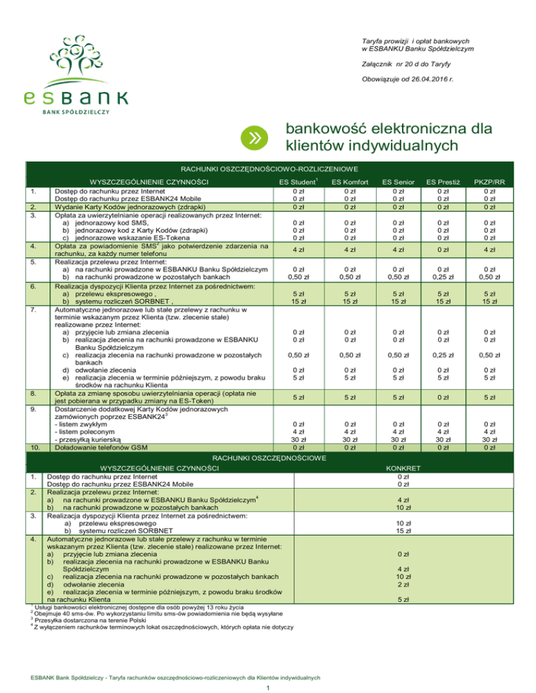 Taryfa prowizji i opłat bankowych w ESBANKU Banku Spółdzielczym Załącznik nr 20 d do Taryfy Obowiązuje od 26.04.2016 r. bankowość elektroniczna dla klientów indywidualnych RACHUNKI OSZCZĘDNOŚCIOWO-ROZLICZENIOWE 1. 2. 3. 4. 5. 6. 7. 8. 9. 10. WYSZCZEGÓLNIENIE CZYNNOŚCI Dostęp do rachunku przez Internet Dostęp do rachunku przez ESBANK24 Mobile Wydanie Karty Kodów jednorazowych (zdrapki) Opłata za uwierzytelnianie operacji realizowanych przez Internet: a) jednorazowy kod SMS, b) jednorazowy kod z Karty Kodów (zdrapki) c) jednorazowe wskazanie ES-Tokena 2 Opłata za powiadomienie SMS jako potwierdzenie zdarzenia na rachunku, za każdy numer telefonu Realizacja przelewu przez Internet: a) na rachunki prowadzone w ESBANKU Banku Spółdzielczym b) na rachunki prowadzone w pozostałych bankach Realizacja dyspozycji Klienta przez Internet za pośrednictwem: a) przelewu ekspresowego , b) systemu rozliczeń SORBNET , Automatyczne jednorazowe lub stałe przelewy z rachunku w terminie wskazanym przez Klienta (tzw. zlecenie stałe) realizowane przez Internet: a) przyjęcie lub zmiana zlecenia b) realizacja zlecenia na rachunki prowadzone w ESBANKU Banku Spółdzielczym c) realizacja zlecenia na rachunki prowadzone w pozostałych bankach d) odwołanie zlecenia e) realizacja zlecenia w terminie późniejszym, z powodu braku środków na rachunku Klienta Opłata za zmianę sposobu uwierzytelniania operacji (opłata nie jest pobierana w przypadku zmiany na ES-Token) Dostarczenie dodatkowej Karty Kodów jednorazowych 3 zamówionych poprzez ESBANK24 - listem zwykłym - listem poleconym - przesyłką kurierską Doładowanie telefonów GSM 1 ES Student 0 zł 0 zł 0 zł ES Komfort 0 zł 0 zł 0 zł ES Senior 0 zł 0 zł 0 zł ES Prestiż 0 zł 0 zł 0 zł PKZP/RR 0 zł 0 zł 0 zł 0 zł 0 zł 0 zł 0 zł 0 zł 0 zł 0 zł 0 zł 0 zł 0 zł 0 zł 0 zł 0 zł 0 zł 0 zł 4 zł 4 zł 4 zł 0 zł 4 zł 0 zł 0,50 zł 0 zł 0,50 zł 0 zł 0,50 zł 0 zł 0,25 zł 0 zł 0,50 zł 5 zł 15 zł 5 zł 15 zł 5 zł 15 zł 5 zł 15 zł 5 zł 15 zł 0 zł 0 zł 0 zł 0 zł 0 zł 0 zł 0 zł 0 zł 0 zł 0 zł 0,50 zł 0,50 zł 0,50 zł 0,25 zł 0,50 zł 0 zł 5 zł 0 zł 5 zł 0 zł 5 zł 0 zł 5 zł 0 zł 5 zł 5 zł 5 zł 5 zł 0 zł 5 zł 0 zł 4 zł 30 zł 0 zł 0 zł 4 zł 30 zł 0 zł 0 zł 4 zł 30 zł 0 zł 0 zł 4 zł 30 zł 0 zł 0 zł 4 zł 30 zł 0 zł RACHUNKI OSZCZĘDNOŚCIOWE 1. 2. 3. 4. WYSZCZEGÓLNIENIE CZYNNOŚCI Dostęp do rachunku przez Internet Dostęp do rachunku przez ESBANK24 Mobile Realizacja przelewu przez Internet: 4 a) na rachunki prowadzone w ESBANKU Banku Spółdzielczym b) na rachunki prowadzone w pozostałych bankach Realizacja dyspozycji Klienta przez Internet za pośrednictwem: a) przelewu ekspresowego b) systemu rozliczeń SORBNET Automatyczne jednorazowe lub stałe przelewy z rachunku w terminie wskazanym przez Klienta (tzw. zlecenie stałe) realizowane przez Internet: a) przyjęcie lub zmiana zlecenia b) realizacja zlecenia na rachunki prowadzone w ESBANKU Banku Spółdzielczym c) realizacja zlecenia na rachunki prowadzone w pozostałych bankach d) odwołanie zlecenia e) realizacja zlecenia w terminie późniejszym, z powodu braku środków na rachunku Klienta 1 Usługi bankowości elektronicznej dostępne dla osób powyżej 13 roku życia 2 Obejmuje 40 sms-ów. Po wykorzystaniu limitu sms-ów powiadomienia nie będą wysyłane 3 Przesyłka dostarczona na terenie Polski 4 Z wyłączeniem rachunków terminowych lokat oszczędnościowych, których opłata nie dotyczy ESBANK Bank Spółdzielczy - Taryfa rachunków oszczędnościowo-rozliczeniowych dla Klientów indywidualnych 1 KONKRET 0 zł 0 zł 4 zł 10 zł 10 zł 15 zł 0 zł 4 zł 10 zł 2 zł 5 zł