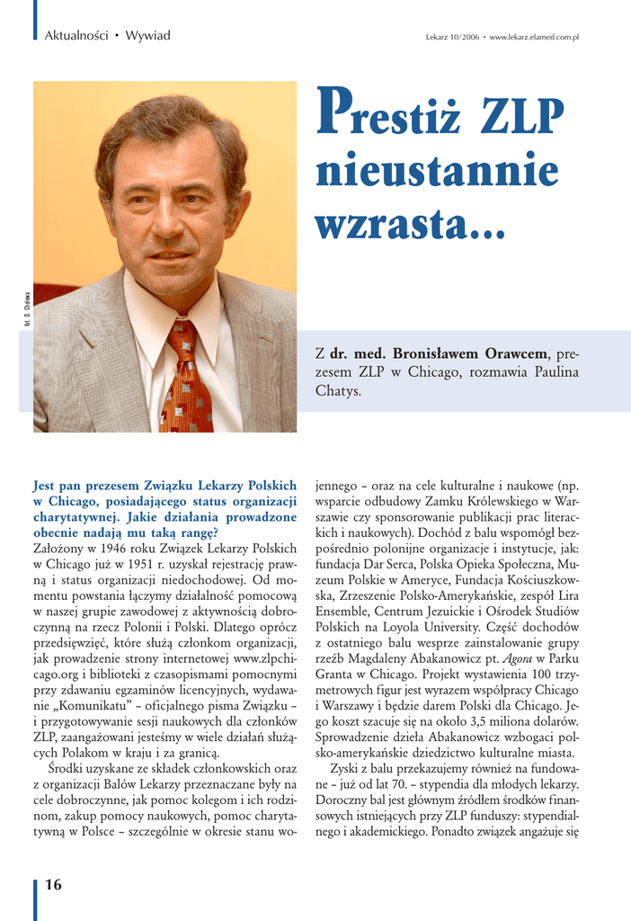 Aktualności • Wywiad Lekarz 10/2006 • www.lekarz.elamed.com.pl Prestiż ZLP fot. D. Cholewa nieustannie wzrasta... Z dr. med. Bronisławem Orawcem, prezesem ZLP w Chicago, rozmawia Paulina Chatys. Jest pan prezesem Związku Lekarzy Polskich w Chicago, posiadającego status organizacji charytatywnej. Jakie działania prowadzone obecnie nadają mu taką rangę? Założony w 1946 roku Związek Lekarzy Polskich w Chicago już w 1951 r. uzyskał rejestrację prawną i status organizacji niedochodowej. Od momentu powstania łączymy działalność pomocową w naszej grupie zawodowej z aktywnością dobroczynną na rzecz Polonii i Polski. Dlatego oprócz przedsięwzięć, które służą członkom organizacji, jak prowadzenie strony internetowej www.zlpchicago.org i biblioteki z czasopismami pomocnymi przy zdawaniu egzaminów licencyjnych, wydawanie „Komunikatu” – oficjalnego pisma Związku – i przygotowywanie sesji naukowych dla członków ZLP, zaangażowani jesteśmy w wiele działań służących Polakom w kraju i za granicą. Środki uzyskane ze składek członkowskich oraz z organizacji Balów Lekarzy przeznaczane były na cele dobroczynne, jak pomoc kolegom i ich rodzinom, zakup pomocy naukowych, pomoc charytatywną w Polsce – szczególnie w okresie stanu wo- 16 jennego – oraz na cele kulturalne i naukowe (np. wsparcie odbudowy Zamku Królewskiego w Warszawie czy sponsorowanie publikacji prac literackich i naukowych). Dochód z balu wspomógł bezpośrednio polonijne organizacje i instytucje, jak: fundacja Dar Serca, Polska Opieka Społeczna, Muzeum Polskie w Ameryce, Fundacja Kościuszkowska, Zrzeszenie Polsko-Amerykańskie, zespół Lira Ensemble, Centrum Jezuickie i Ośrodek Studiów Polskich na Loyola University. Część dochodów z ostatniego balu wesprze zainstalowanie grupy rzeźb Magdaleny Abakanowicz pt. Agora w Parku Granta w Chicago. Projekt wystawienia 100 trzymetrowych figur jest wyrazem współpracy Chicago i Warszawy i będzie darem Polski dla Chicago. Jego koszt szacuje się na około 3,5 miliona dolarów. Sprowadzenie dzieła Abakanowicz wzbogaci polsko-amerykańskie dziedzictwo kulturalne miasta. Zyski z balu przekazujemy również na fundowane – już od lat 70. – stypendia dla młodych lekarzy. Doroczny bal jest głównym źródłem środków finansowych istniejących przy ZLP funduszy: stypendialnego i akademickiego. Ponadto związek angażuje się www.lekarz.elamed.com.pl • Lekarz 10/2006 w różnorakie akcje zdrowotne organizowane dla chicagowskiej Polonii, dzięki którym osoby bez ubezpieczenia bezpłatnie korzystają z badań. Związek uznawany jest za lidera miejscowych ugrupowań zawodowych i jedno z najważniejszych tego typu stowarzyszeń poza granicami Polski. Skąd taka popularność? ZLP skupia około 500 lekarzy polskiego pochodzenia praktykujących w metropolii chicagowskiej. Jest drugą najstarszą tego typu organizacją na świecie, a pierwszą pod względem liczebności. Na pewno przyczynia się do tego fakt, iż emigracja amerykańska – w tym medyczna – jest najliczniejsza na świecie, niemniej sądzę, że popularność nasza wiąże się z atrakcyjnymi i potrzebnymi formami działalności, przynoszącymi korzyści członkom ZLP, ich rodzinom oraz społeczności polonijnej i amerykańskiej. Należą do nich wspomniane Bale Lekarzy, zebrania związkowe z wykładami i prelekcjami na tematy medyczne oraz zagadnienia dotyczące różnorodnych form ubezpieczeń zdrowotnych, praktyk lekarskich i ochrony dóbr osobistych, pikniki związkowe, coroczne „opłatki”, udział w organizowanych w Chicago paradach trzeciomajowych, zawody sportowe organizowane w ramach Związku przez Klub Sportowy „Bronek” czy wreszcie udział w lokalnych oraz międzynarodowych konferencjach i sympozjach. ZLP jest organizacją elitarną, a jej prestiż nieustannie rośnie. Odgrywamy ważną rolę w ruchu polskiej emigracji medycznej. Jesteśmy członkiem znaczących organizacji, jak Chicago Medical Society, Kongres Polonii Amerykańskiej czy Federacja Polonijnych Organizacji Medycznych. Członkowie ZLP reprezentują liczne specjalizacje medyczne, a wielu zajmuje prestiżowe profesorskie stanowiska na tutejszych uniwersytetach. Poprzez naszą aktywność związkową staramy się jednoczyć i koordynować środowiska lekarzy, stomatologów i weterynarzy. Jeśli nasza organizacja jest popularna i liczna, to dlatego, że do nas warto należeć. W tym roku, w czasie 60. rocznicy istnienia związku, harmonogram jego działań jest bardzo napięty. Uroczyste obchody 60. jubileuszu ZLP odbyły się w Chicago w lutym 2006 r. Jednym z jego najważ- Aktualności • Wywiad niejszych elementów było zorganizowane w Muzeum Polskim w Ameryce dwudniowe sympozjum naukowe z udziałem reprezentantów świata medycznego z 7 stanów USA i kilku innych krajów. Pierwszy dzień sesji był przygotowany pod egidą Chicago Medical Society i odbył się w języku angielskim, w drugim dniu językiem wykładowym był polski. Kolejnym wydarzeniem był zorganizowany 11 lutego w hotelu Drake 56. Bal Lekarzy, którego gościem specjalnym był legendarny zespół Czerwone Gitary. Obchody 60-lecia Związku zamknęła uroczysta msza w kościele św. Trójcy w Chicago odprawiona w intencji polonijnej służby zdrowia. W nabożeństwie celebrowanym przez dwóch biskupów polskiego pochodzenia wzięło udział ok. 1500 osób. Wszystkie te przedsięwzięcia były potrzebne i ważne. Za równie istotne dla scalania organizacji uznaję imprezy towarzyszące – zawody sportowe czy spotkania towarzyskie. Jeśli popatrzymy na to wydarzenie pod względem spuścizny historycznej, istotny będzie fakt wydania specjalnej publikacji pt. „Sześćdziesięciolecie Związku Lekarzy Polskich w Chicago” podsumowującej działalność ZLP. ZLP co roku organizuje wiele akcji zdrowotnych. Czy budzą one społeczne zainteresowanie? Związek jest od dawna zaangażowany w akcje zdrowotne dla chicagowsk