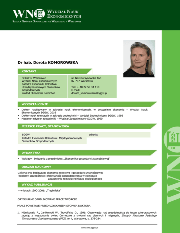 Dr hab. Dorota KOMOROWSKA KONTAKT SGGW w Warszawie Wydział Nauk Ekonomicznych Katedra Ekonomiki Rolnictwa i Międzynarodowych Stosunków Gospodarczych Zakład Ekonomiki Rolnictwa ul. Nowoursynowska 166 02-787 Warszawa Tel: + 48 22 59 34 110 E-mail: [email protected] WYKSZTAŁCENIE • Doktor habilitowany w zakresie nauk ekonomicznych, w dyscyplinie ekonomia – Wydział Nauk Ekonomicznych SGGW, 2016 • Doktor nauk rolniczych w zakresie zootechniki – Wydział Zootechniczny SGGW, 1995 • Magister inżynier zootechniki – Wydział Zootechniczny SGGW, 1990 MIEJSCE PRACY, STANOWISKA SGGW Katedra Ekonomiki Rolnictwa i Międzynarodowych Stosunków Gospodarczych adiunkt DYDAKTYKA • Wykłady i ćwiczenia z przedmiotu: „Ekonomika gospodarki żywnościowej” OBSZAR NAUKOWY Główna linia badawcza: ekonomia rolnictwa i gospodarki żywnościowej Problemy szczegółowe: efektywność gospodarowania w rolnictwie zagadnienia rozwoju rolnictwa ekologicznego WYKAZ PUBLIKACJI – w latach 1990-2001: „Trzybińska” ORYGINALNE OPUBLIKOWANE PRACE TWÓRCZE PRACE POWSTAŁE PRZED UZYSKANIEM STOPNIA DOKTORA 1. Niżnikowski R., Janikowski W., Trzybińska D., 1991: Obserwacja nad przydatnością do tuczu czterorasowych jagniąt z krzyżowania owiec Corriedale z trykami ras plennych i mięsnych, Zeszyty Naukowe Polskiego Towarzystwa Zootechnicznego (PTZ), nr 4, Warszawa, s. 276-284. www.wne.sggw.pl 2. Niżnikowski R., Janikowski W., Rant W., Trzybińska D., 1992: Przydatność do tuczu półintensywnego i wartość rzeźna jagniąt z krzyżowania towarowego owiec typu Corriedale z trykami ras plennych i mięsnych, Roczniki Naukowe Zootechniki, nr 31, Warszawa, s. 71-90. 3. Niżnikowski R., Janikowski W., Rant W., Trzybińska D., Nowak W., 1992: Przydatność do tuczu i wartość rzeźna jagniąt z krzyżowania towarowego owiec typu Corriedale z trykami ras mięsnych: Ile de France i Suffolk, Roczniki Naukowe Zootechniki, nr 31, Warszawa, s. 91-105. 4. Niżnikowski R., Janikowski W., Trzybińska D., 1993: Przydatność do tuczu i użytkowość wełnista jagniąt F1 uzyskanych po trykach ras plennych od maciorek typu Corriedale, Prace i Materiały Zootechniczne, nr 44, IGiHZ PAN, Jastrzębiec, s. 101-106. 5. Niżnikowski R., Rant W., Nowak W., Trzybińska D., 1994: Ocena wzrostu i użytkowości mięsnej tróji czterorasowych mieszańców owiec typu Corriedale z trykami plennymi i rasy Dorset Horn, Zeszyty Naukowe PTZ, nr 13, Warszawa, s. 187-195. 6. Trzybińska D., 1994: Wpływ krzyżowania maciorek typu Corriedale z trykami ras mięsnych na wybrane cechy użytkowości ich potomstwa, Zeszyty Naukowe PTZ, nr 13, Warszawa, s. 89-94. PRACE POWSTAŁE PO UZYSKANIU STOPNIA DOKTORA 7. Niżnikowski R., Trzybińska D., Rant W., 1995: Charakterystyka wzrostu oraz wstępna przyżyciowa i poubojowa ocena umięśnienia jagniąt typu Corriedale i ich mieszańców z owcą Żelaźnieńską, Zeszyty Naukowe PTZ, nr 22, Warszawa, s. 7-16. 8. Trzybińska D., 1997: The effect of the year of experiment, sex and type of lambs on the growth rate and meat quality of lambs, Annals of Warsaw Agricultural University: Animal Science, no 33, Warsaw Agricultural University, p. 99-103. 9. Trzybińska D., 1997: The evaluation of usefulness of ultrasonic measurements in examining the slaughter value of lambs, Annals of Warsaw Agricultural University: Animal Science, no 33, Warsaw Agricultural University, p. 105-109. 10. Trzybińska D, 1997: Ekonomiczne uwarunkowania produkcji owczarskiej w Polsce, Przegląd Hodowlany, nr 11/97, PTZ, Warszawa, s. 16-18. 11. Trzybińska D., 1998: Uwarunkowania produkcji owczarskiej, Przegląd Hodowlany, nr 6/98, PTZ, Warszawa, s. 18-20. 12. Trzybińska D, 1998: Charakterystyka rynku mięsa w Polsce, Przegląd Hodowlany, nr 12/98, PTZ, Warszawa, s. 1-3. 13. Ruszkowski F., Trzybińska D., 1998: Zróżnicowanie produkcji rolnej w gospodarstwach w latach 1996-1997, Powszechny Spis Rolny 1996, GUS, Warszawa (współautorstwo monografii). 14. Trzybińska D., 1999: Indywidualne gospodarstwa rolne w Polsce w świetle danych liczbowych GUS, Przegląd Hodowlany, nr 2/99, PTZ, Warszawa, s. 1-3. 15. Trzybińska D., 1999: Poszczególne kierunki produkcji zwierzęcej w świetle danych liczbowych GUS, Przegląd Hodowlany, nr 3/99, PTZ, Warszawa, s. 3-4. 16. Trzybińska D., 2000: Rynek baraniny, [w:] Strategiczne opcje dla Polskiego Sektora Agrobiznesu w świetle analiz ekonomicznych, E. Majewski, G. Dalton (red.), SGGW, Warszawa, s. 552-563. 17. Trzybińska D., 2000: Sheepmeat market in Poland, [w:] The strategic options for the Polish Agro-Food Sector in the light of economic analyses, E. Majewski, G. Dalton (ed.), Warsaw Agricultural University, p. 535-546. 18. Trzybińska D., 2000: Charakterystyka produkcji owczarskiej w Polsce, Przegląd Hodowlany, nr 11/2000, PTZ, Warszawa, s. 14-16. 19. Trzybińska D., 2001: Ekonomika produkcji żywca baraniego w Polsce, Przegląd Hodowlany, nr 3/2001, PTZ, Warszawa, s. 18-21. 20. Horbańczuk J., Celeda T., Wójcik A., Trzybińska D., Zięba G., 2001: Koszty fermowego utrzymania i produkcji piskląt strusi afrykańskich zależnie od podgatunku, Zeszyty Naukowe PTZ, nr 57, Warszawa, s. 307-313. www.wne.sggw.pl 21. Komorowska D., 2001: Mleczarstwo w Polsce na tle krajów Unii Europejskiej, Przegląd Hodowlany, nr 12/2001, PTZ, Warszawa, s. 1-4. 22. Komorowska D., 2002: Sytuacja ekonomiczna w produkcji żywca wieprzowego w Polsce, Przegląd Hodowlany, nr 9/2002, PTZ, Warszawa, s. 17-18. 23. Komorowska D., Majewski J., 2002: Produkcja mleka w Polsce w porównaniu do krajów Unii Europejskiej, [w:] Problemy Rolnictwa Światowego, S. Stańko (red.), tom IX, SGGW, Warszawa, s. 123-133. 24. Komorowska D., 2002: Ekonomika produkcji owczarskiej w Polsce, Roczniki Naukowe Stowarzyszenia Ekonomistów Rolnictwa i Agrobiznesu (SERiA), tom IV, zeszyt 4, Wyd. Wieś Jutra, Warszawa, s. 85-89. 25. Komorowska D., 2003: Tendencje zmian w produkcji owczarskiej na świecie, [w:] Problemy Rolnictwa Świ