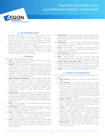 Regulamin korzystania z usług za pośrednictwem aplikacji Twój Rachunek § 1. POSTANOWIENIA OGÓLNE 9) Ubezpieczający – osoba fizyczna, osoba prawna lub jednostka organizacyjna nie posiadająca osobowości prawnej, której przepisy prawa przyznają zdolność prawną, która zawarła z Aegon umowę ubezpieczenia. 10) U bezpieczony – podmiot objęty ochroną ubezpieczeniową na podstawie umowy ubezpieczenia zawartej pomiędzy Ubezpieczającym, a Aegon. 11) L ogin – numer PESEL, a w przypadku osób nie posiadających nr PESEL numer dokumentu tożsamości albo unikatowy numer nadawany przez Towarzystwo. 12) K od aktywacyjny – jednorazowy ciąg znaków wymagany przy aktywacji lub resecie hasła. 13) H asło – ciąg o długości od 8 do 16 znaków, zawierający przynajmniej jedną wielką literę oraz dwie cyfry, który wraz z Loginem umożliwia Klientowi dostęp do aplikacji Twój Rachunek. 14) Centrum Relacji z Klientami (CRK) – centrum obsługi Klienta dostępne od poniedziałku do piątku od 8:00 do 20:00 pod numerem telefonu 801 300 900 oraz dla połączeń z zagranicy +48 22 592 10 00 lub pod adresem email: [email protected] 15) Umowa – umowa o świadczenie usług drogą elektroniczną. 1. S tosownie do postanowień art. 8 ust. 1 pkt 1 ustawy z 18 lipca 2002 roku o świadczeniu usług drogą elektroniczną (Dz. U. nr 144, poz. 1204, z późn. zm.) niniejszy regulamin (zwany dalej „Regulaminem”), określa warunki i zasady świadczenia przez Aegon, usług drogą elektroniczną w ramach serwisu udostępnionego pod adresem internetowym www.twojrachunek.pl 2. Przed rozpoczęciem korzystania z usług świadczonych drogą elektroniczną należy zapoznać się z Regulaminem, który jest udostępniony pod adresem www.twojrachunek.pl w formie, która umożliwia jego pozyskanie, odtwarzanie i utrwalanie za pomocą używanego systemu teleinformatycznego. § 2. DEFINICJE Wyrażenia użyte w Regulaminie oznaczają: 1) Aegon – Aegon Towarzystwo Ubezpieczeń na Życie S.A., Aegon Magyarország Általános Biztosító S.A. 2) Aegon TU – Aegon Towarzystwo Ubezpieczeń na Życie S.A. z siedzibą w Warszawie (02-675), przy ul. Wołoskiej 5, wpisane do rejestru przedsiębiorców przez Sąd Rejonowy dla m.st. Warszawy w Warszawie, XIII Wydział Gospodarczy Krajowego Rejestru Sądowego pod nr 12318, NIP 5272279881, posiadającej kapitał zakładowy: 347 467 550 zł – wpłacony w całości; działający na podstawie zezwolenia Ministra Finansów z dnia 24 grudnia 1999 roku, decyzja nr FI/1693a/AU/BK/99. 3) Aegon Ubezpieczenia Majątkowe – Aegon Magyarország Általános Biztosító S.A. – Oddział w Polsce, z siedzibą w Chorzowie, ul. Katowicka 47, wpisane do rejestru przedsiębiorców przez Sąd Rejonowy Katowice – Wschód w Katowicach, Wydział VIII Gospodarczy KRS pod numerem nr 387500, NIP 2050002752, będący oddziałem zagranicznego przedsiębiorcy spółki Aegon Magyarország Általános Biztosító Spółka Akcyjna z siedzibą w Budapeszcie. 4) Aegon Services – Aegon Services sp. z o.o. z siedzibą w Chorzowie (41-500), przy ul. Katowickiej 47 wpisana do rejestru przedsiębiorców prowadzonego przez Sąd Rejonowy Katowice – Wschód w Katowicach, VIII Wydział Gospodarczy Krajowego Rejestru Sądowego pod numerem 393210, NIP 272728440, posiadającej kapitał zakładowy: 8 000 000 zł. 5) Klient – Ubezpieczający lub /i Ubezpieczony posiadający Konto w aplikacji Twój Rachunek. 6) Twój Rachunek – aplikacja udostępniona przez Aegon , dostępna pod adresem internetowym www.twojrachunek.pl oferująca Klientom możliwość korzystania z Usług. 7) Konto – przypisane do konkretnego Klienta, konto użytkownika w ramach aplikacji Twój Rachunek zapewniające Klientowi możliwość korzystania z Usług, zgodnie z uprawnieniami wynikającymi z zawartej z Aegon umowy ubezpieczenia. 8) Usługi – zbiór funkcjonalności Twojego Rachunku umożliwiający Klientowi dokonanie określonych czynności związanych z zawartą umową ubezpieczenia, przy czym zakres dostępnych dla Klienta funkcji zależy od warunków zawartej umowy ubezpieczenia oraz uprawnień Klienta. § 3. ZAKRES USŁUG INFORMACYJNYCH Serwis Twój Rachunek obejmuje usługi dla produktów oferowanych przez: 1. Aegon TU: a) P olisy na Życie – tabela z listą aktualnych polis dotyczących Klienta. b) S aldo Subkonta – informacja przedstawiająca szczegóły dotyczące wybranej polisy, podzielonej na subkonta (jeśli subkonta występują w produkcie dla wybranej polisy), gdzie Klientowi prezentowany jest stan aktywów na wybranej polisie, w podziale na poszczególne Ubezpieczeniowe Fundusze Kapitałowe. W ramach usługi wskazane są informacje o nazwie funduszu, bieżącej cenie jednostki uczestnictwa, ilości jednostek zgromadzonych na rachunku polisy oraz wartość aktywów w poszczególnych funduszach. c) A lokacja Składki – usługa, przedstawiająca procentowy podział nowej składki pomiędzy fundusze (z listy dostępnych w danym produkcie), która umożliwia sprawdzenie aktualnej alokacji składki, historii dokonanych zleceń alokacji oraz złożenie zlecenia zmiany alokacji składki. d) Transfer – usługa umożliwiająca przeniesienie między funduszami części lub całości środków zgromadzonych na rachunku Ubezpieczającego poprzez umorzenie jednostek uczestnictwa jednego funduszu i nabycie jednostek uczestnictwa innego funduszu. Klient może wybrać zakładkę Historia Transferów, gdzie znajduje się informacja o dokonanych transferach środków albo Zlecenie Transferu, gdzie Klient ma możliwość zlecenia nowego transferu. e) Historia Zleceń – umożliwia Klientowi zapoznanie się z historią złożonych, dla wybranej polisy, zleceń transferów i alokacji, konwersji oraz wypłaty. 1/3 f) Historia rachunku – umożliwia Klientowi zapoznanie się z historią transakcji na rachunku polisy oraz historią wpłat składek, w wybranym okresie czasu. g) Zestawienie roczne – usługa pozwal